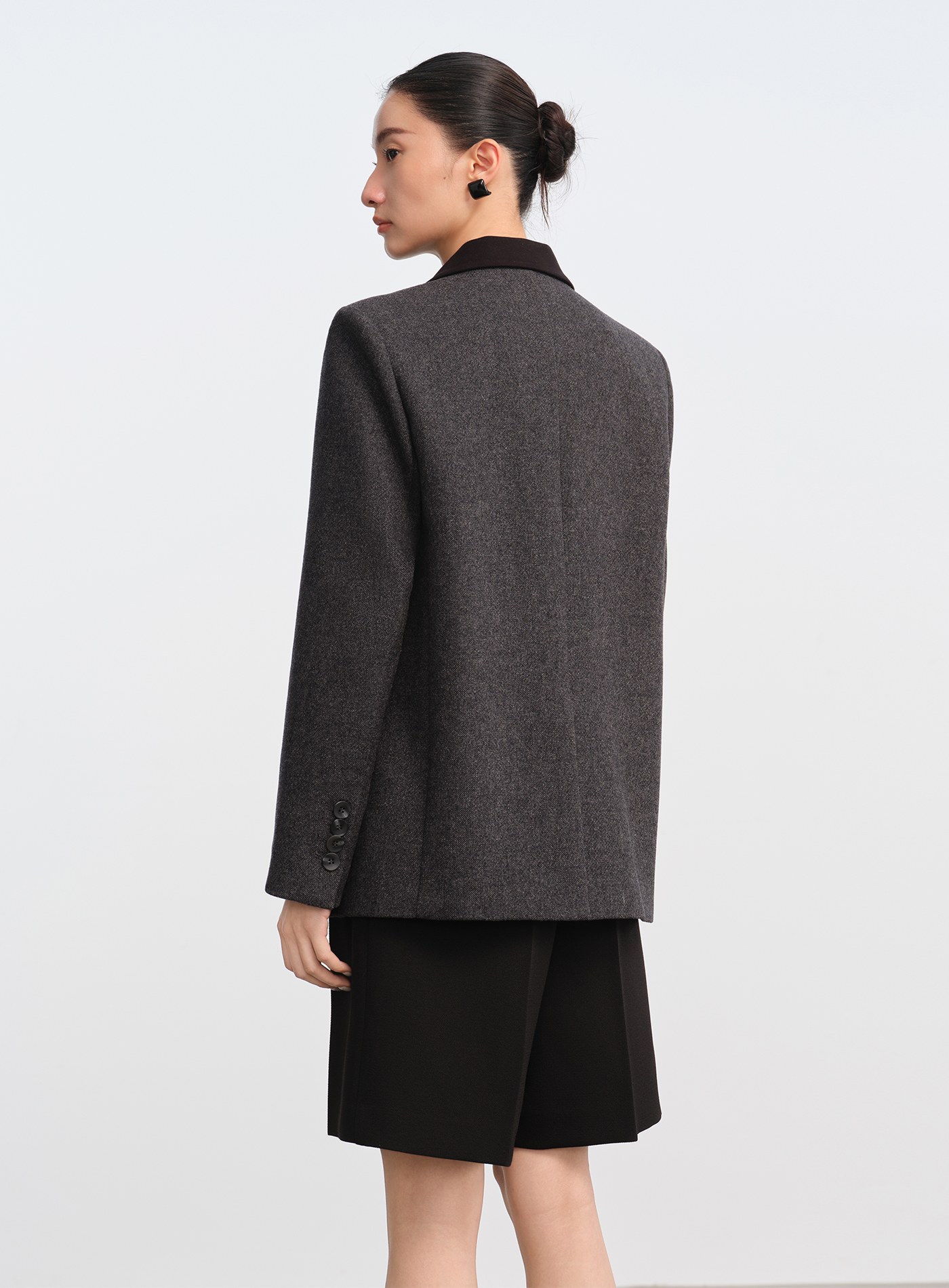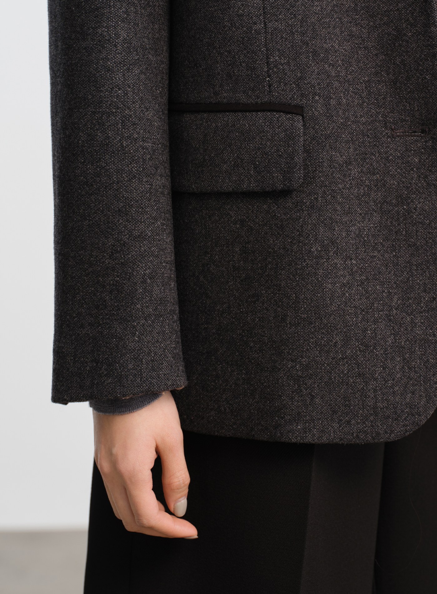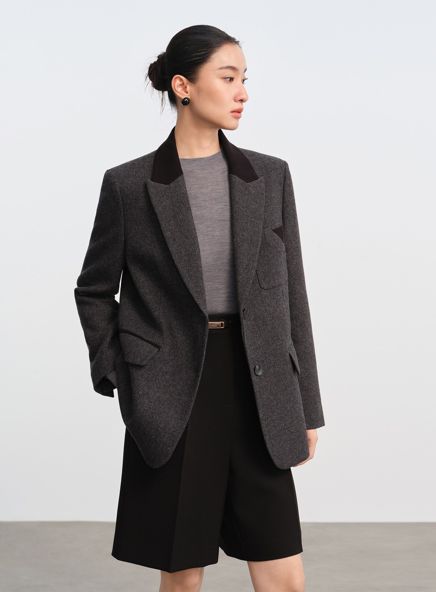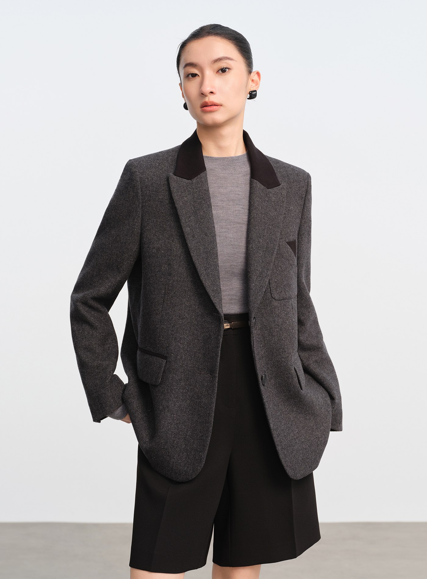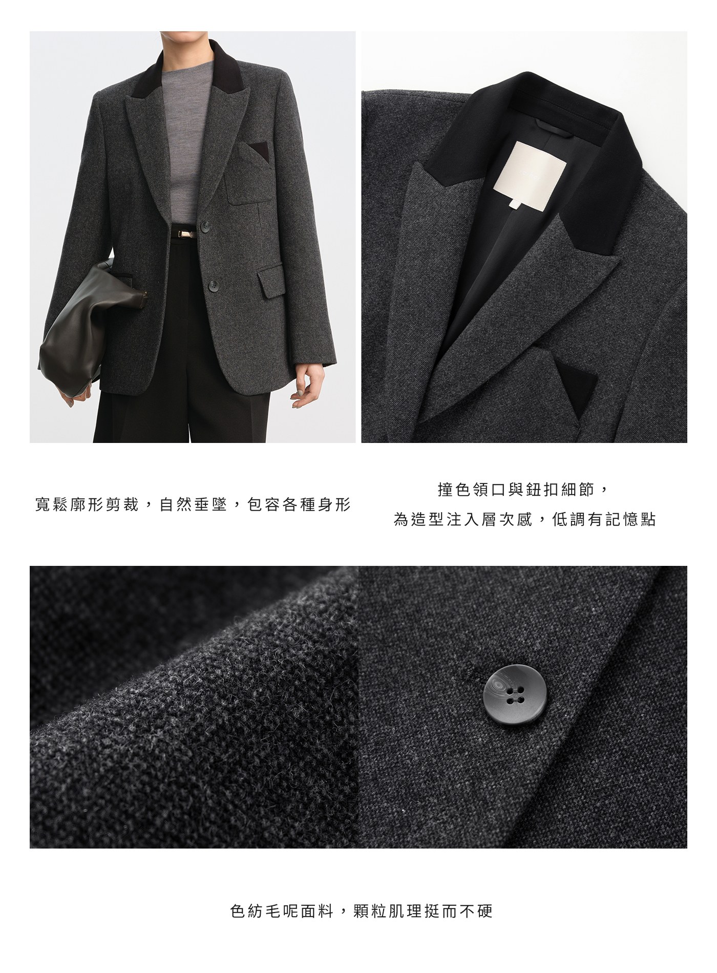 - 面料選用色紡毛呢,以先染後織工藝形成立體顆粒肌理,視覺層次豐富、觸感柔軟親膚