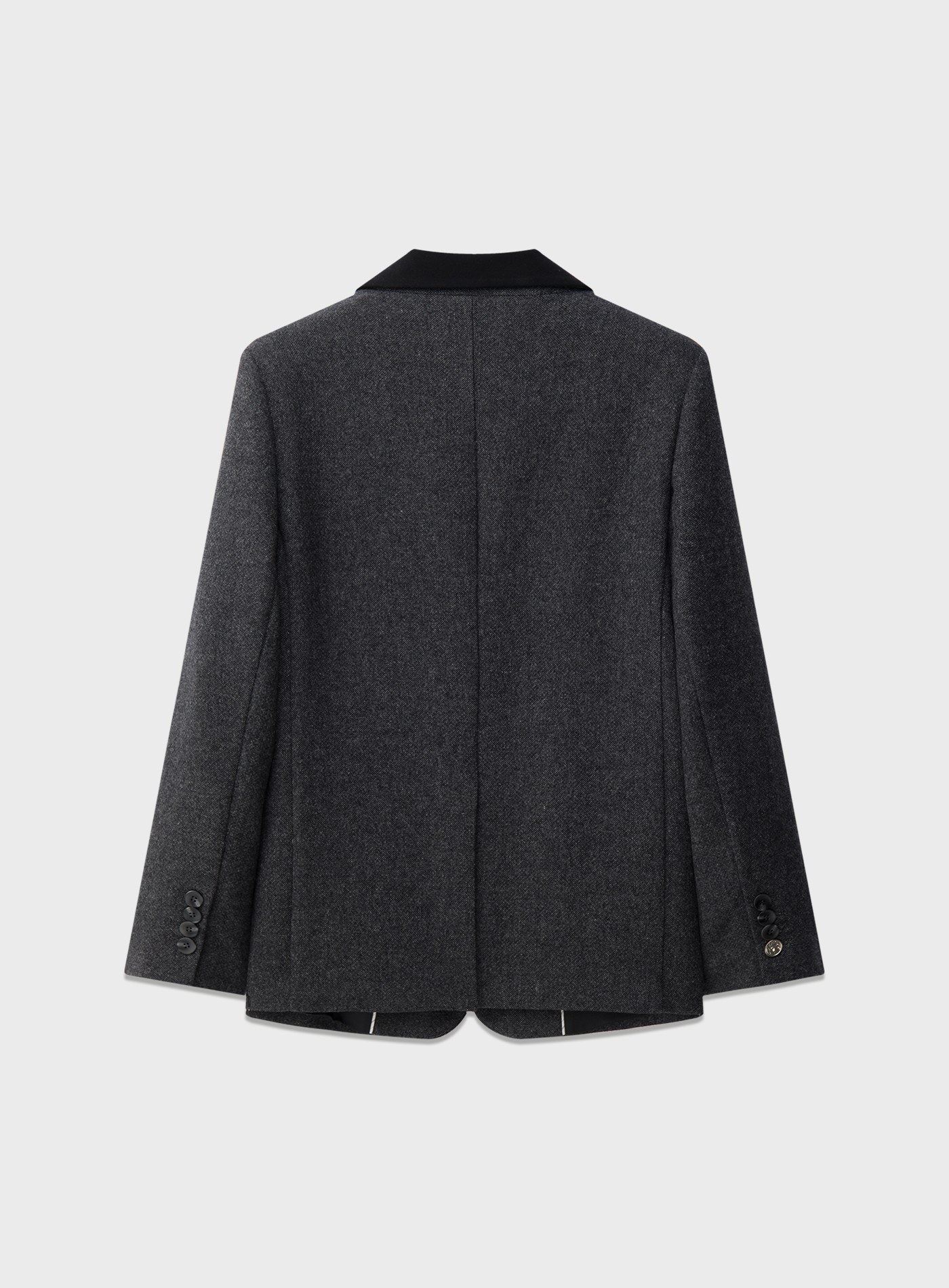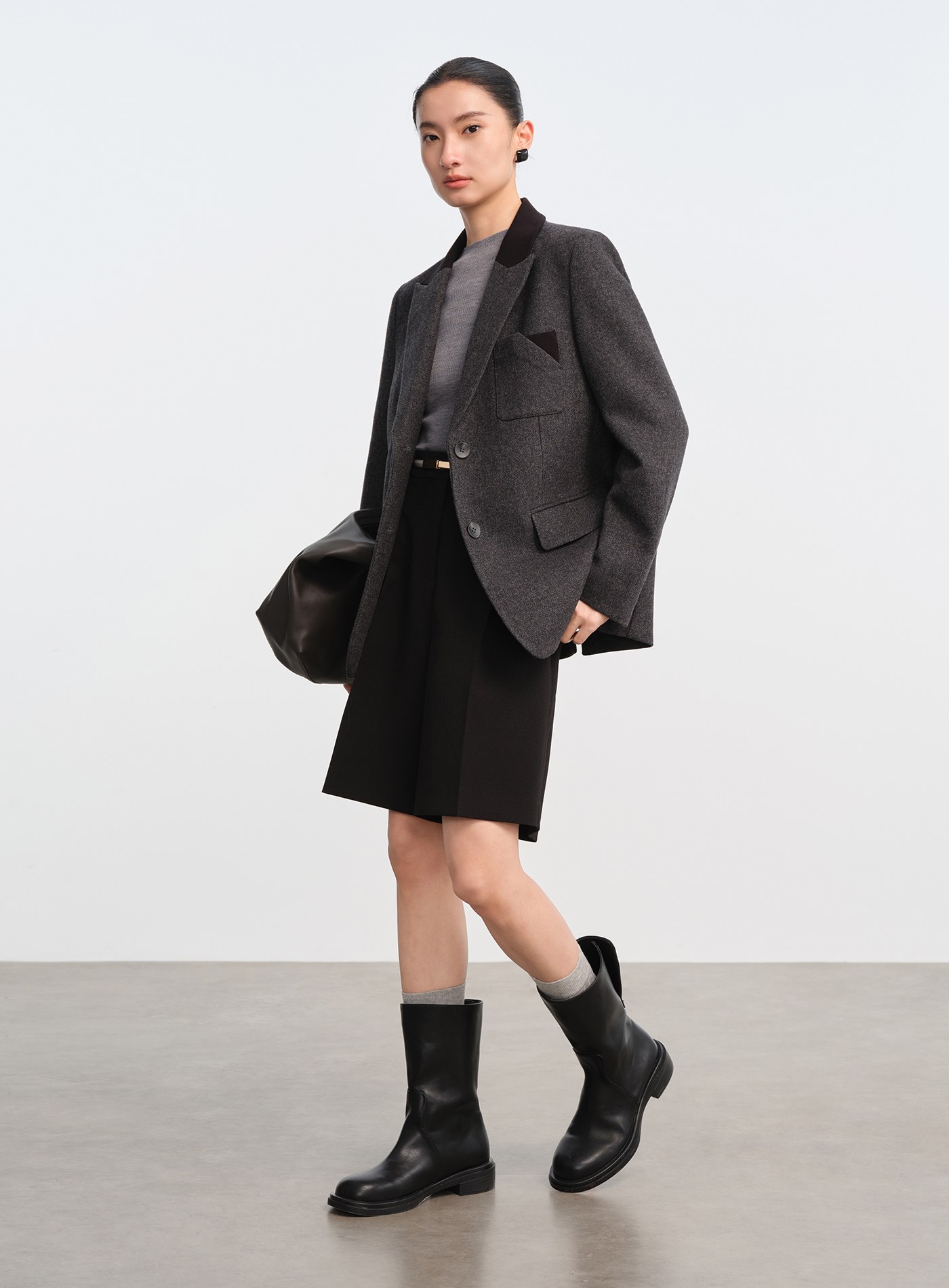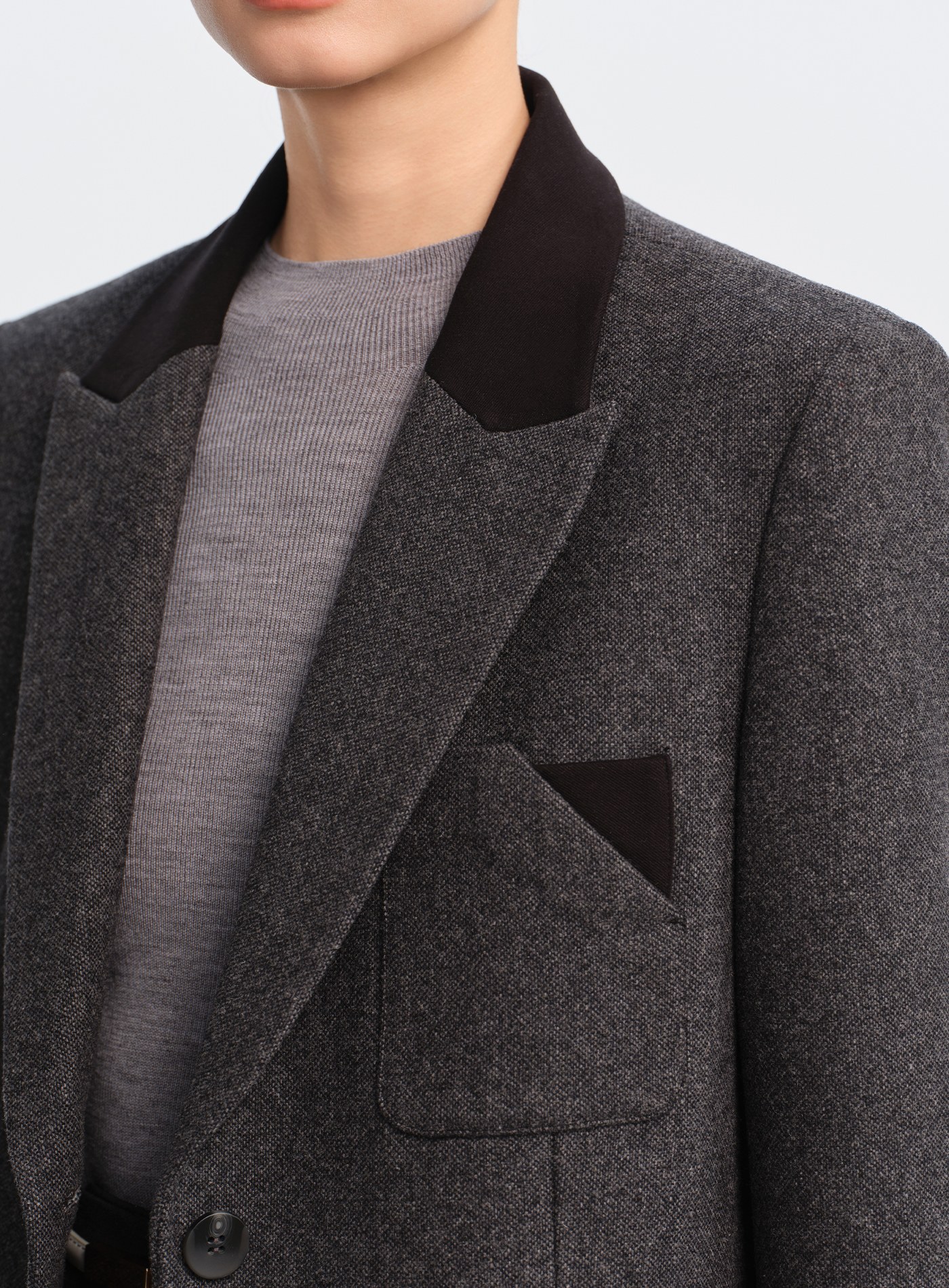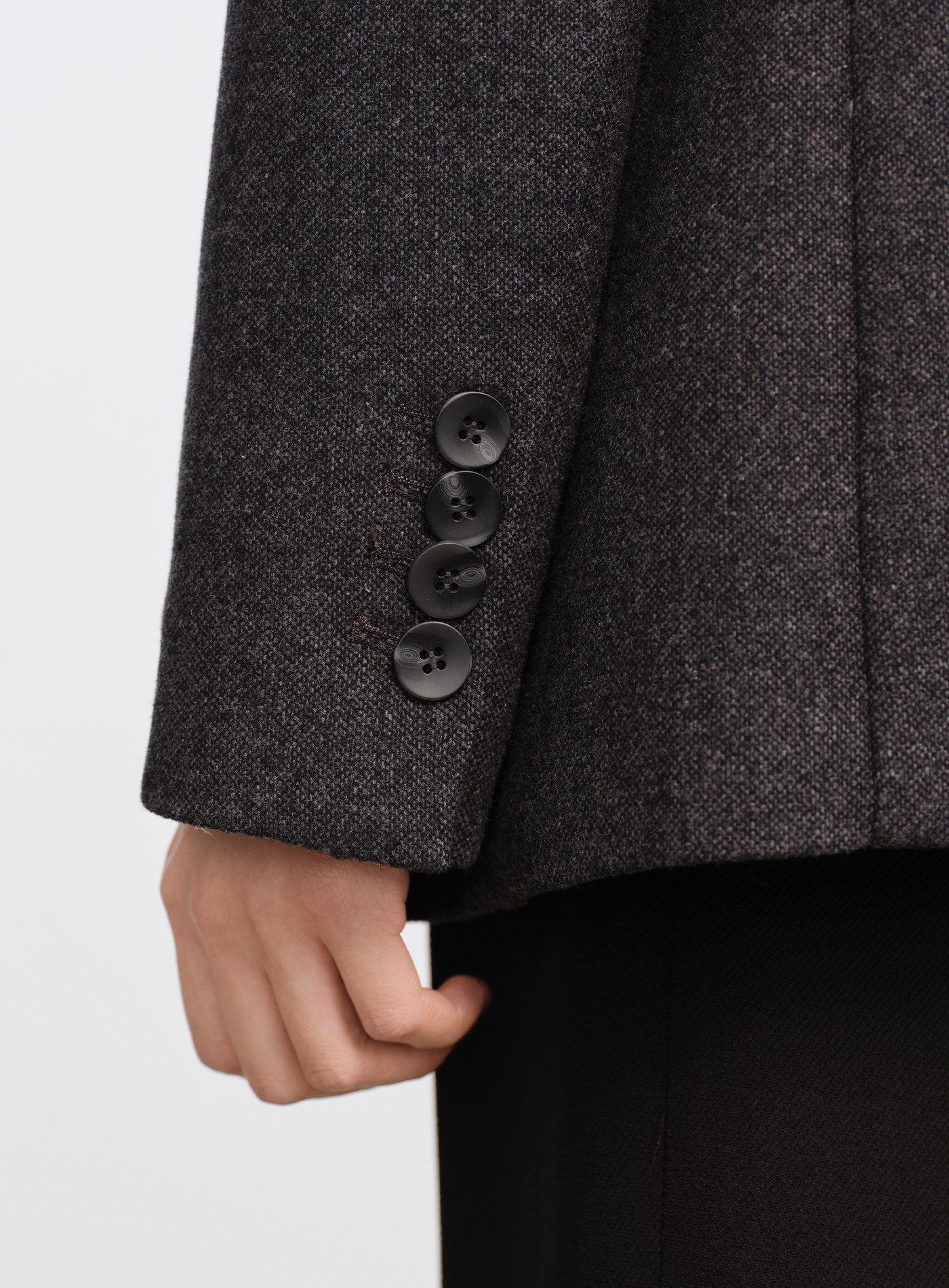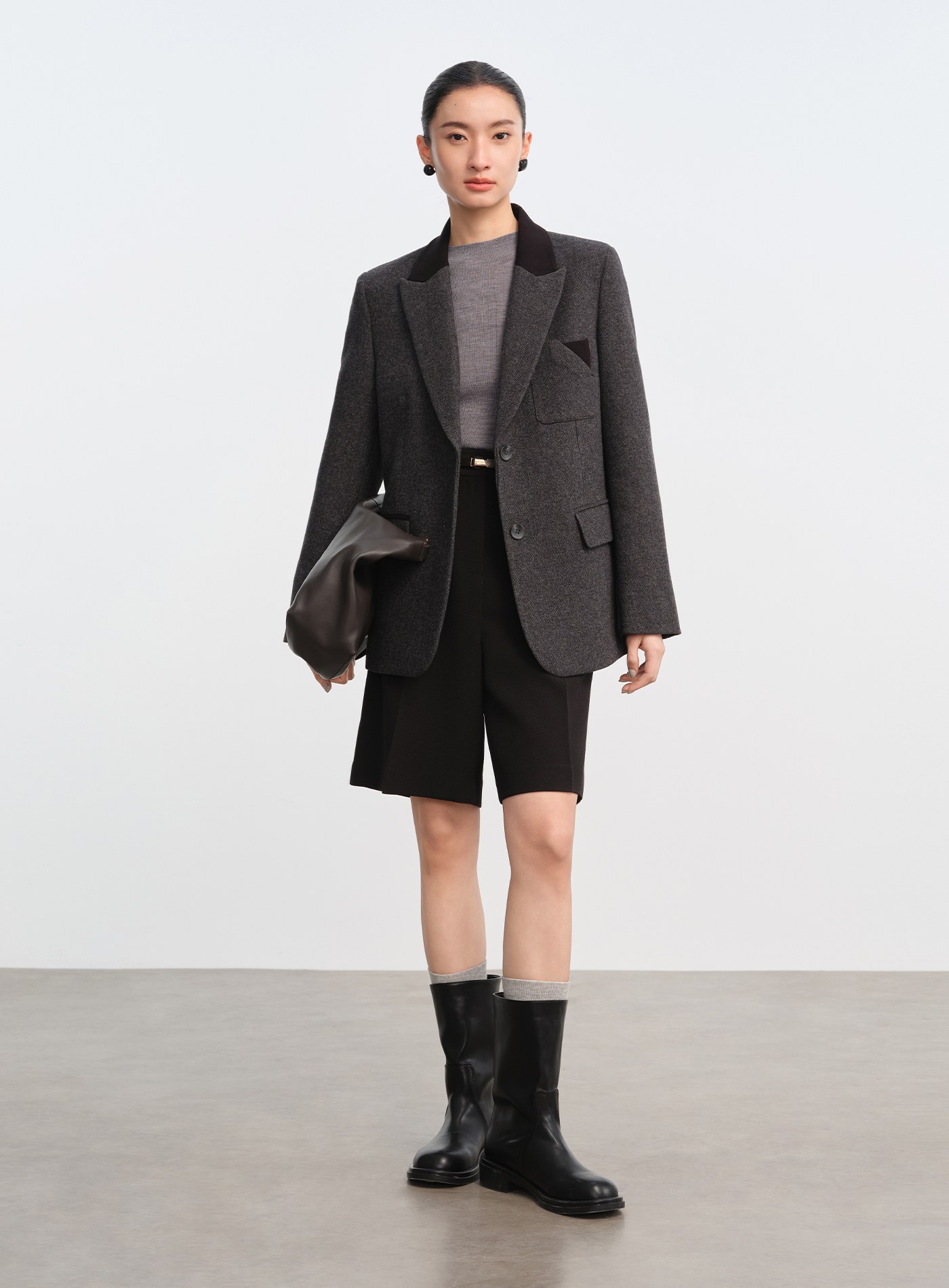 - 面料選用色紡毛呢,以先染後織工藝形成立體顆粒肌理,視覺層次豐富、觸感柔軟親膚