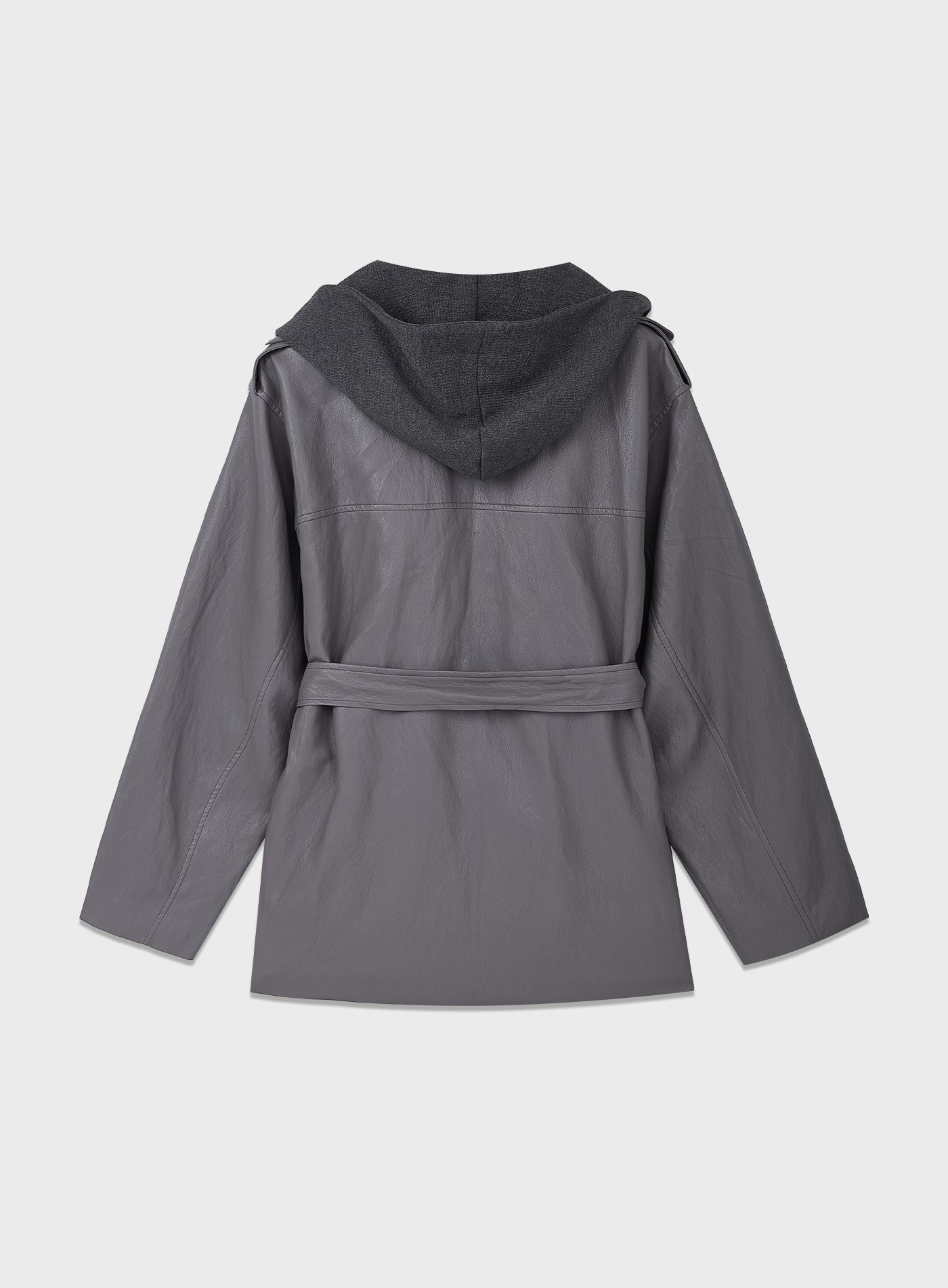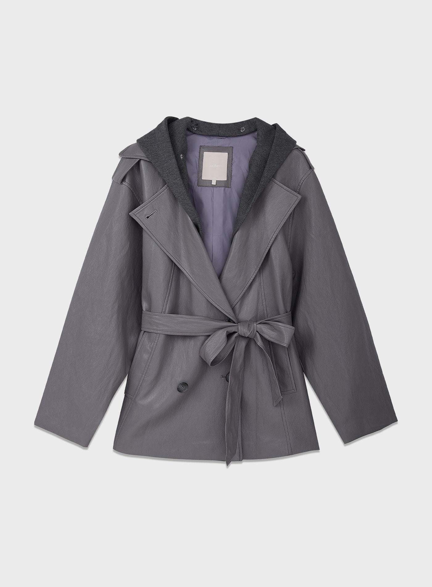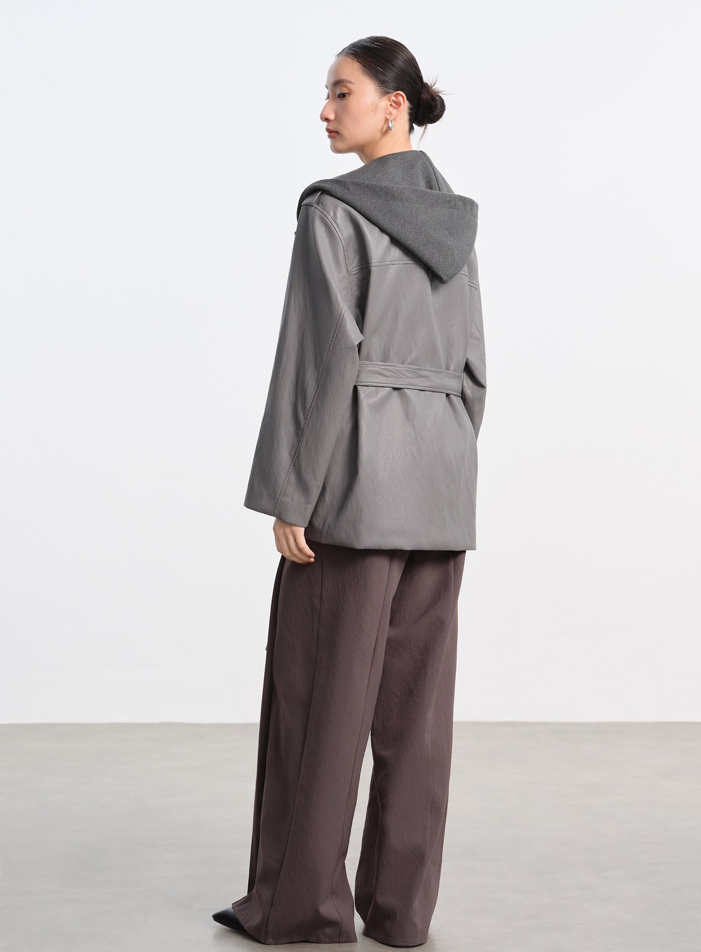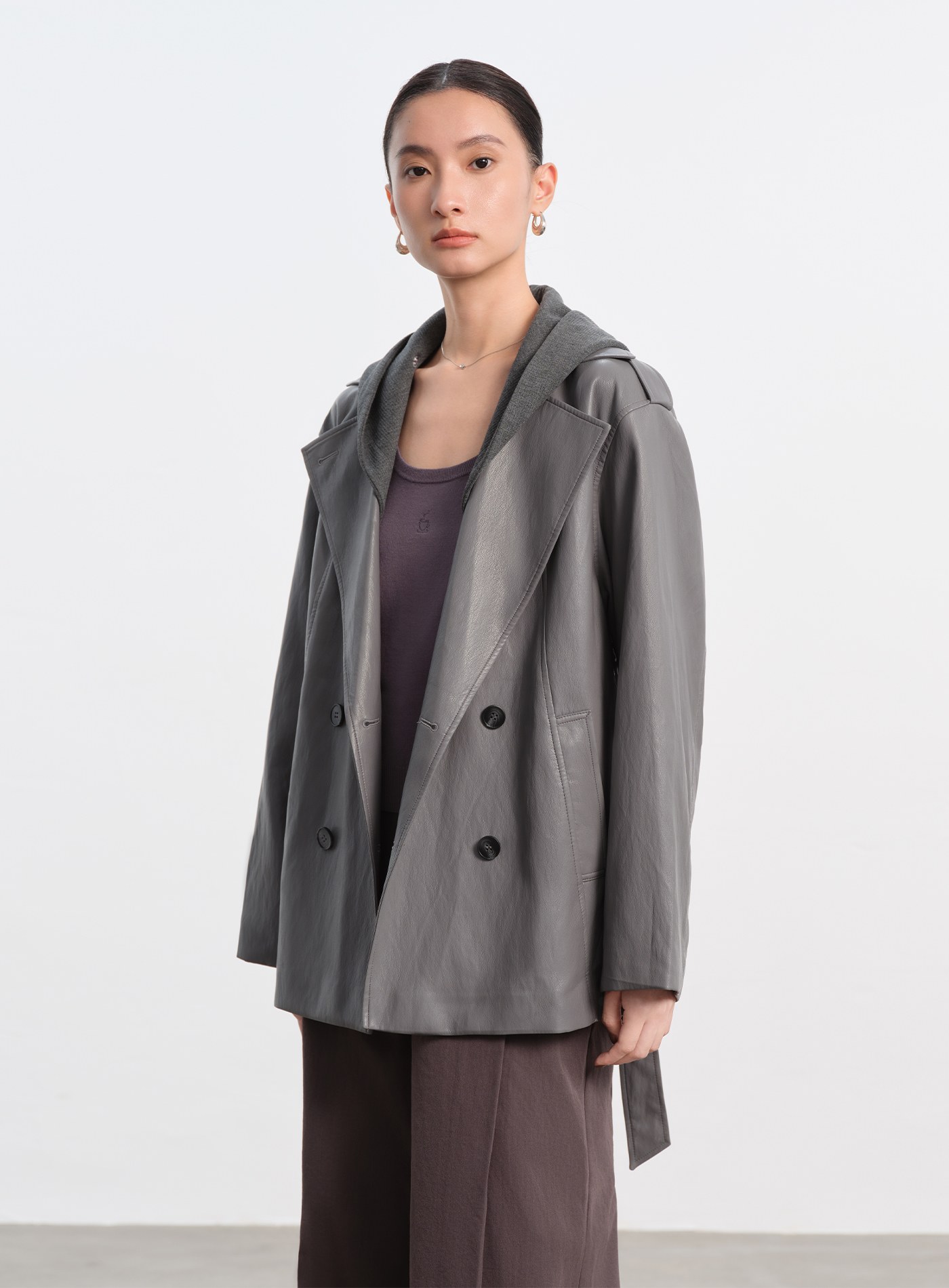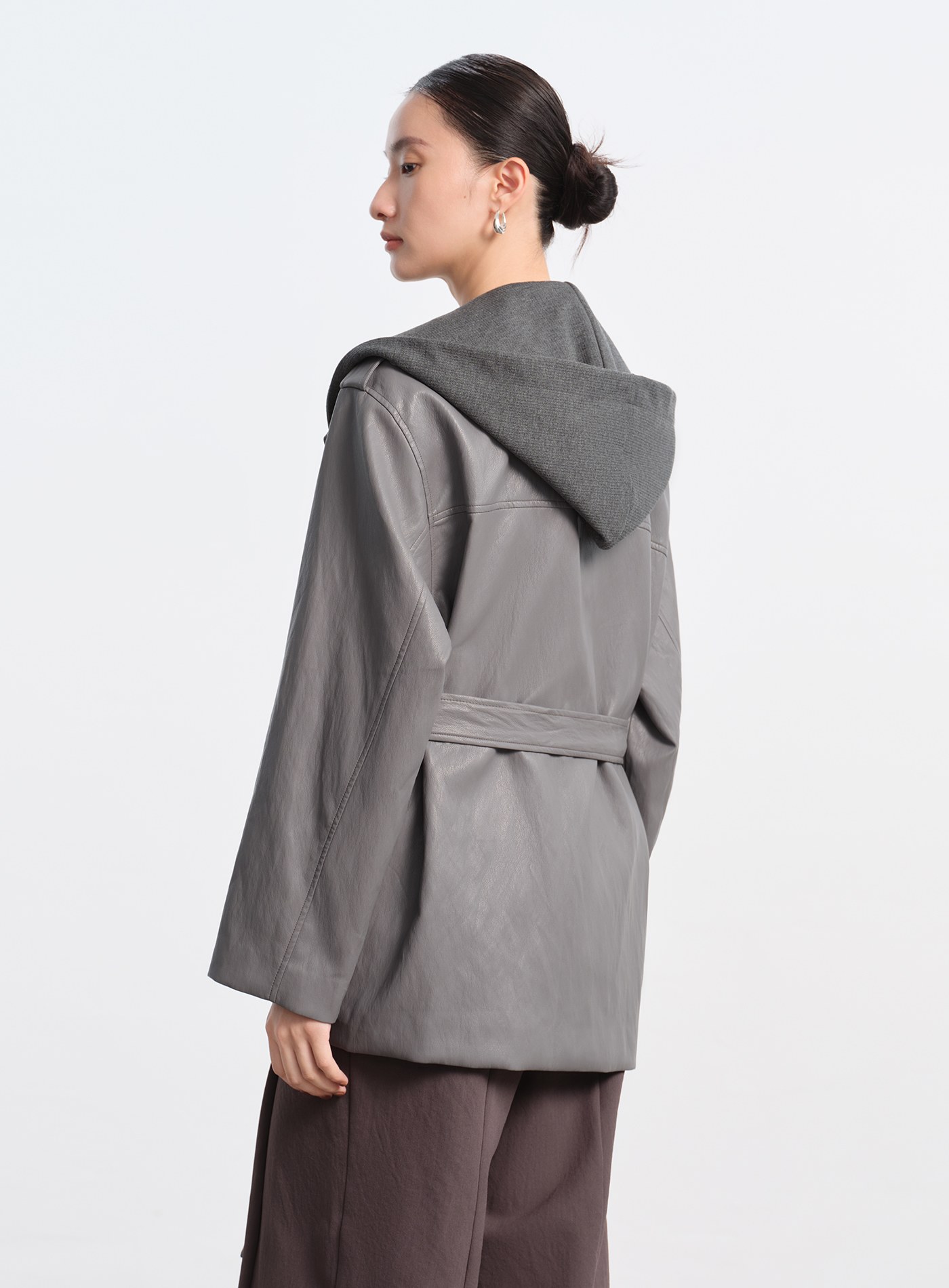 - 蛋白皮革拼接針織華夫格連帽風衣外套,打破傳統皮衣視角