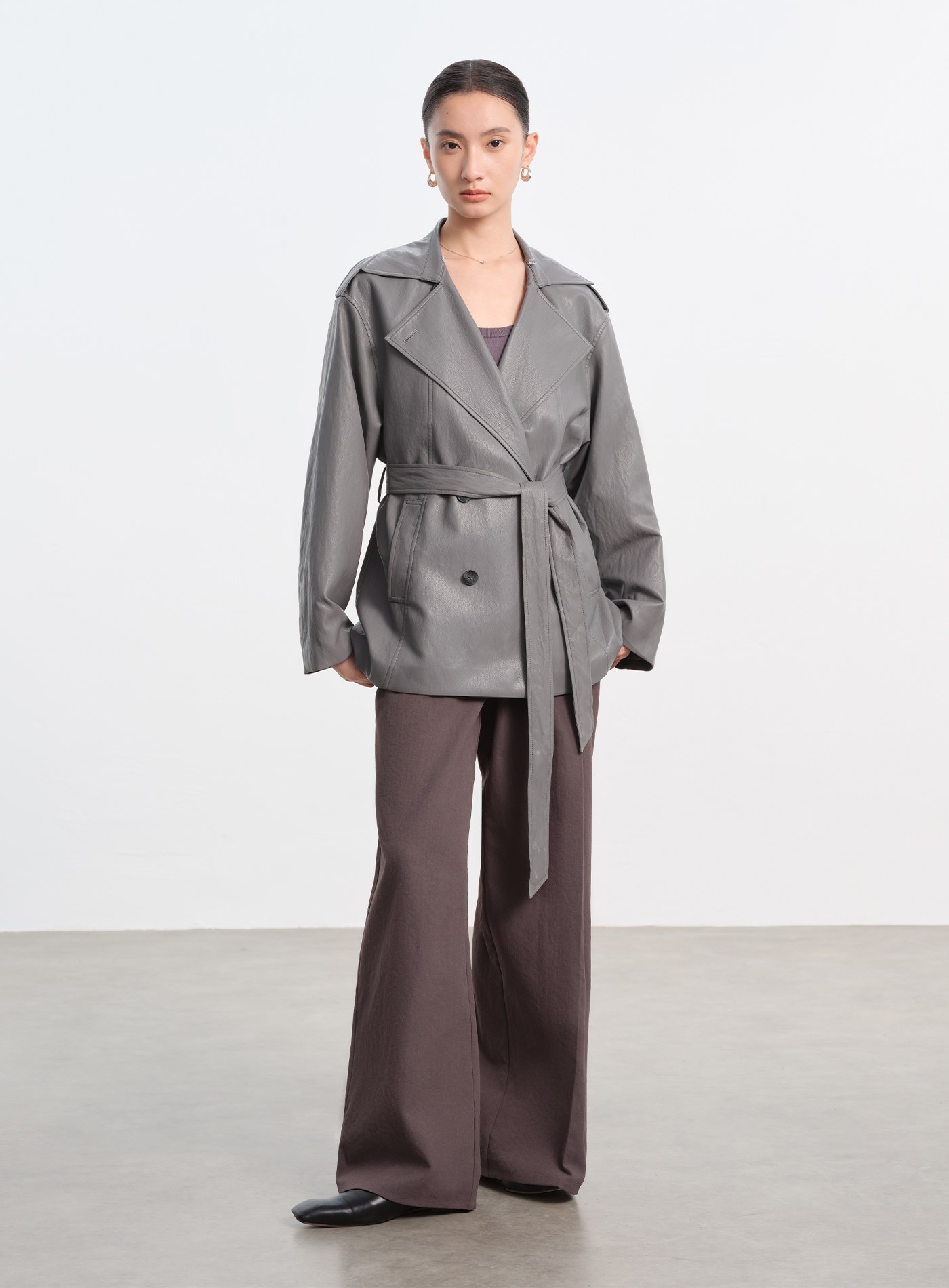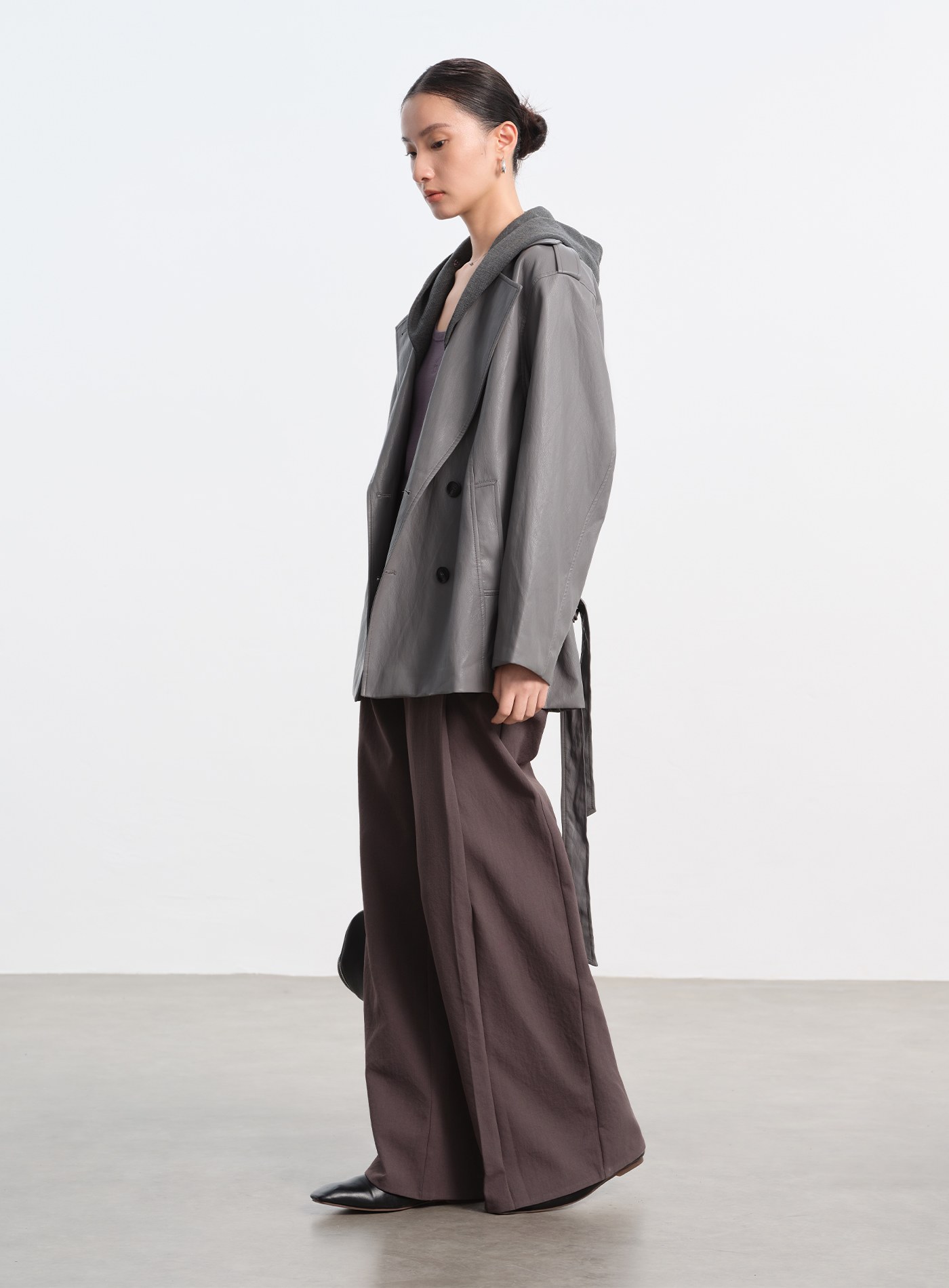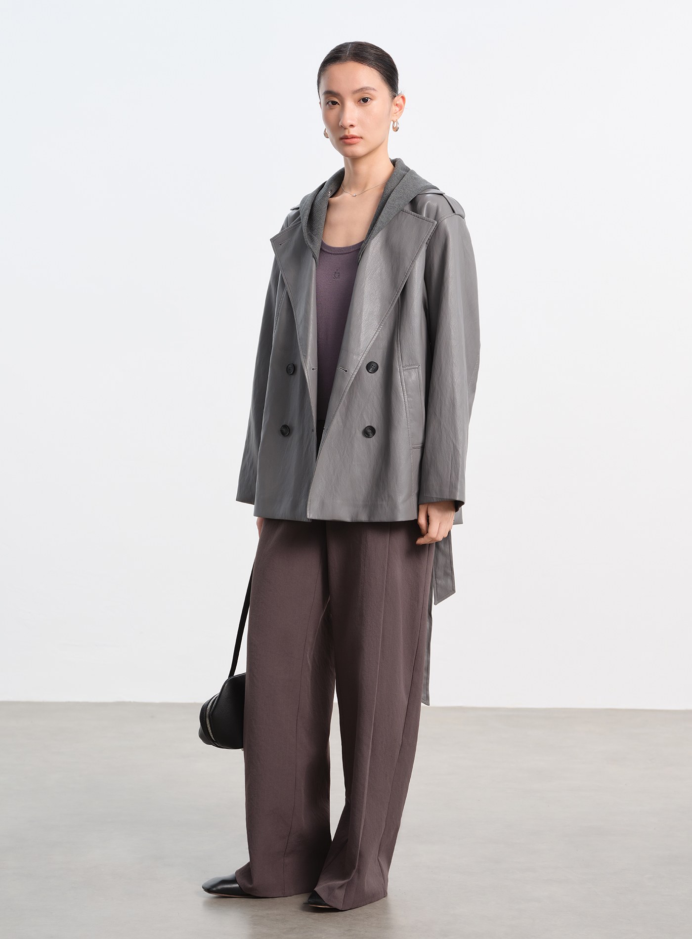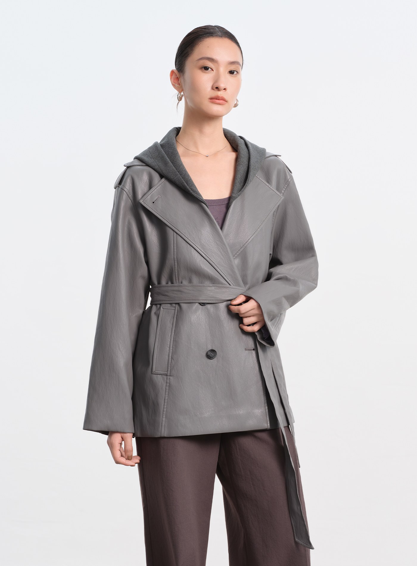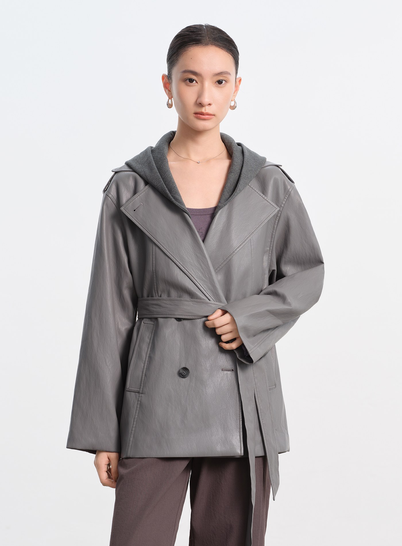 - 蛋白皮革拼接針織華夫格連帽風衣外套,打破傳統皮衣視角