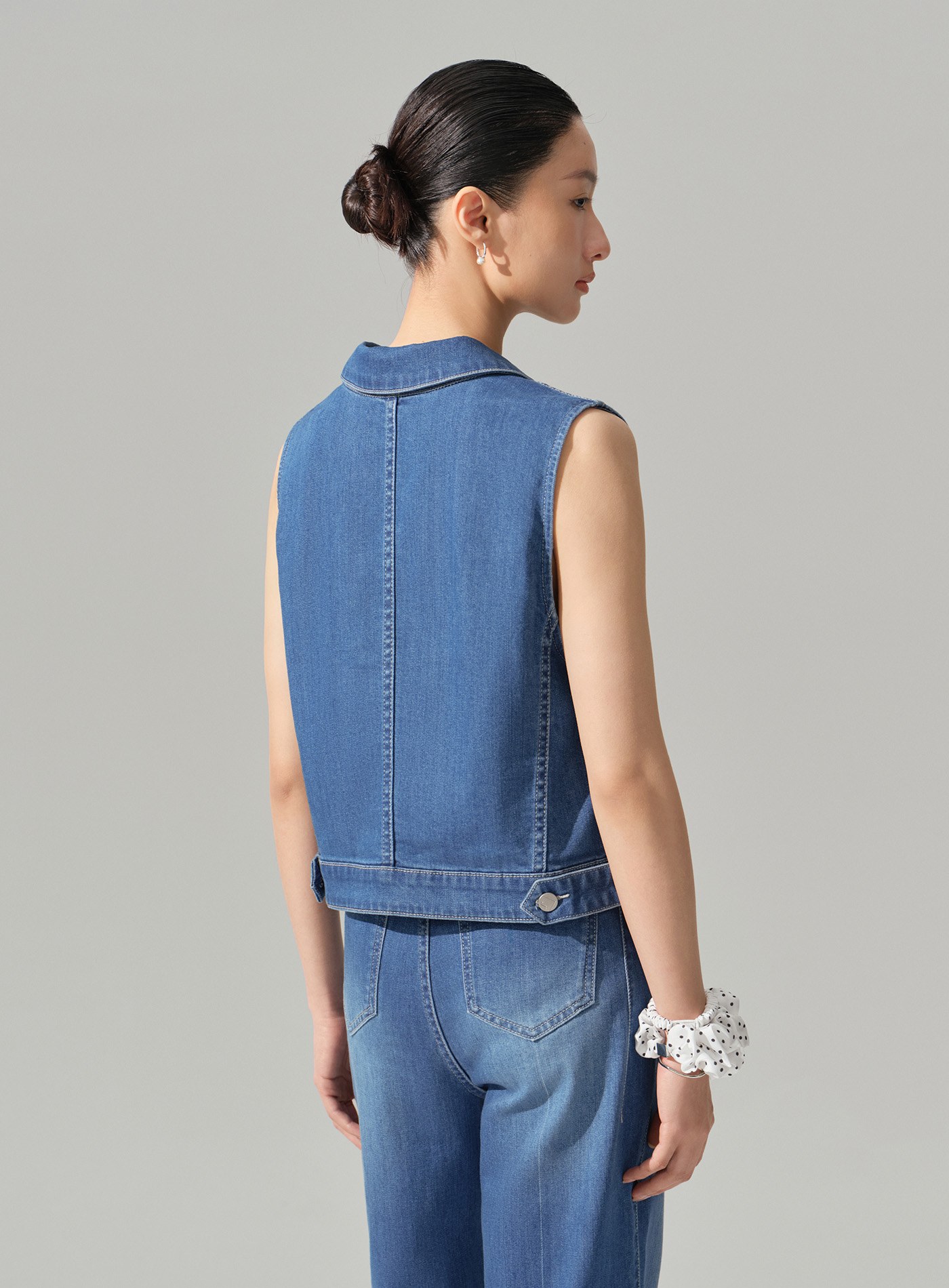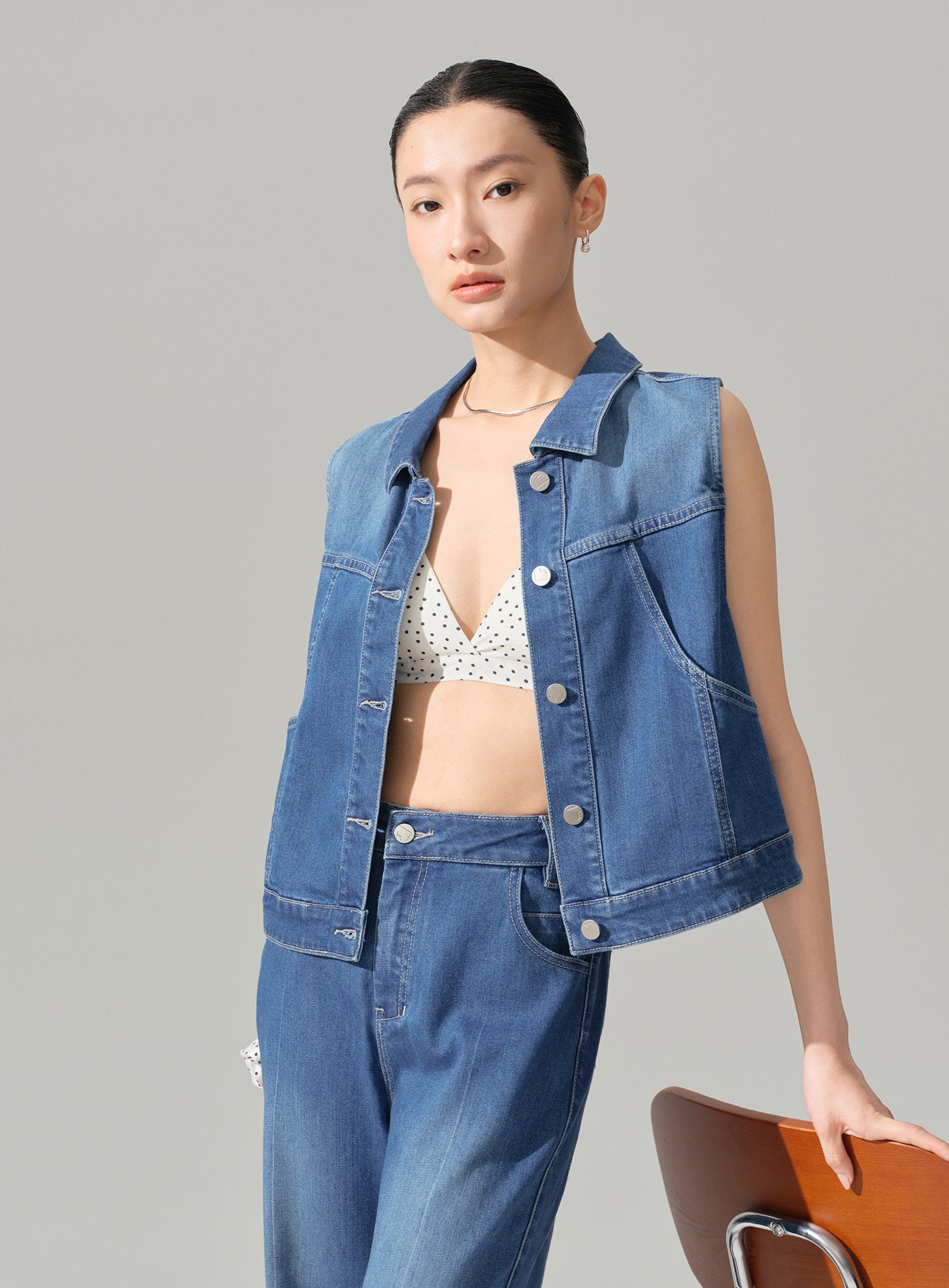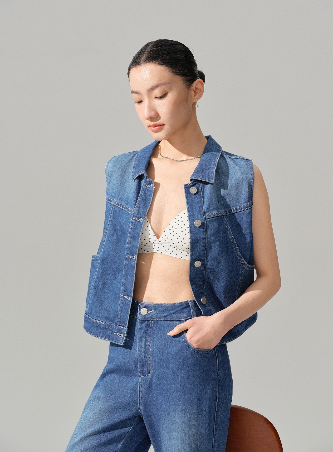 - 以經典牛仔馬甲版型為基礎,透過細節重組與材質升級,呈現俐落幹練卻不厚重的現代丹寧單品
