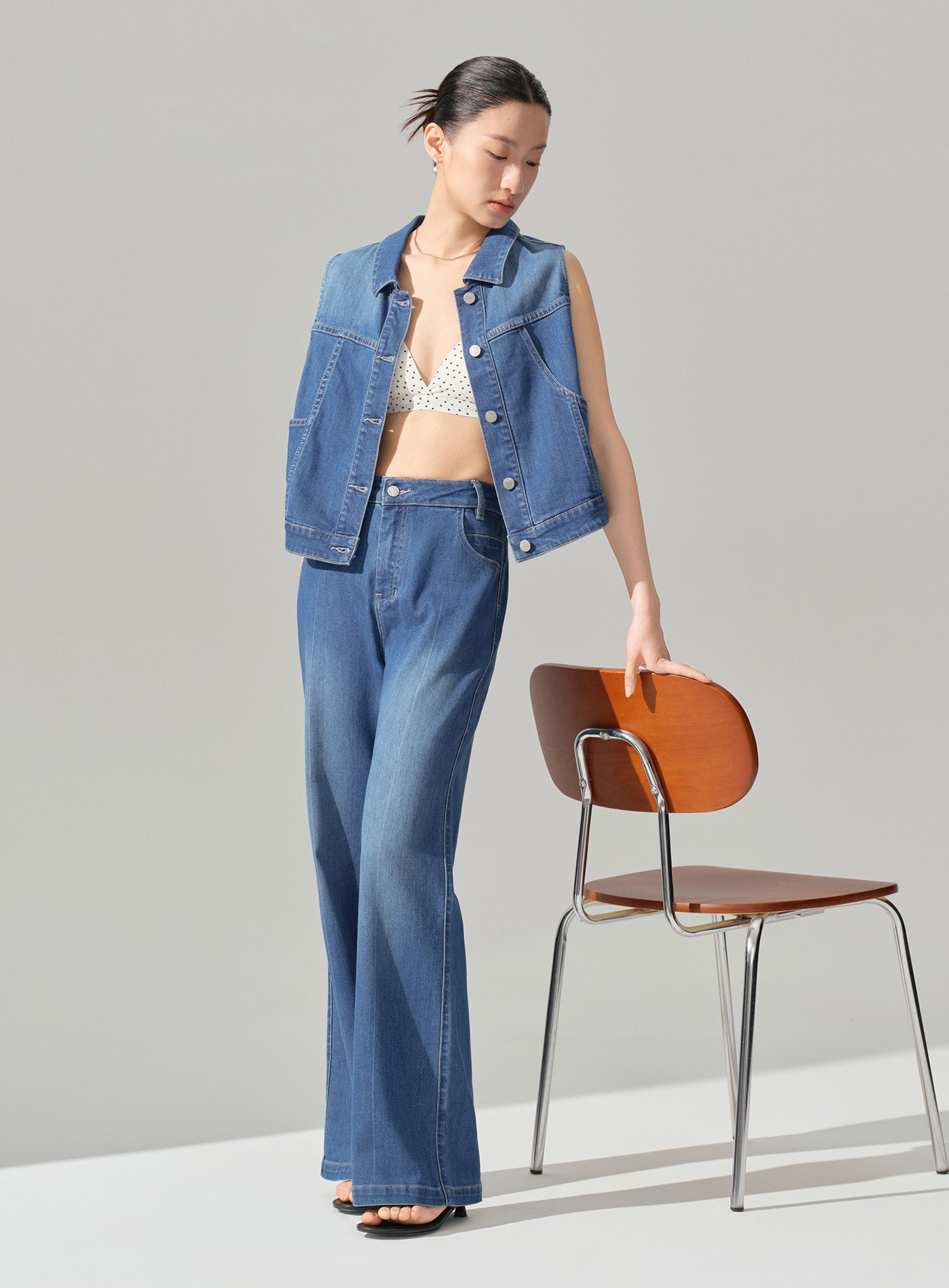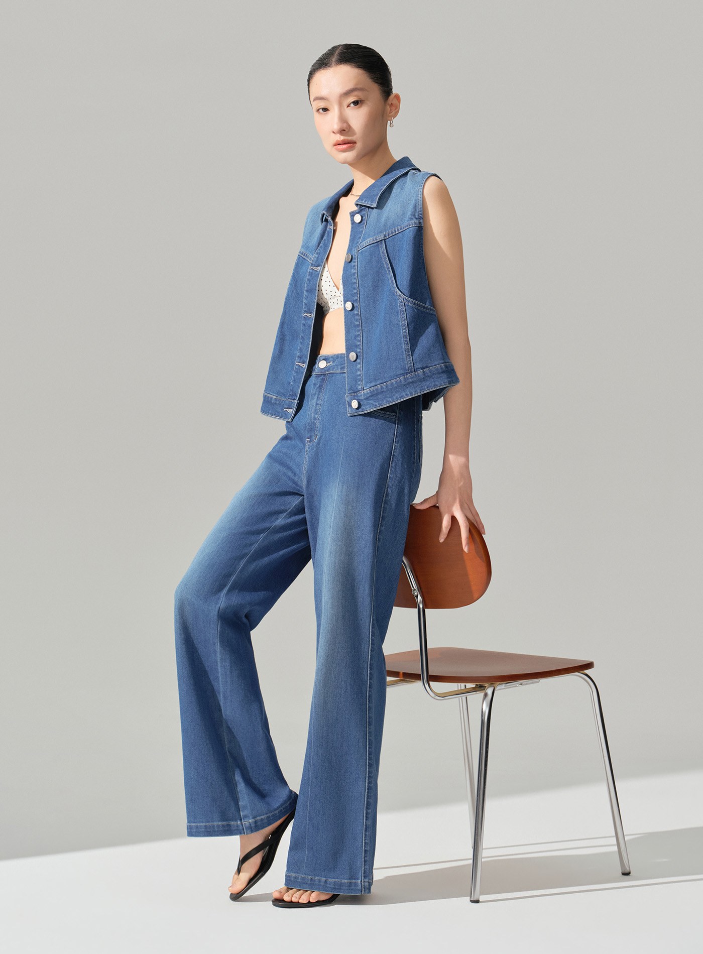- 選用多纖維混紡牛仔面料,兼具親膚舒適、垂墜涼感與細膩光澤,讓丹寧在春夏季節也能輕盈有型