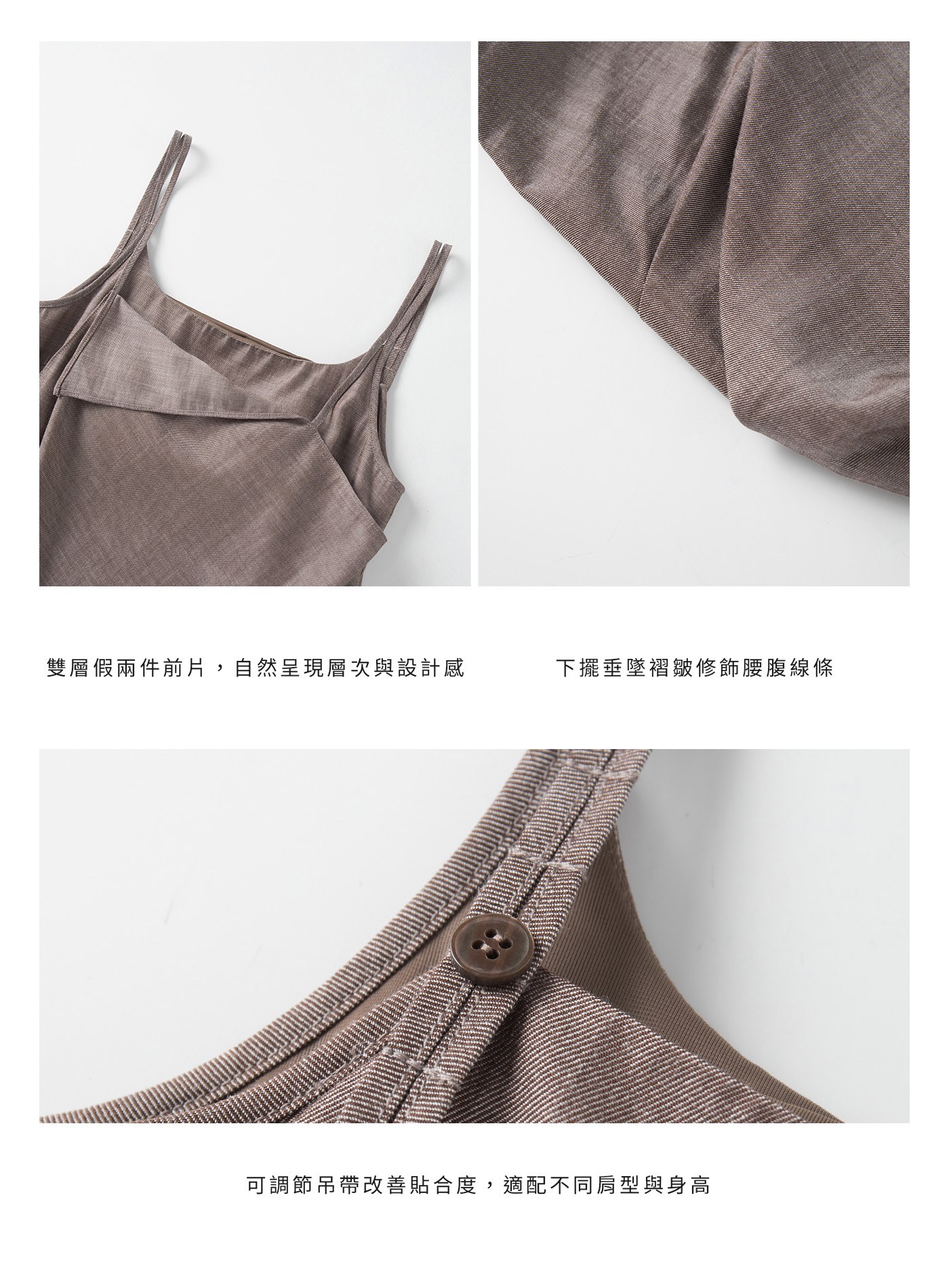 - 前片雙層結構營造假兩件視覺效果,單穿即可展現層次與設計感