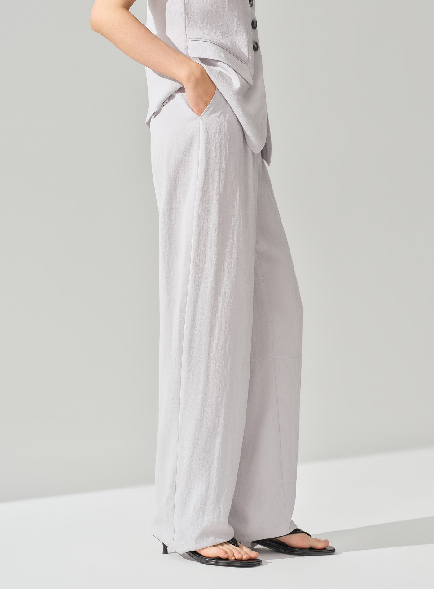 - 採用高比例天絲與人造棉混紡面料,布料柔軟親膚、垂墜感佳;加入尼龍纖維提升筋骨與結構支撐,使褲型挺不軟塌;裡布緞面內襯確保穿脫順滑