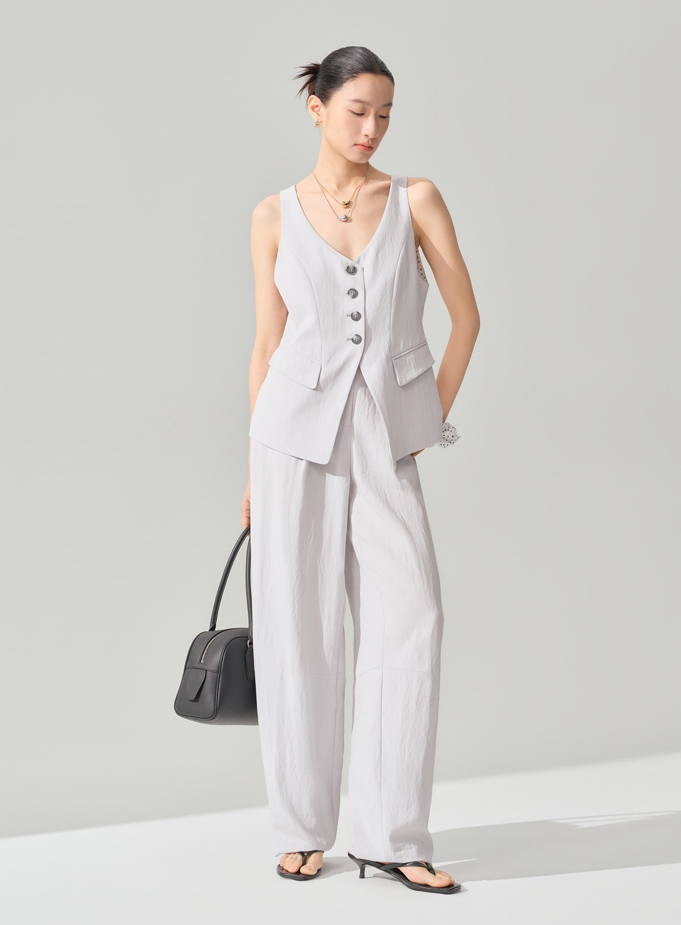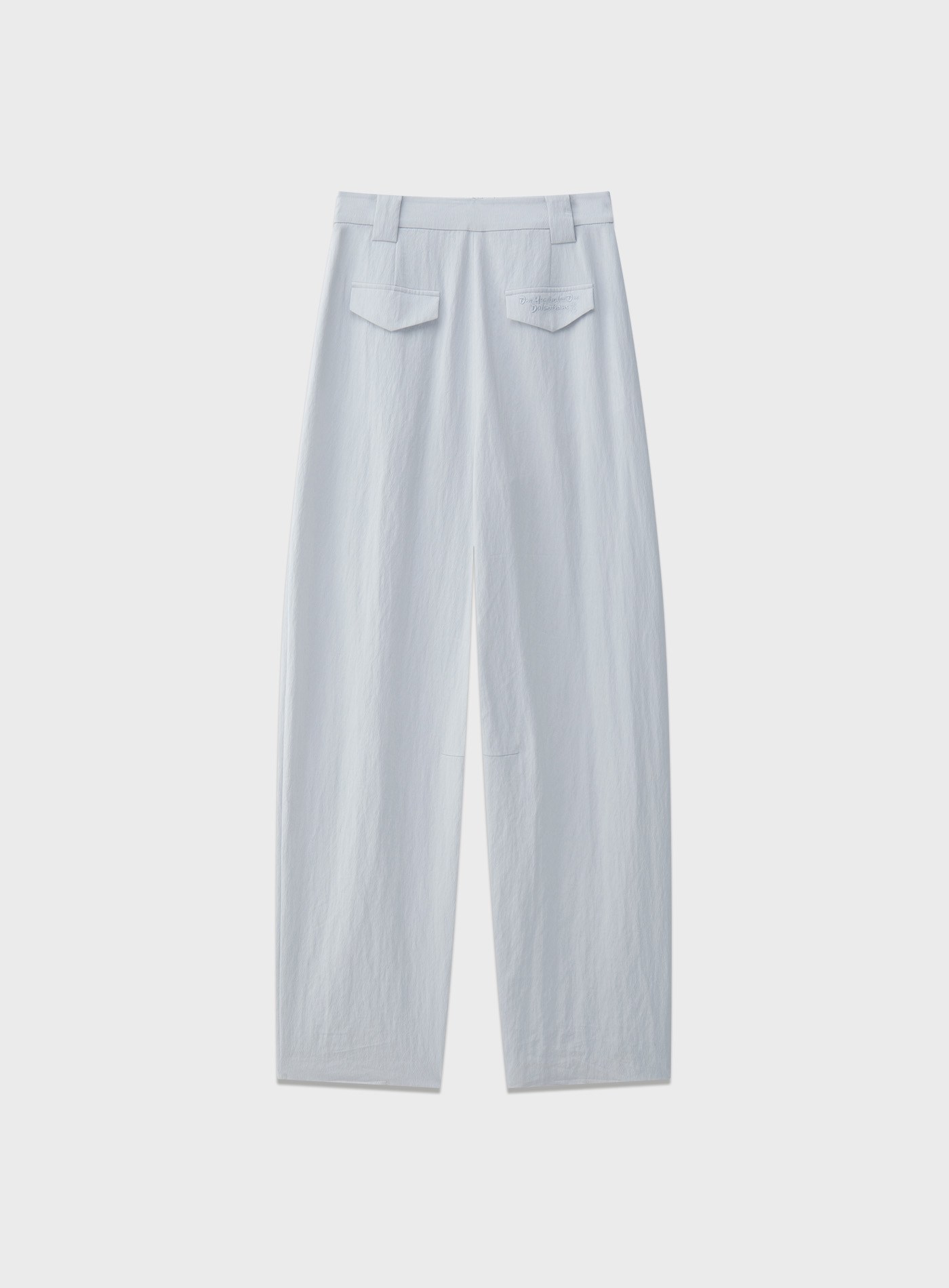 - 採用彎刀褲型結合前片活褶設計,褲身線條隨步伐自然展開,形成流暢而富有動態感的立體輪廓
