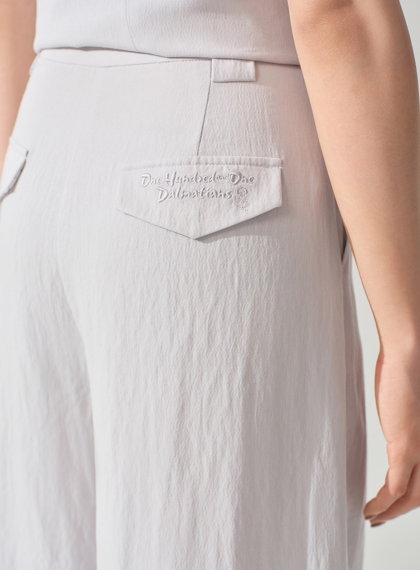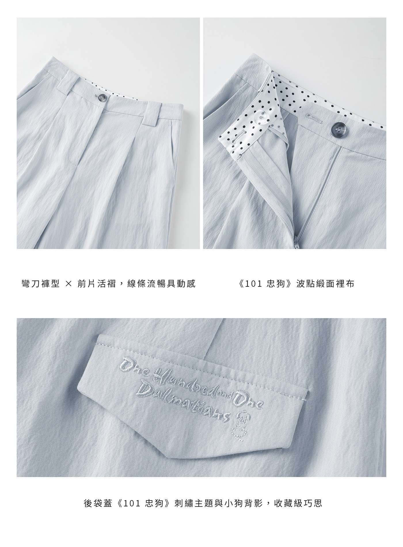 - 後袋蓋內側與口袋布皆選用《101 忠狗》波點緞面裡布;後袋蓋並細緻刺繡主題與小狗背影圖樣,童趣巧思隱藏於內