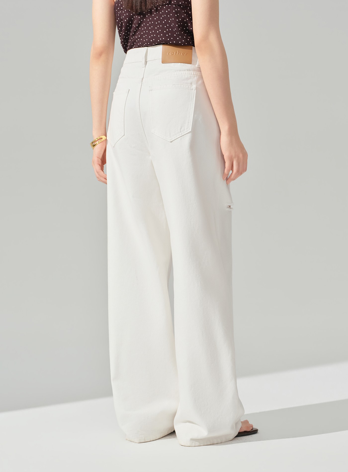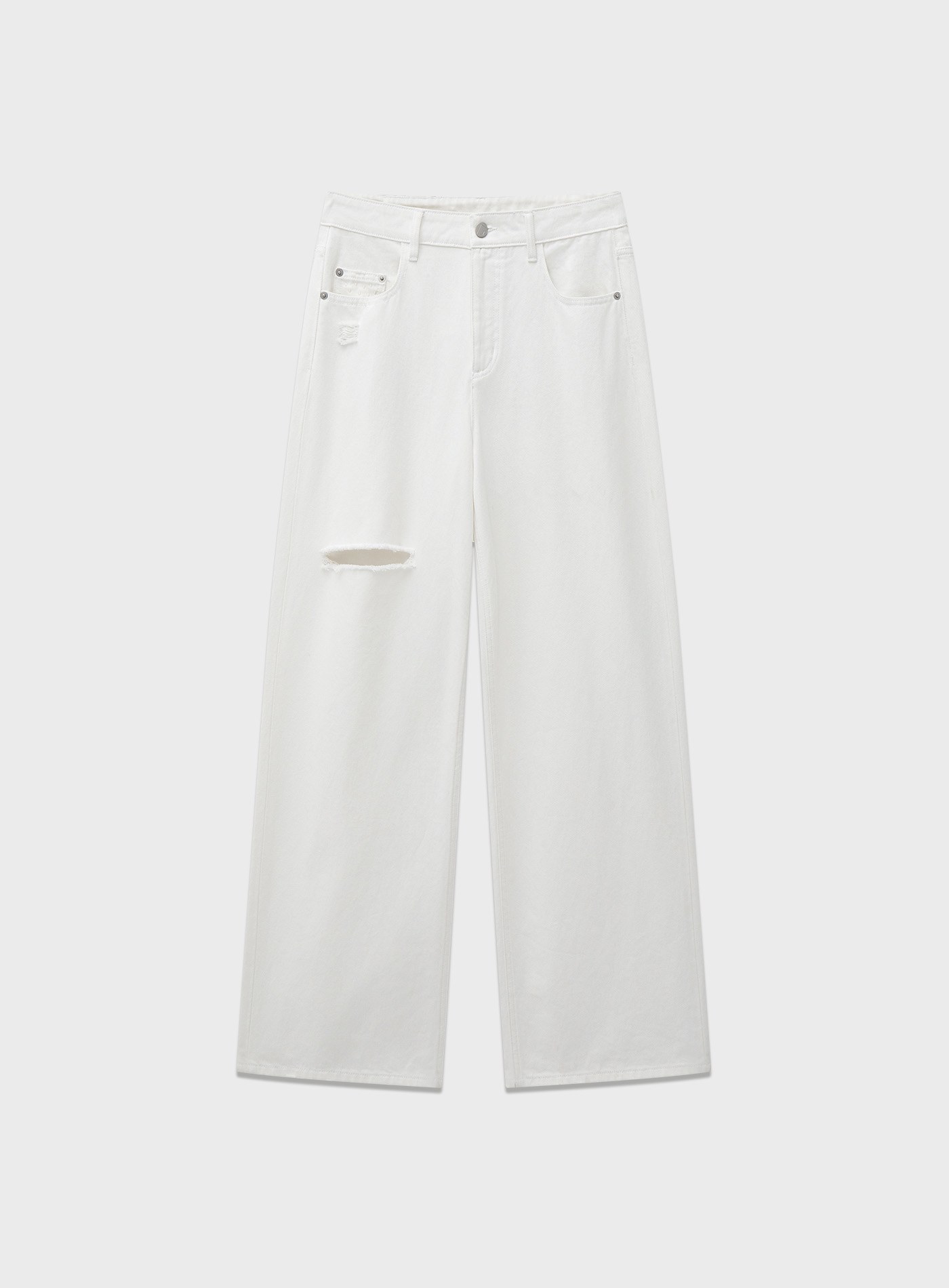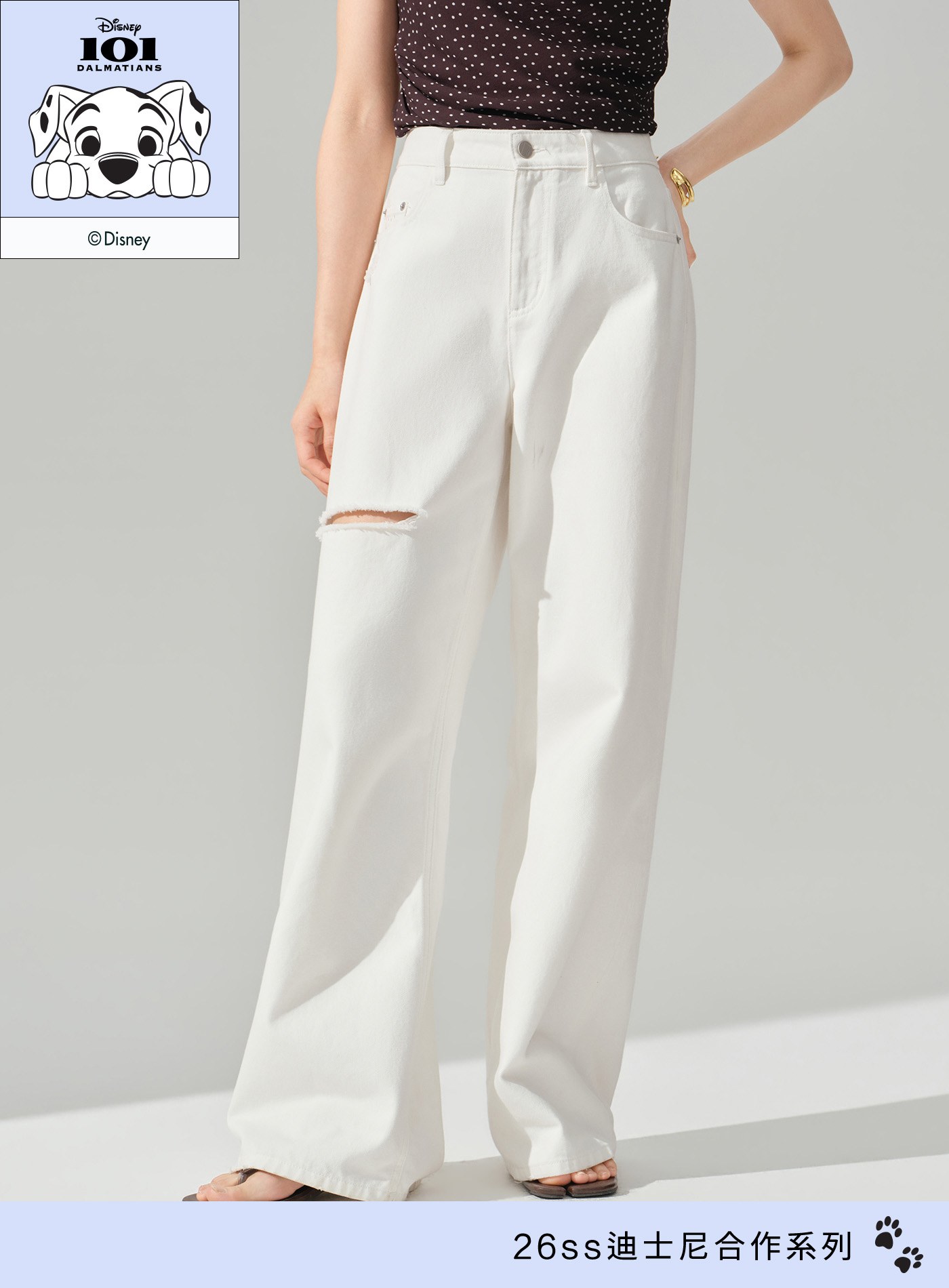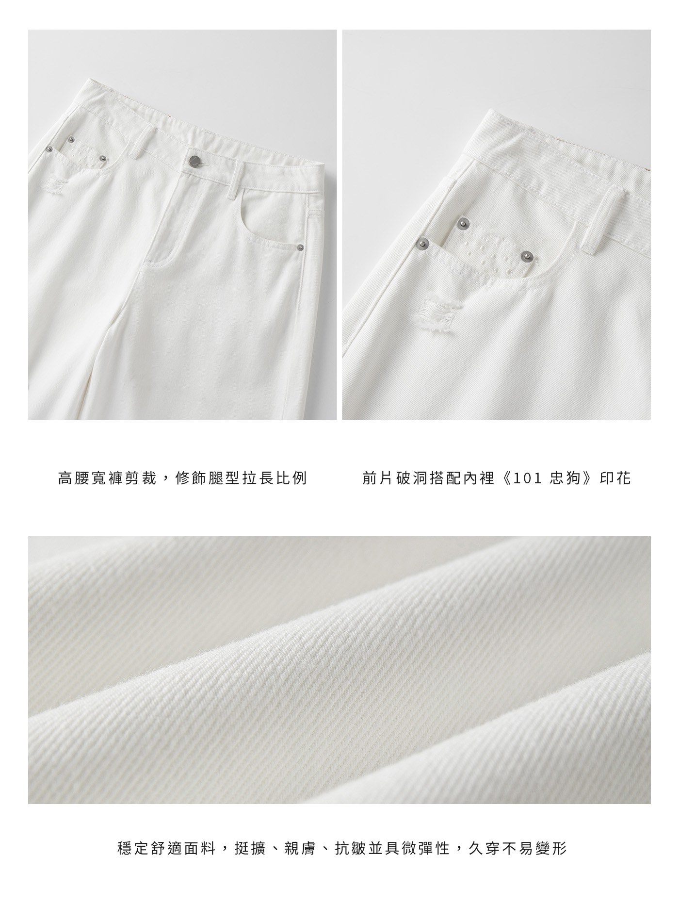 - 前片破洞設計打破白色牛仔的單調印象,破洞內裡採用專屬印花工藝,注入隨性街頭氛圍