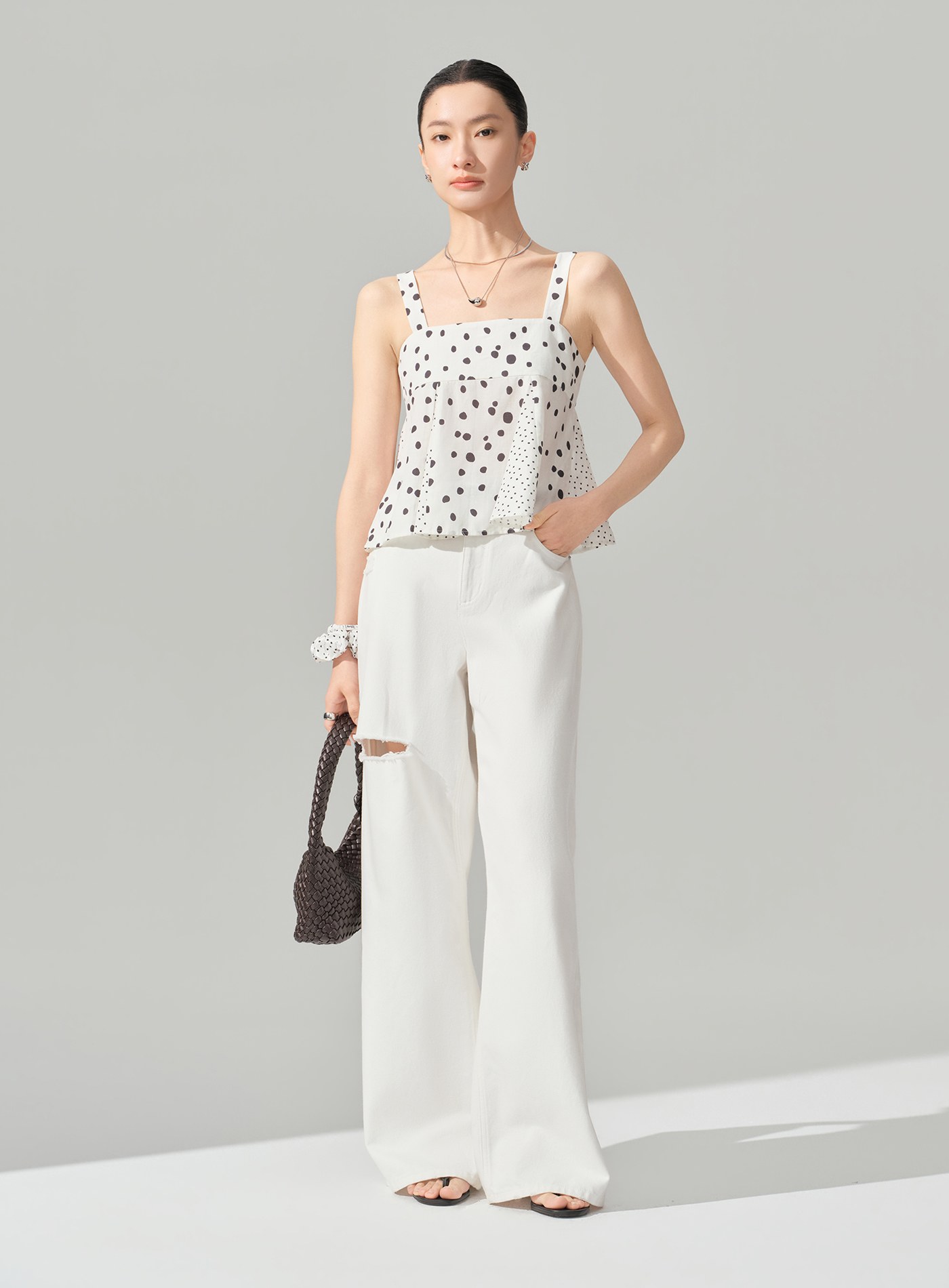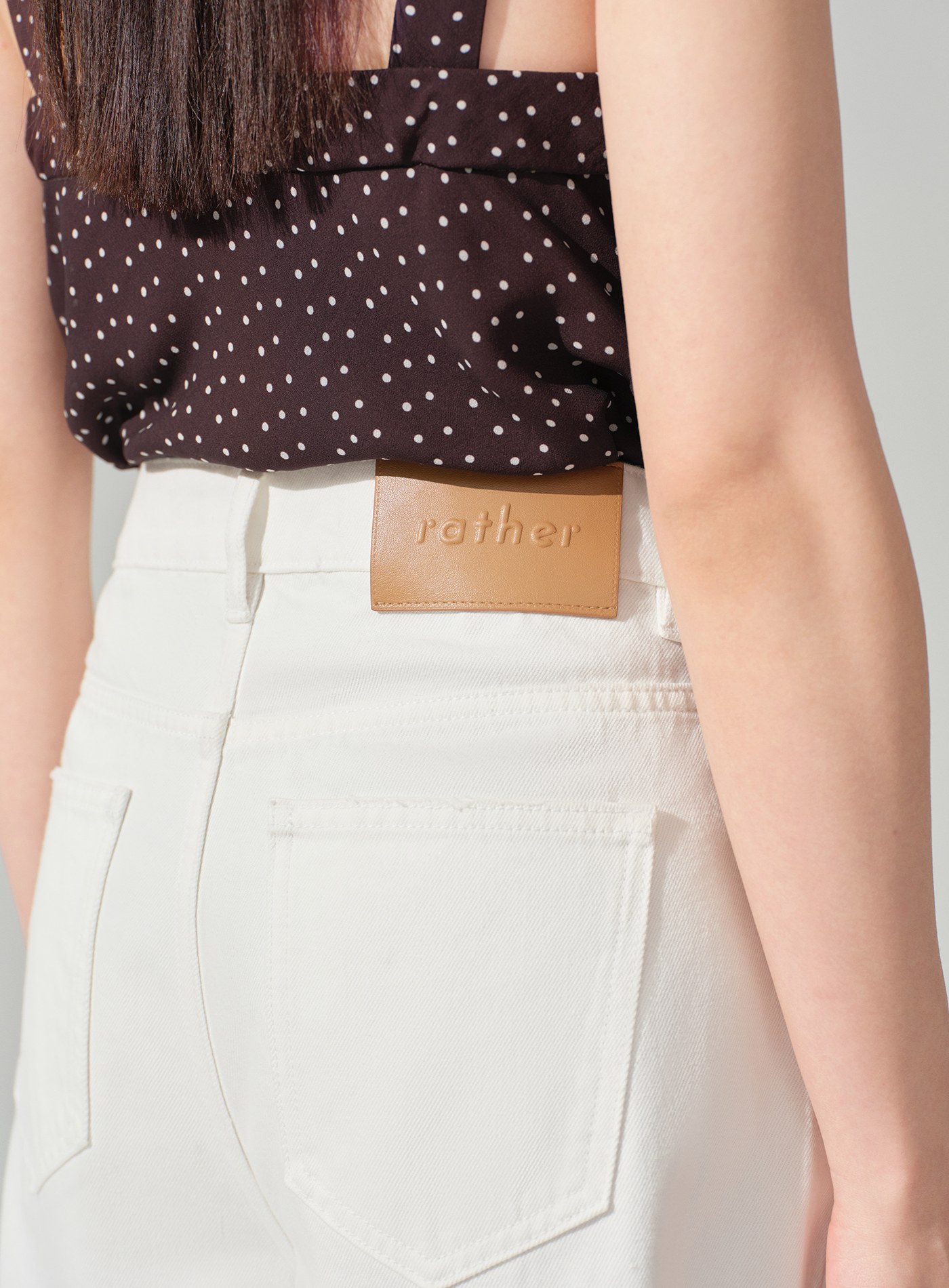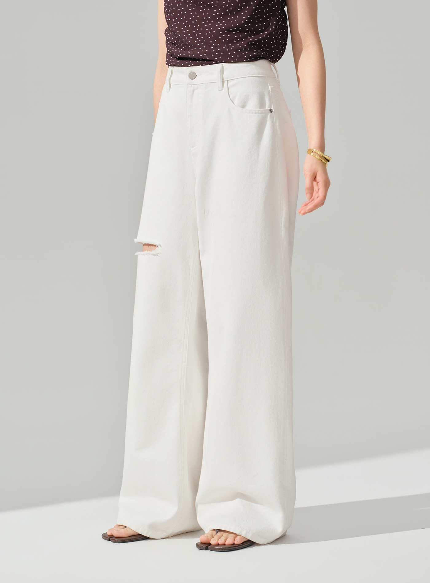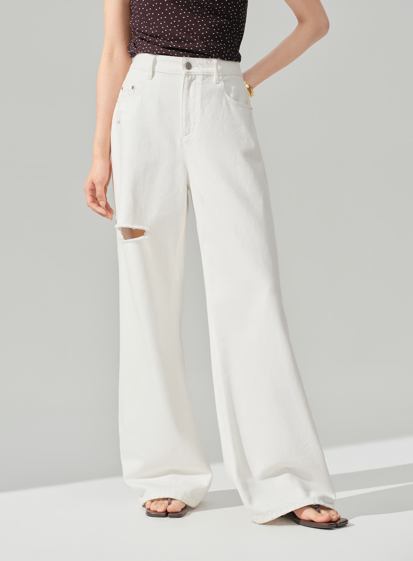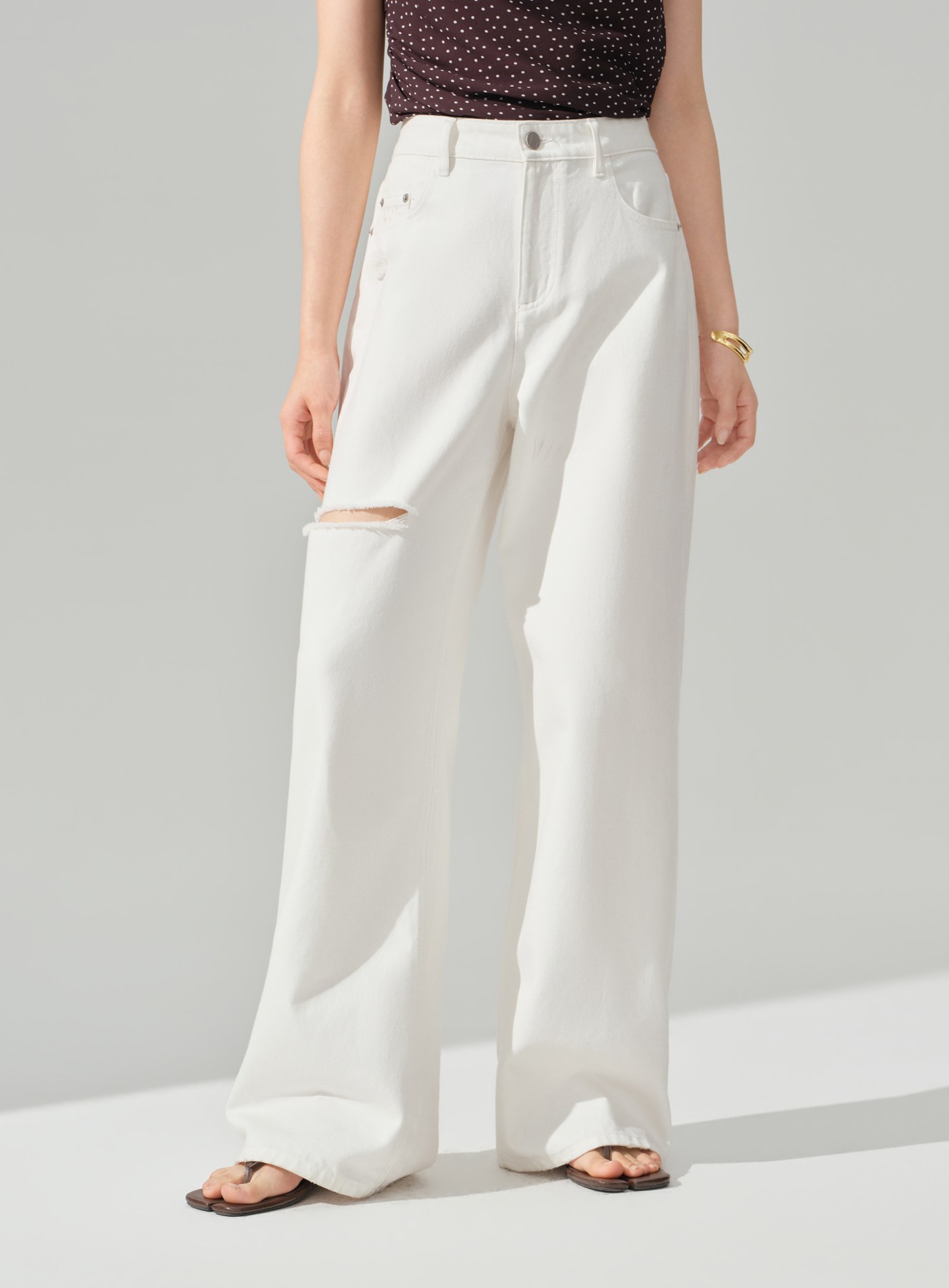 - 前片破洞設計打破白色牛仔的單調印象,破洞內裡採用專屬印花工藝,注入隨性街頭氛圍