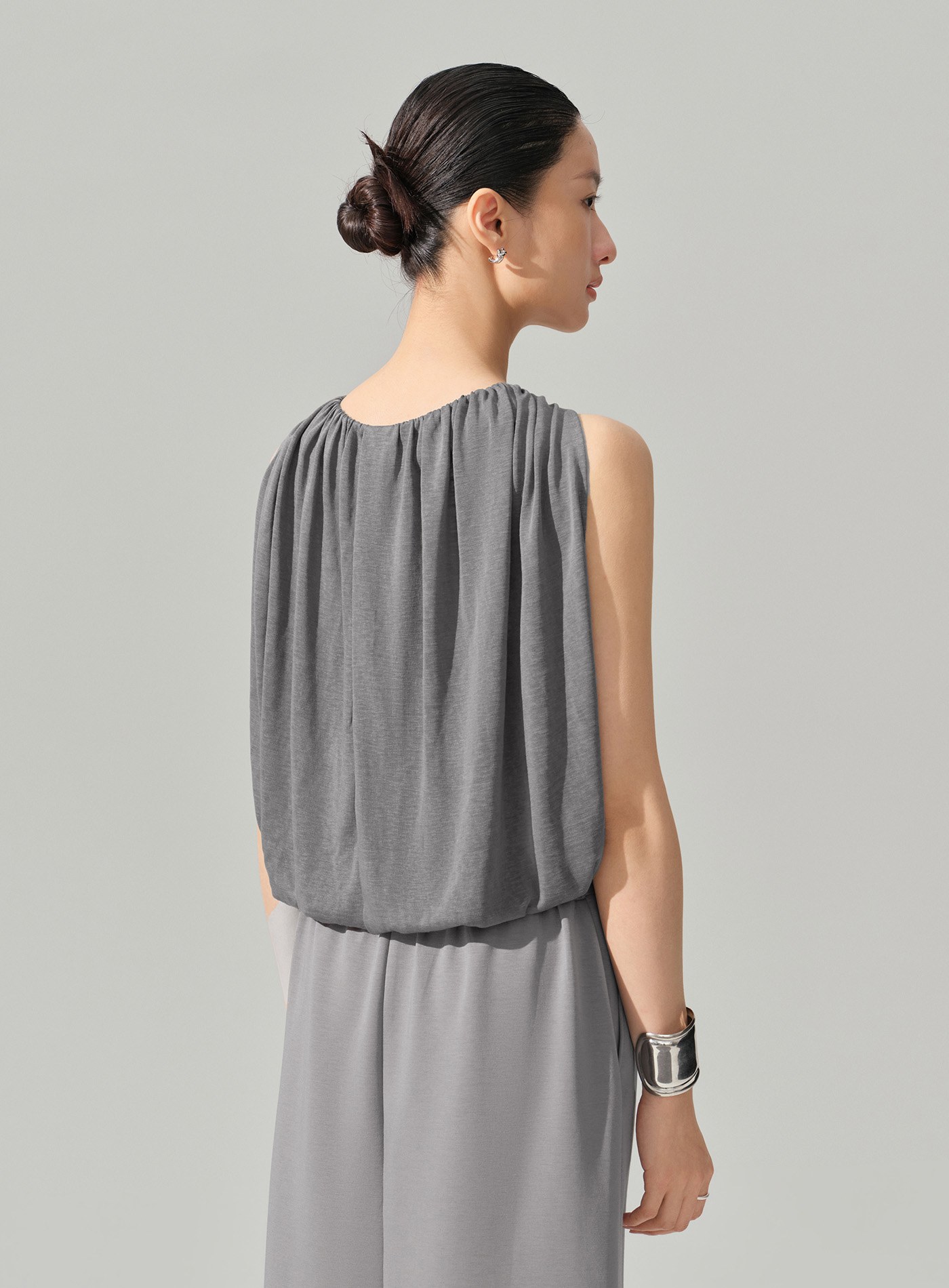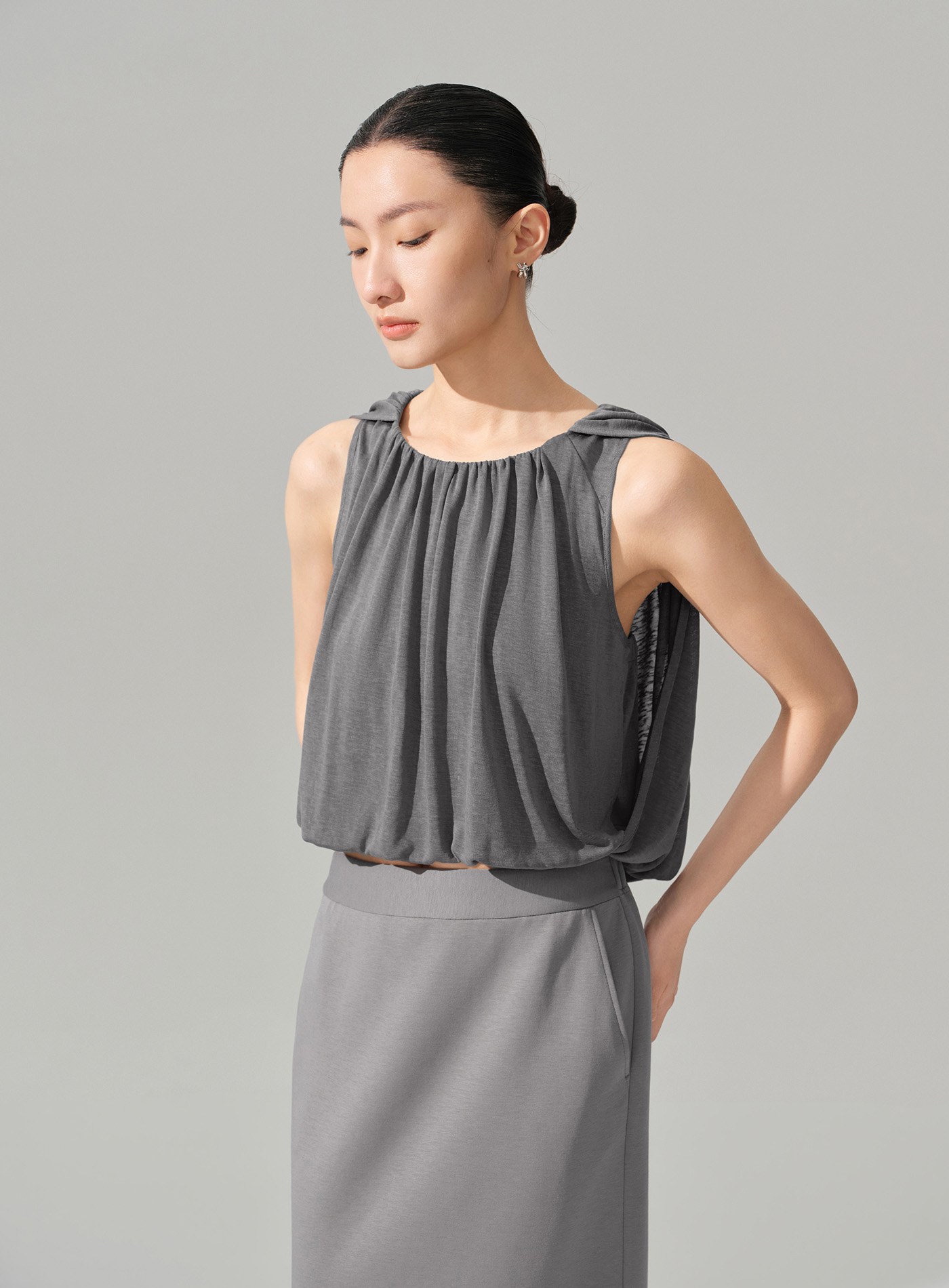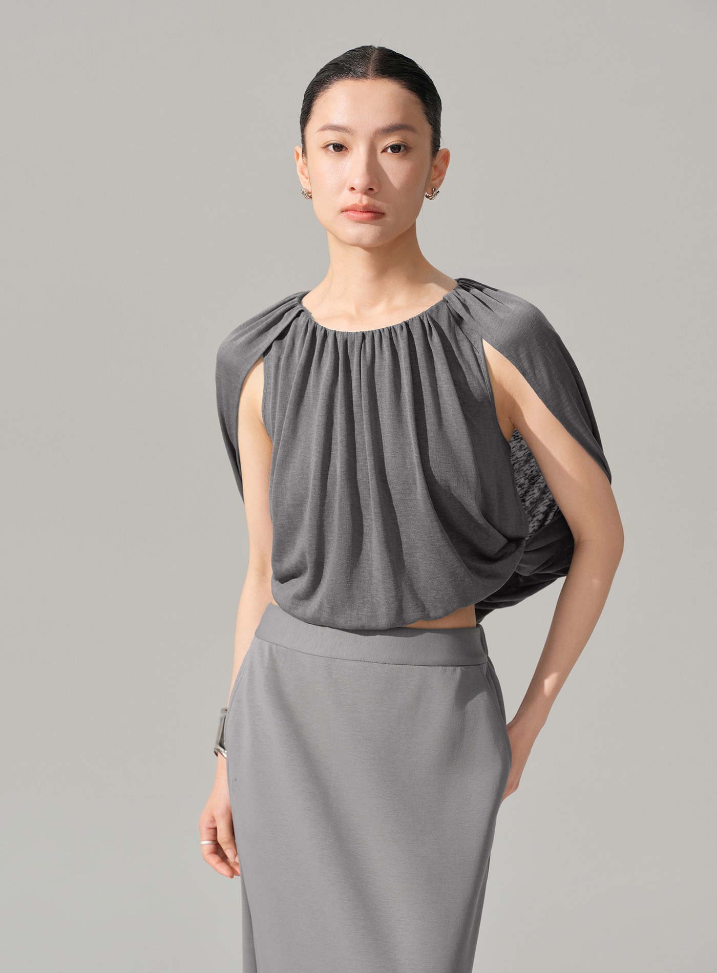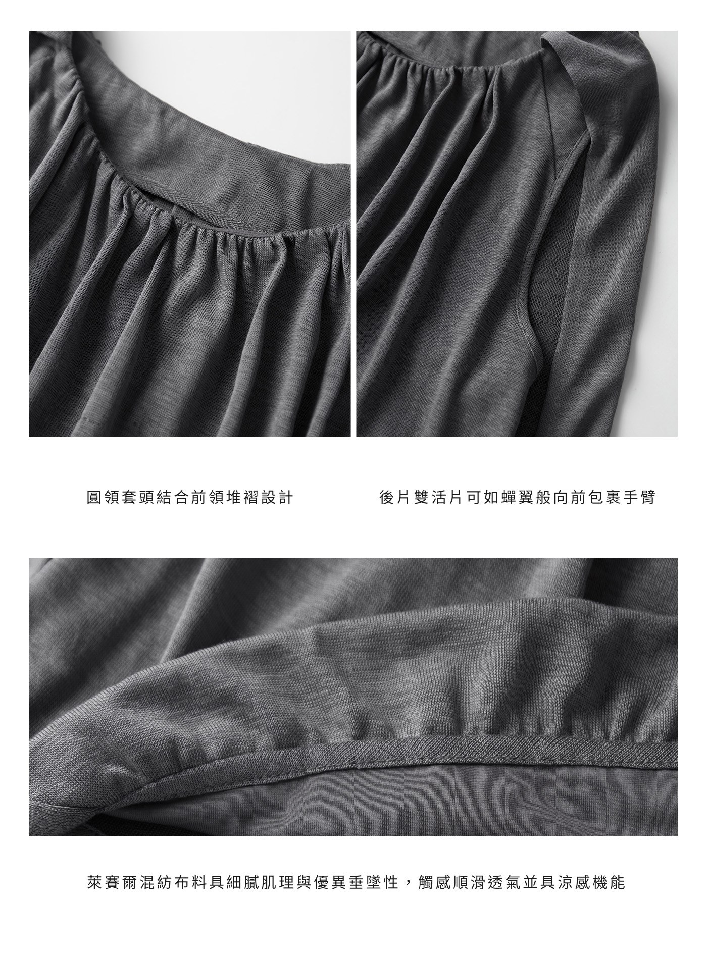 - 以柔軟結構打造輕盈輪廓,圓領套頭設計結合前領堆褶,於上身自然形成立體垂墜層次