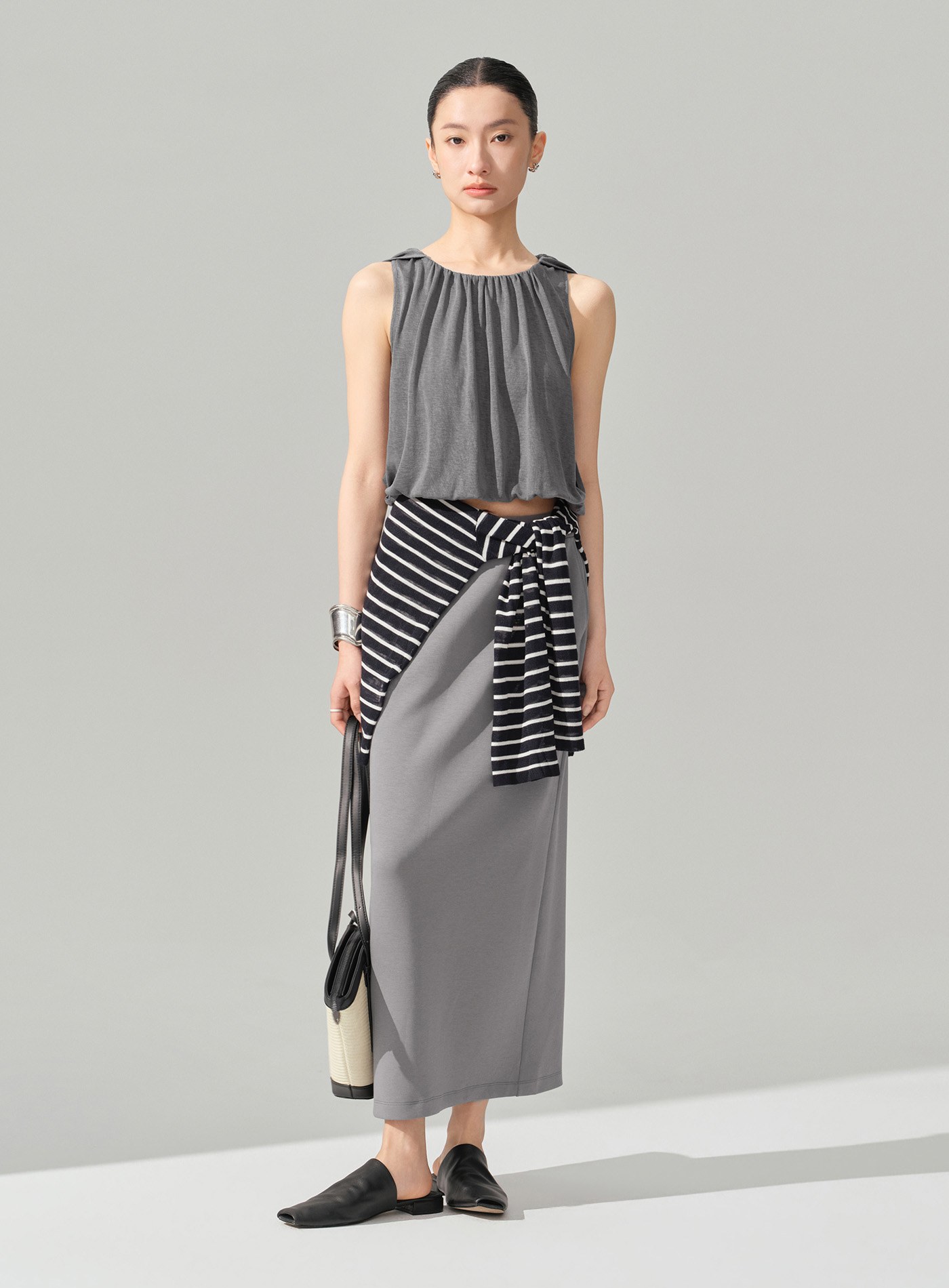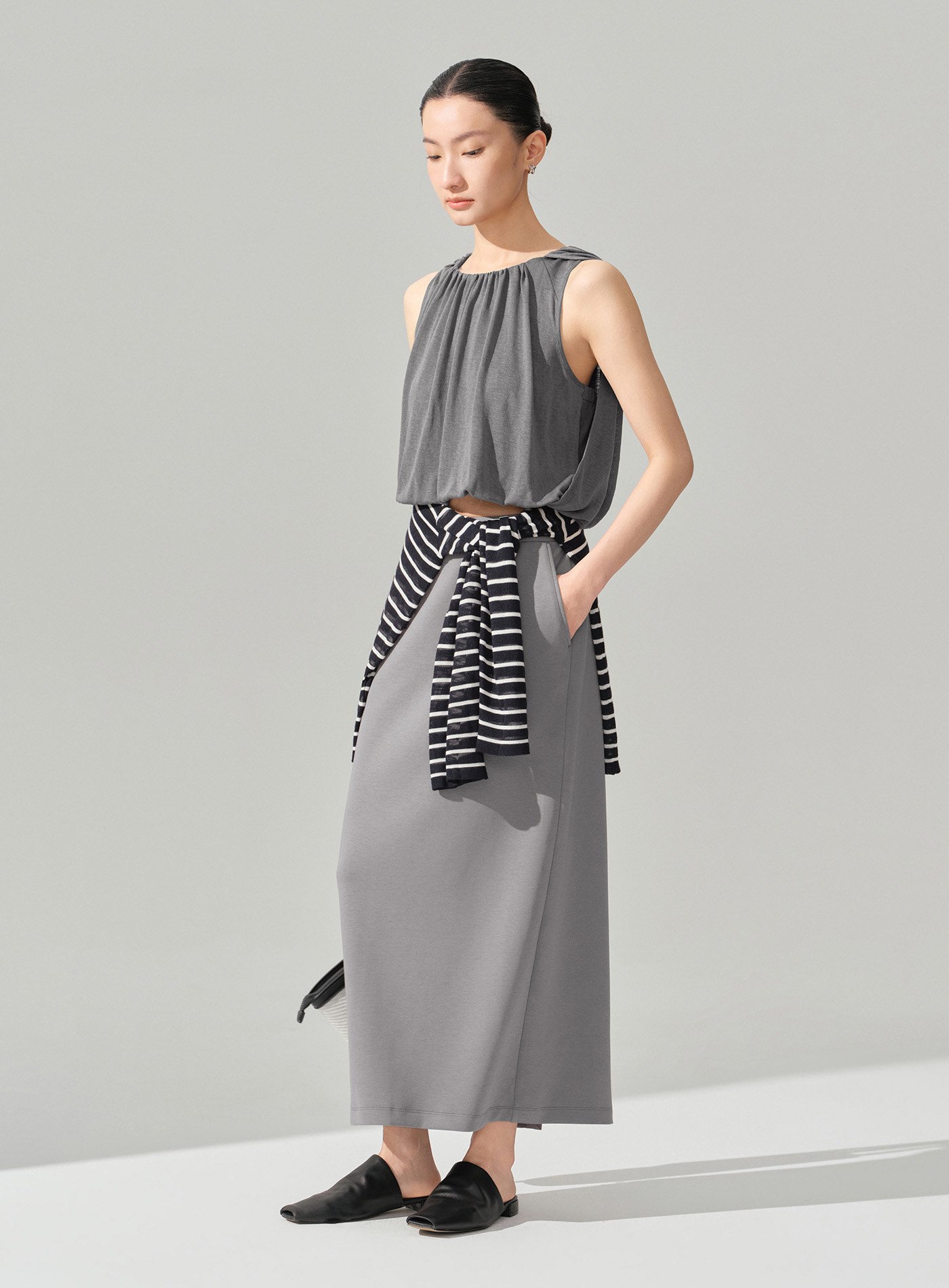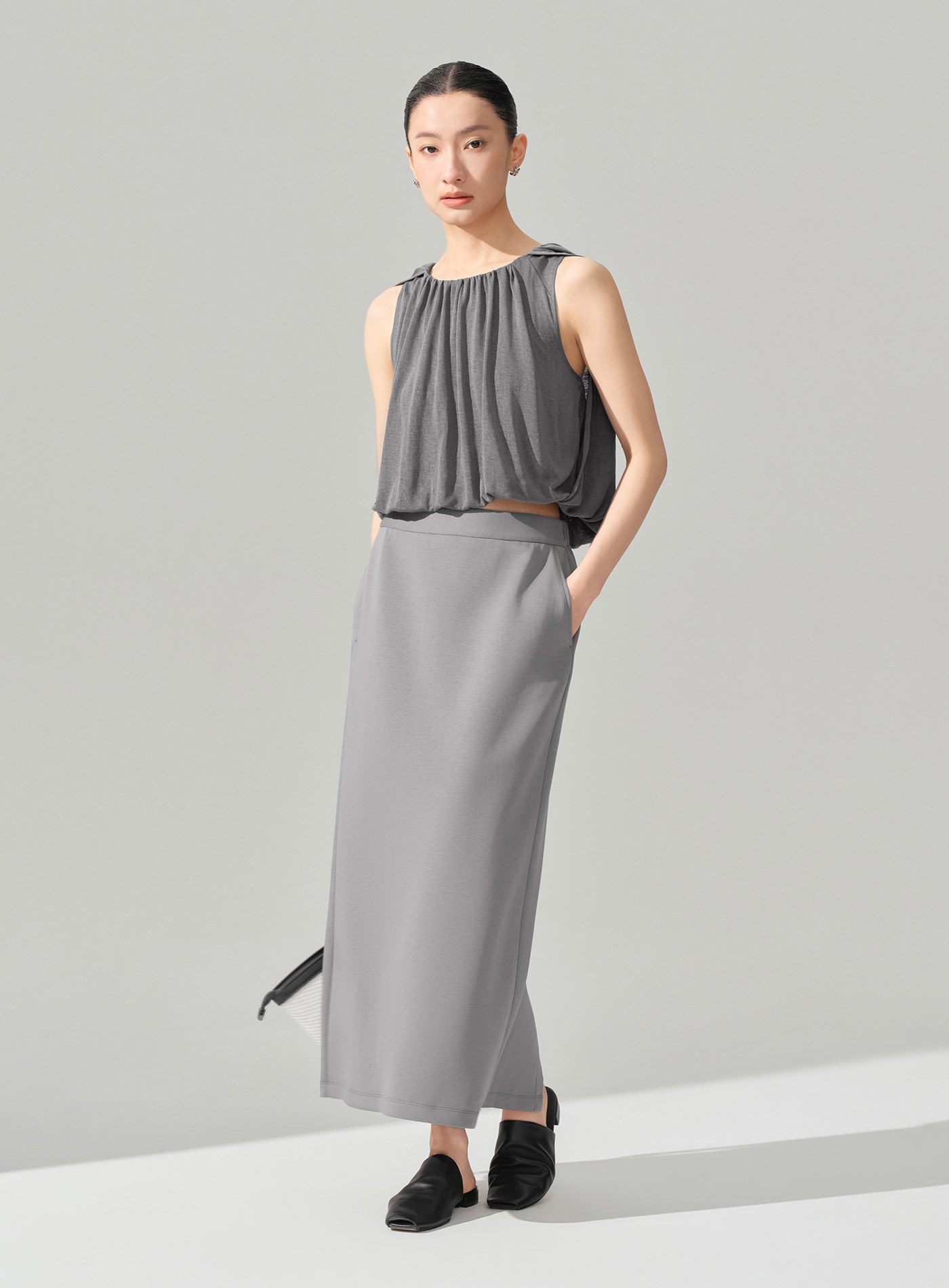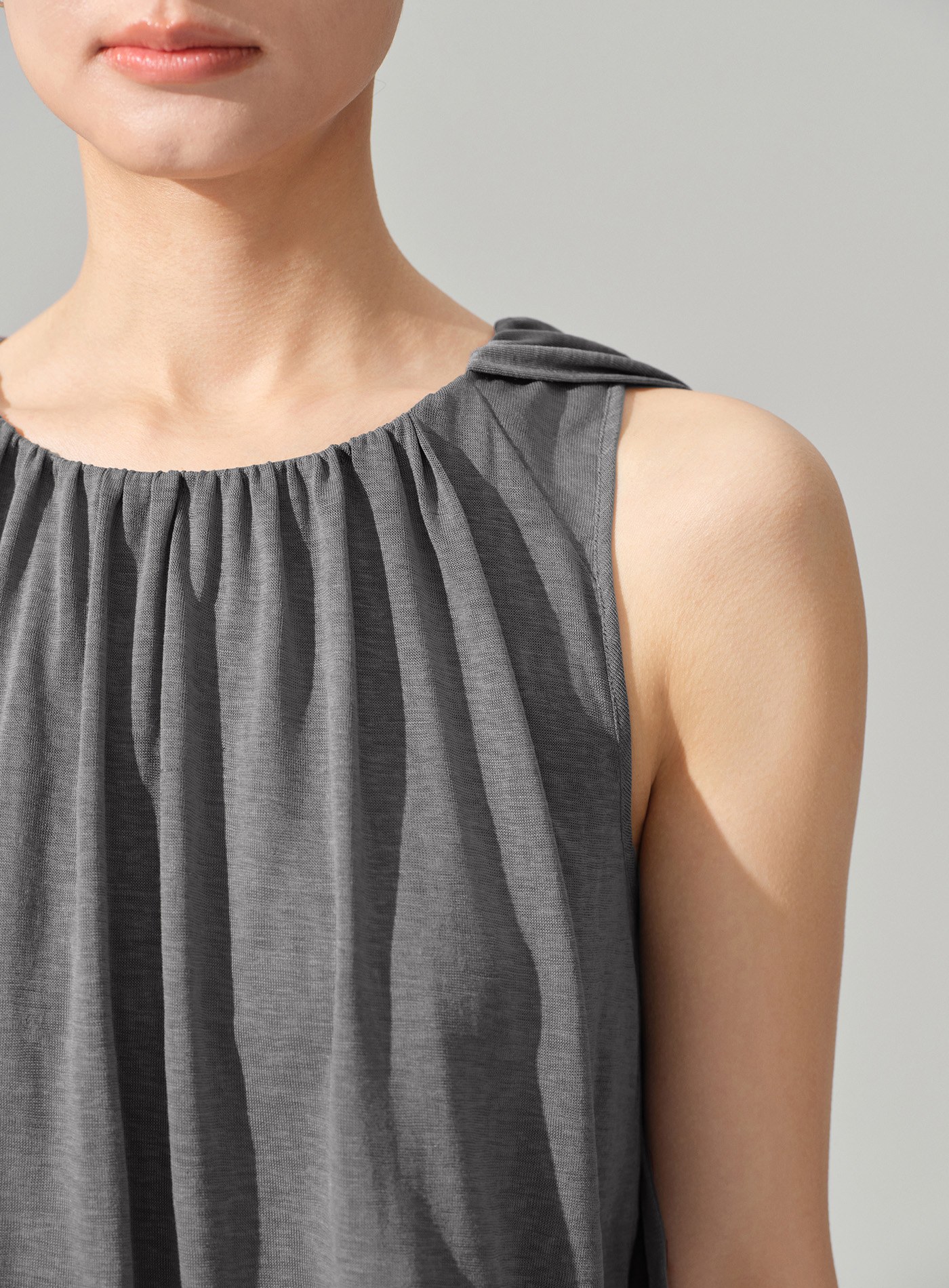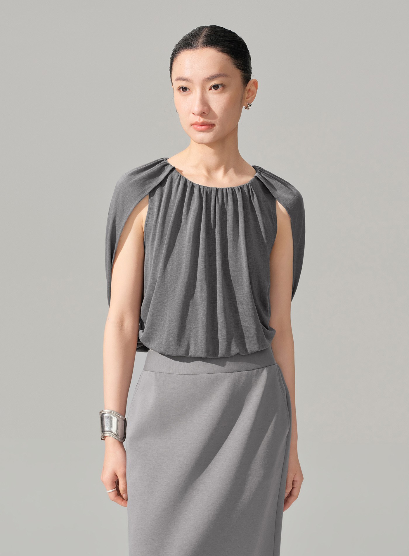 - 以柔軟結構打造輕盈輪廓,圓領套頭設計結合前領堆褶,於上身自然形成立體垂墜層次