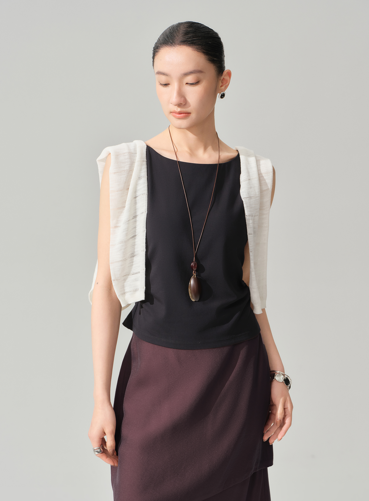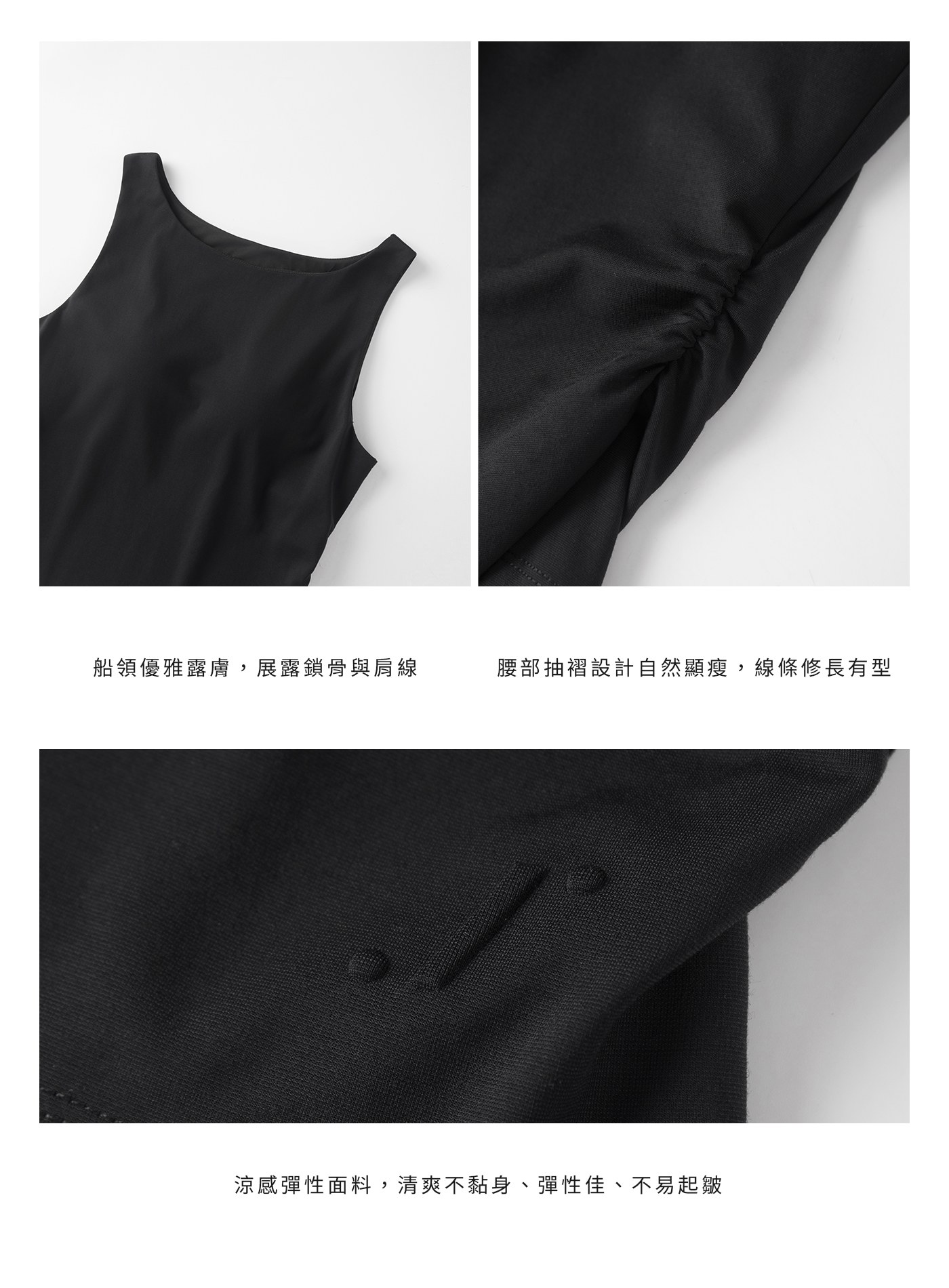 - 船領設計橫向展露鎖骨與肩頸線條,線條優雅俐落