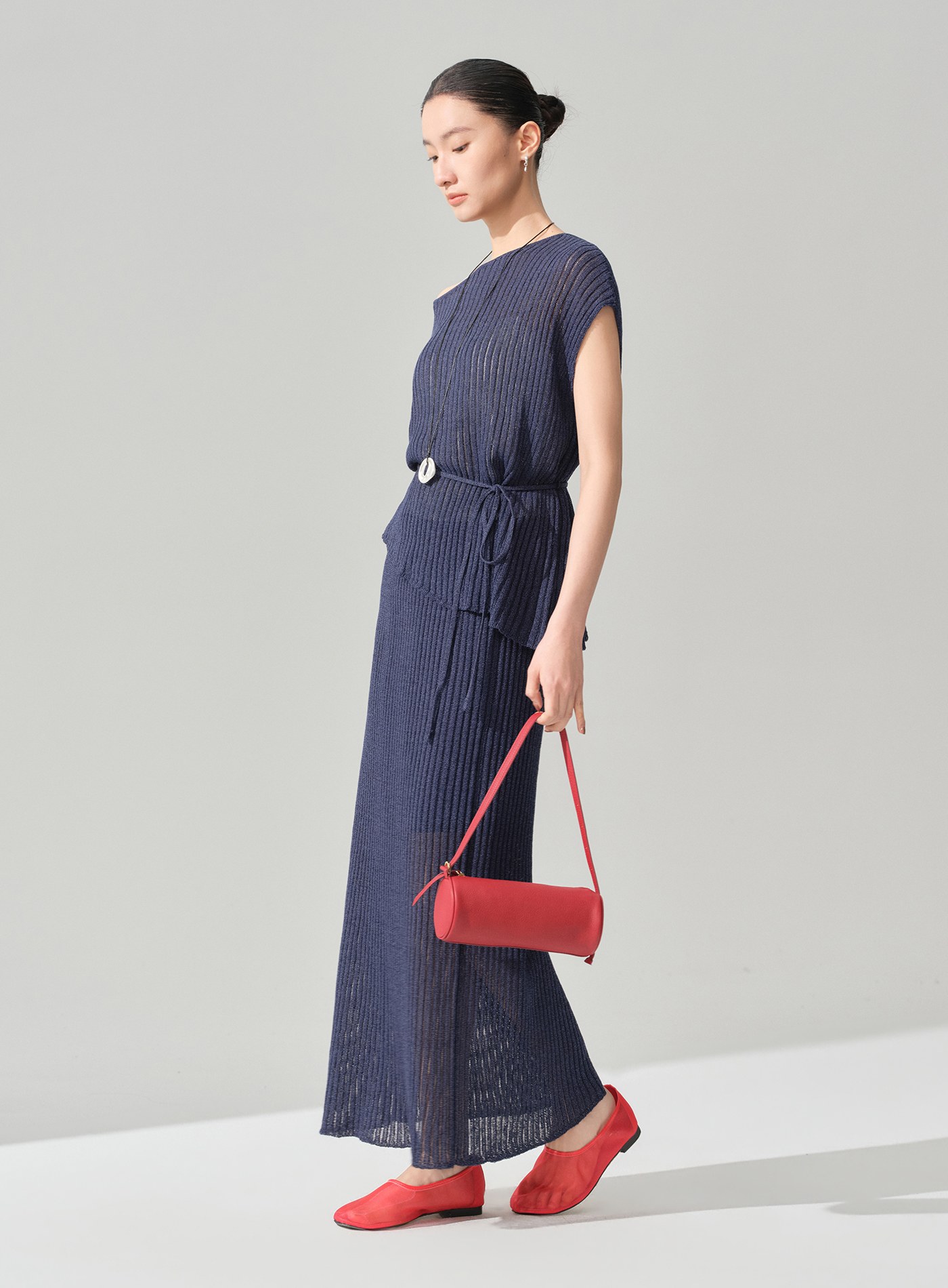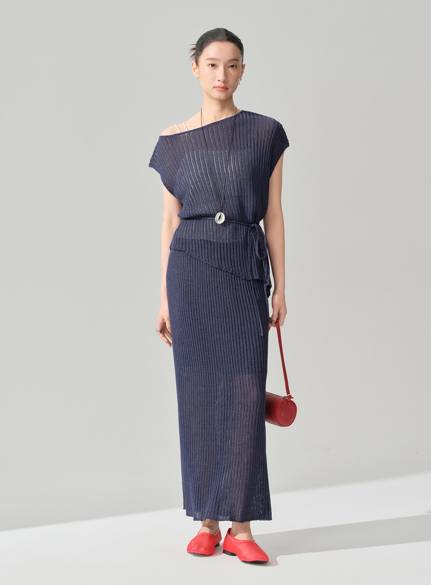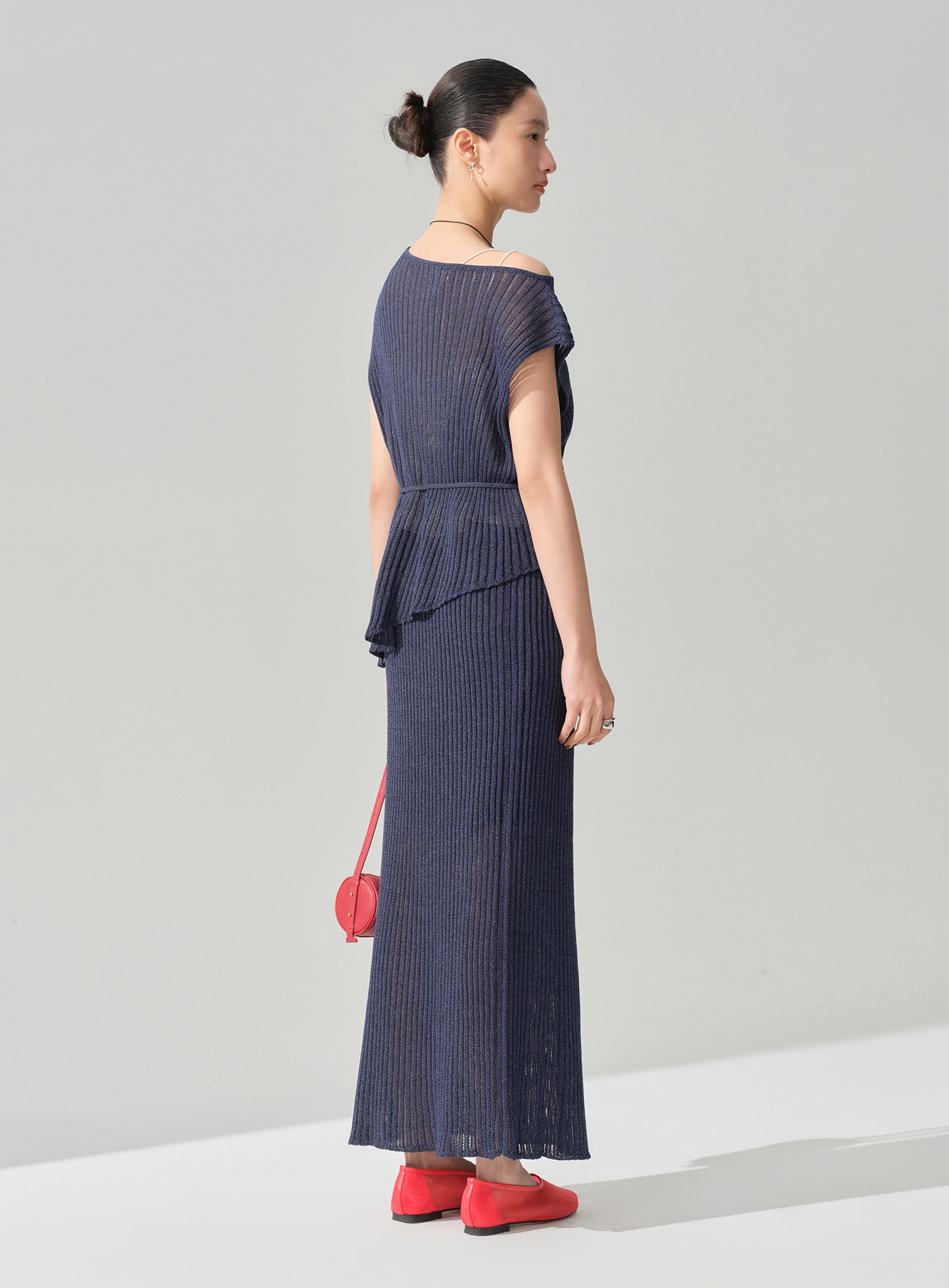 - 下擺採左右不對稱斜切結構,打破制式比例,行走間線條輕盈擺動,更顯隨性靈動