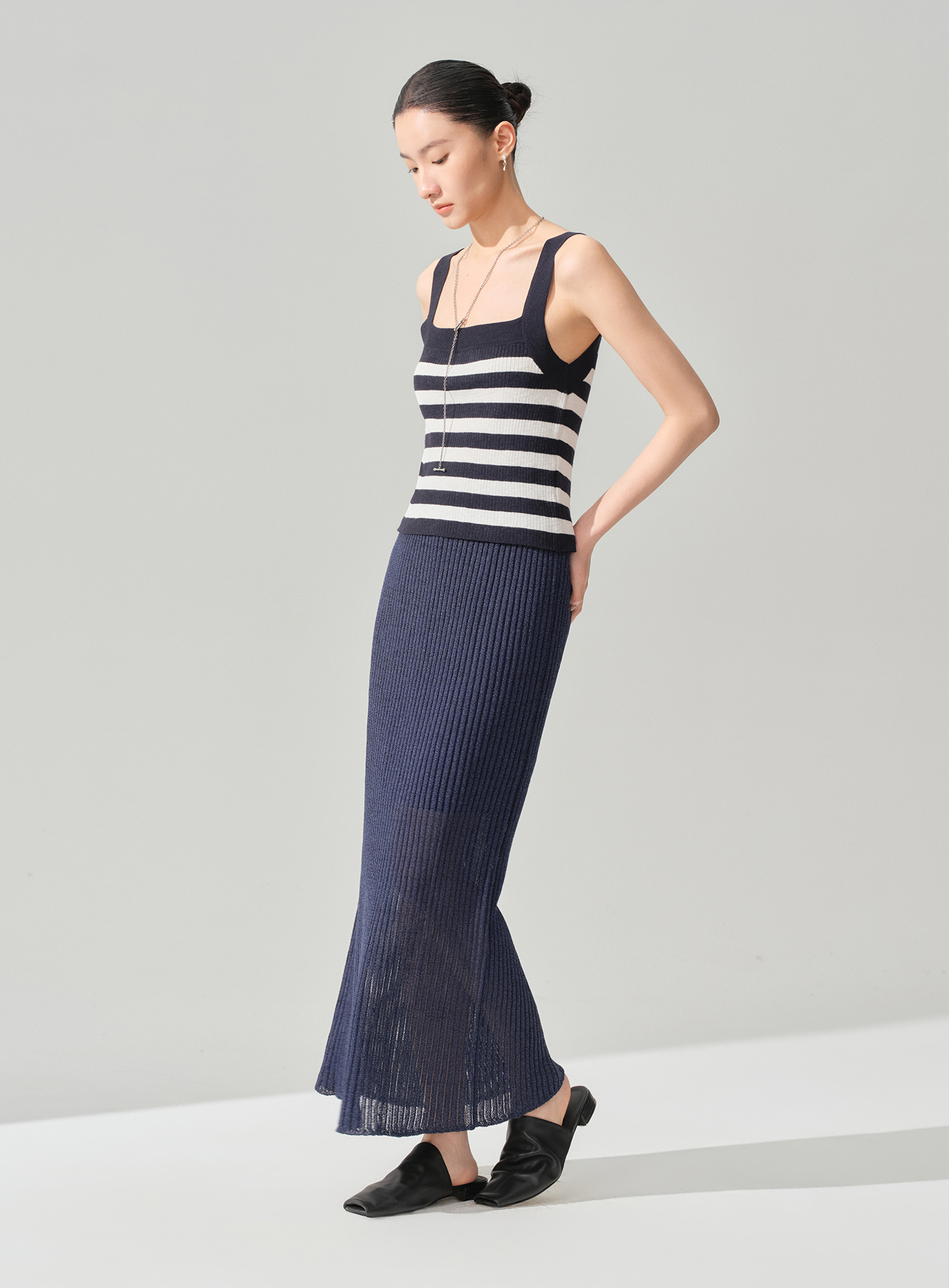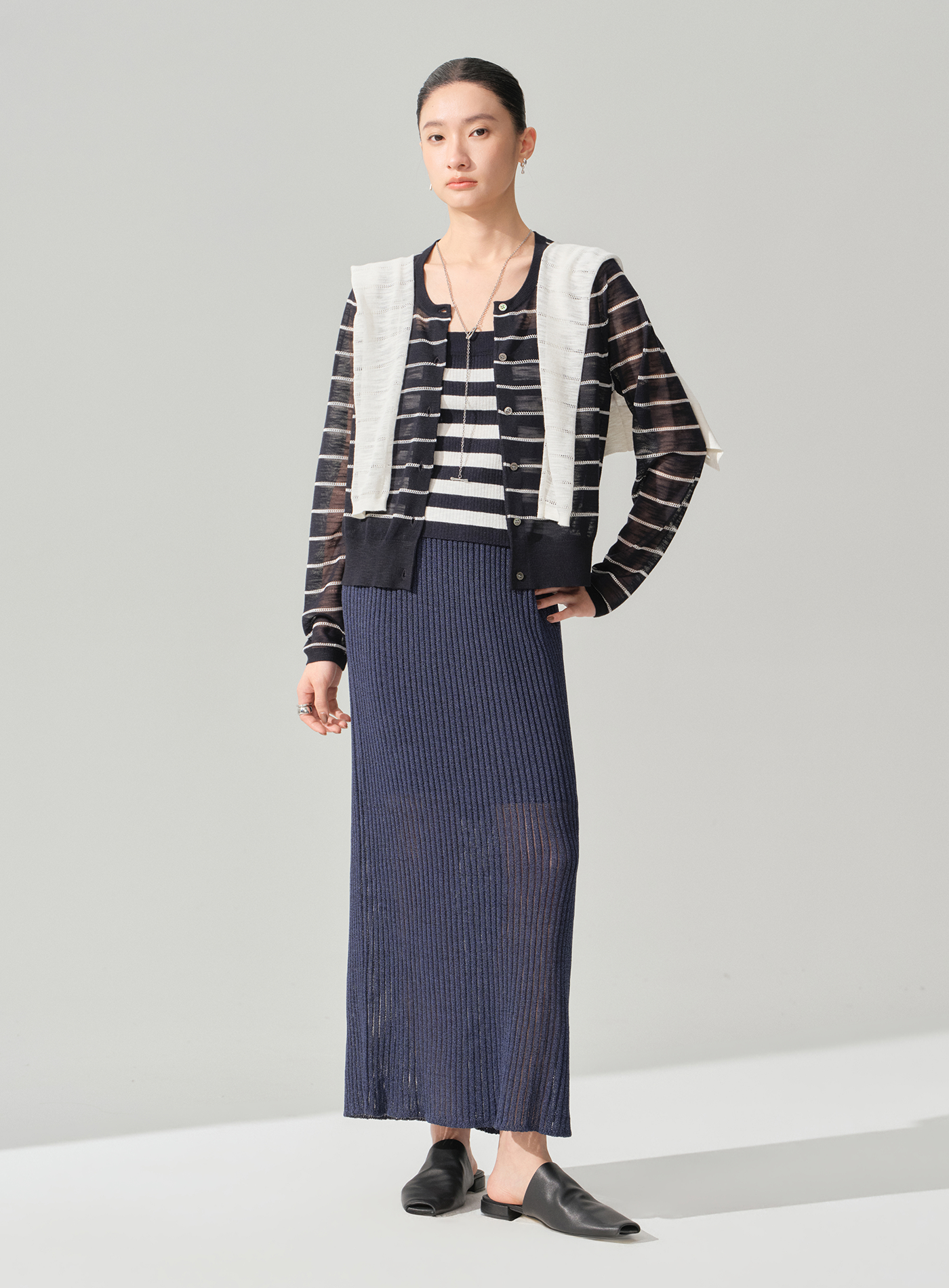 - 以簡約直身裙型為基礎,呈現線條流暢俐落的輪廓,不挑身形且具高度包容度