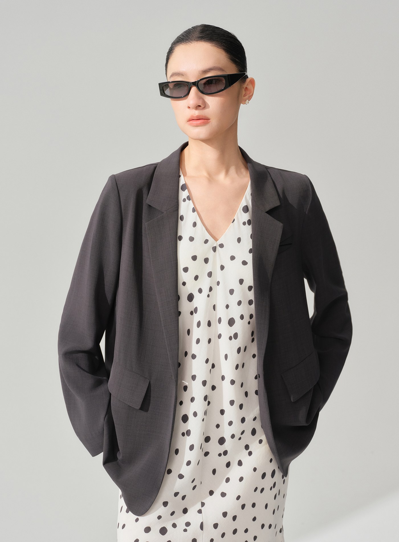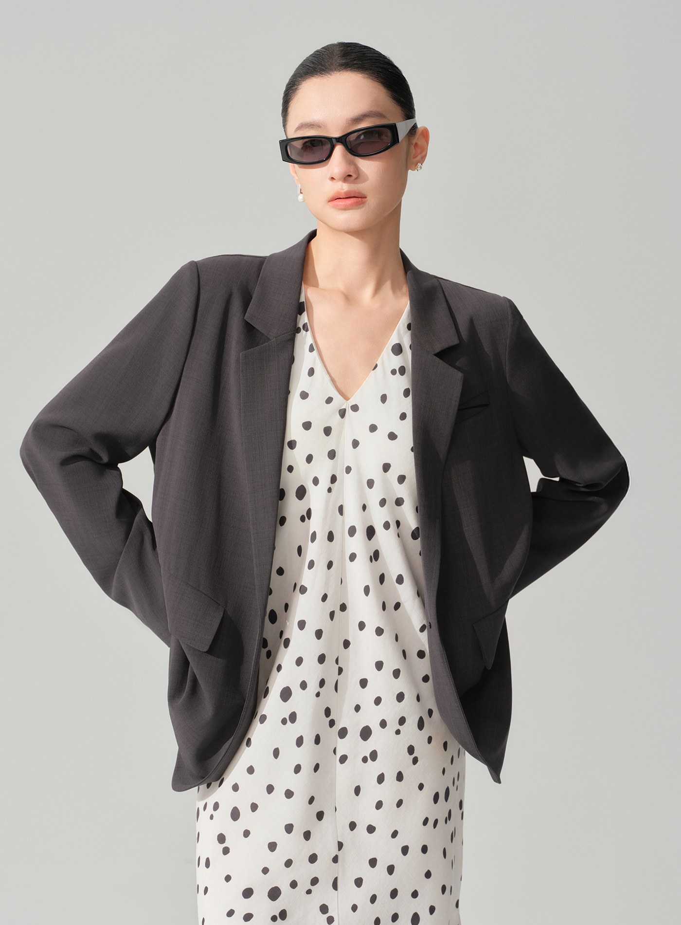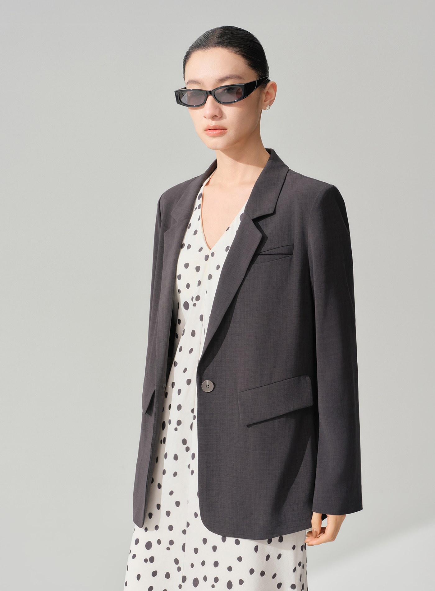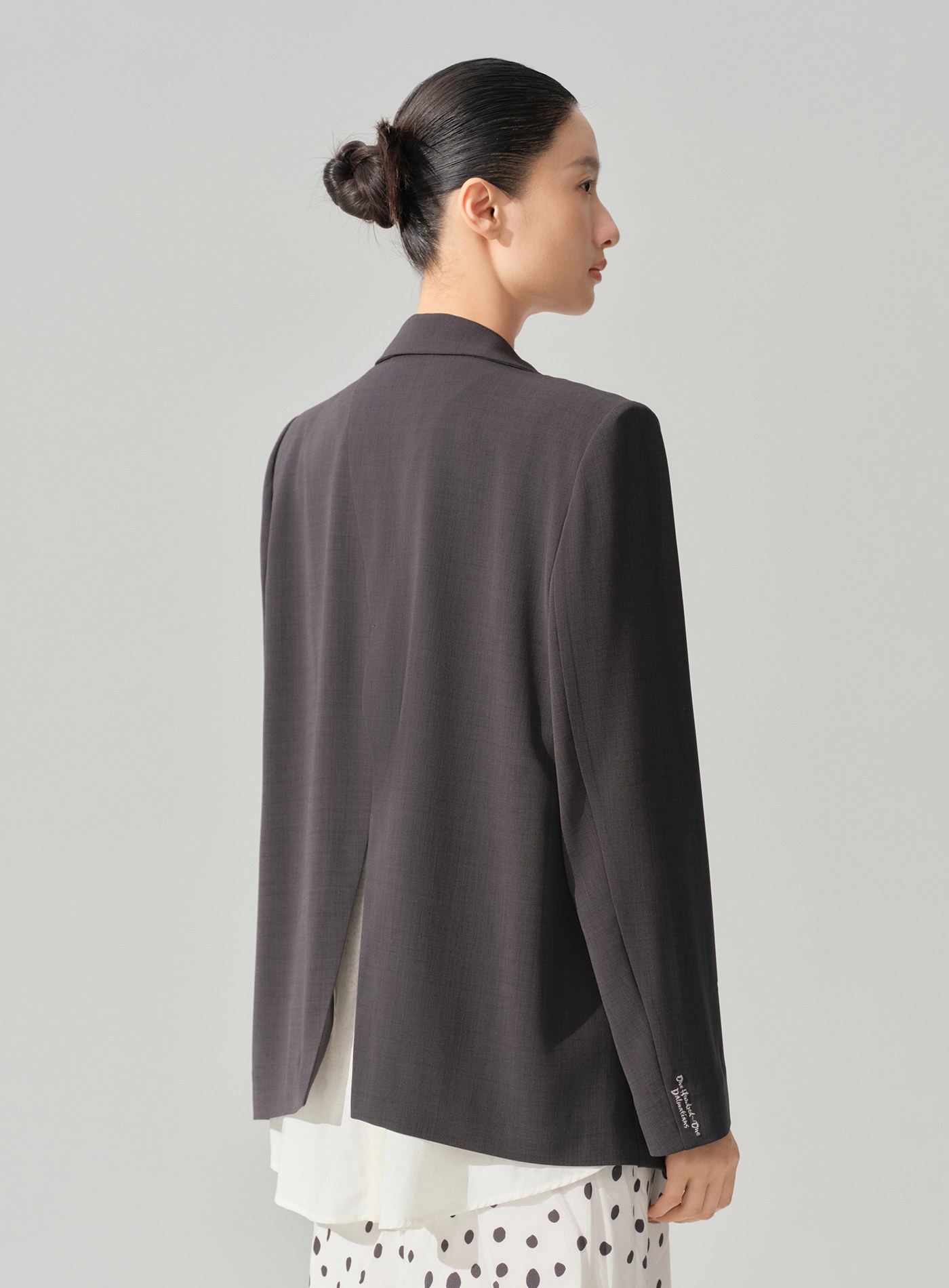 - 襯衫式後背設計模擬「西裝外套內搭襯衫」的疊穿效果,單穿即完成層次造型,無需額外搭配也能展現鬆弛感