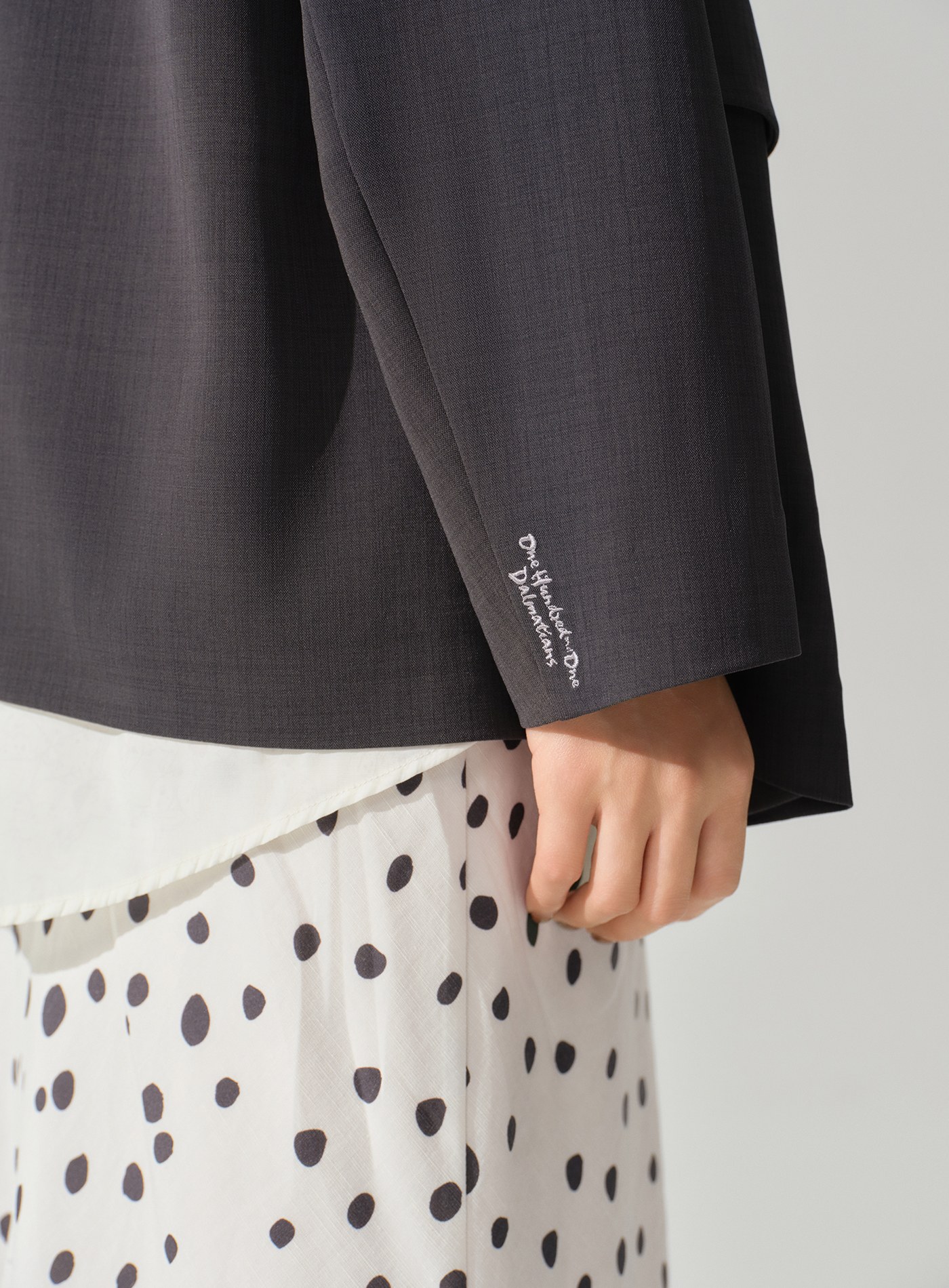 - 袖口處低調點綴《101 忠狗》主題刺繡,圖案小巧精緻,在極簡西裝輪廓中融入巧思,不張揚卻具辨識度