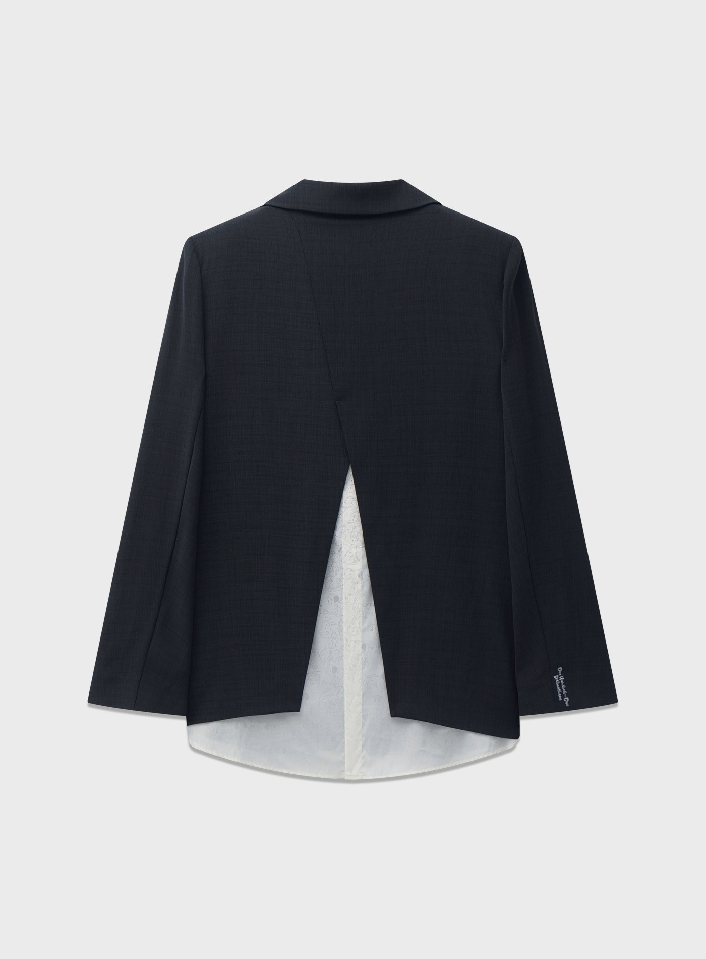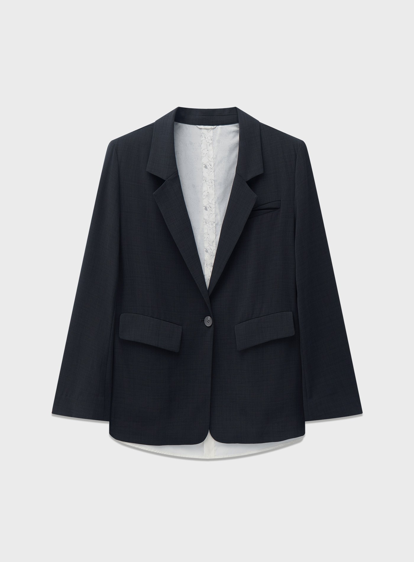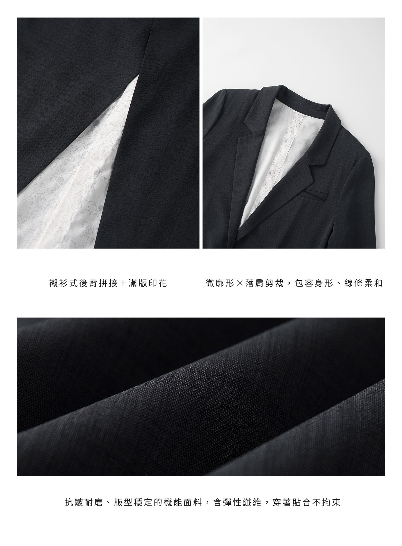 - 後背採用襯衫式拼接結構,內裡呈現滿版印花,將童趣元素隱藏於俐落西裝外觀之下,形成層次分明的視覺對比