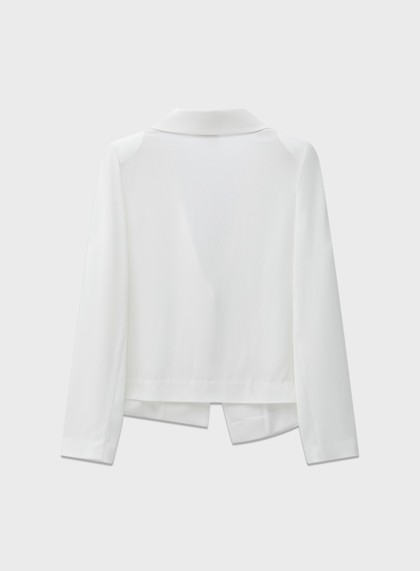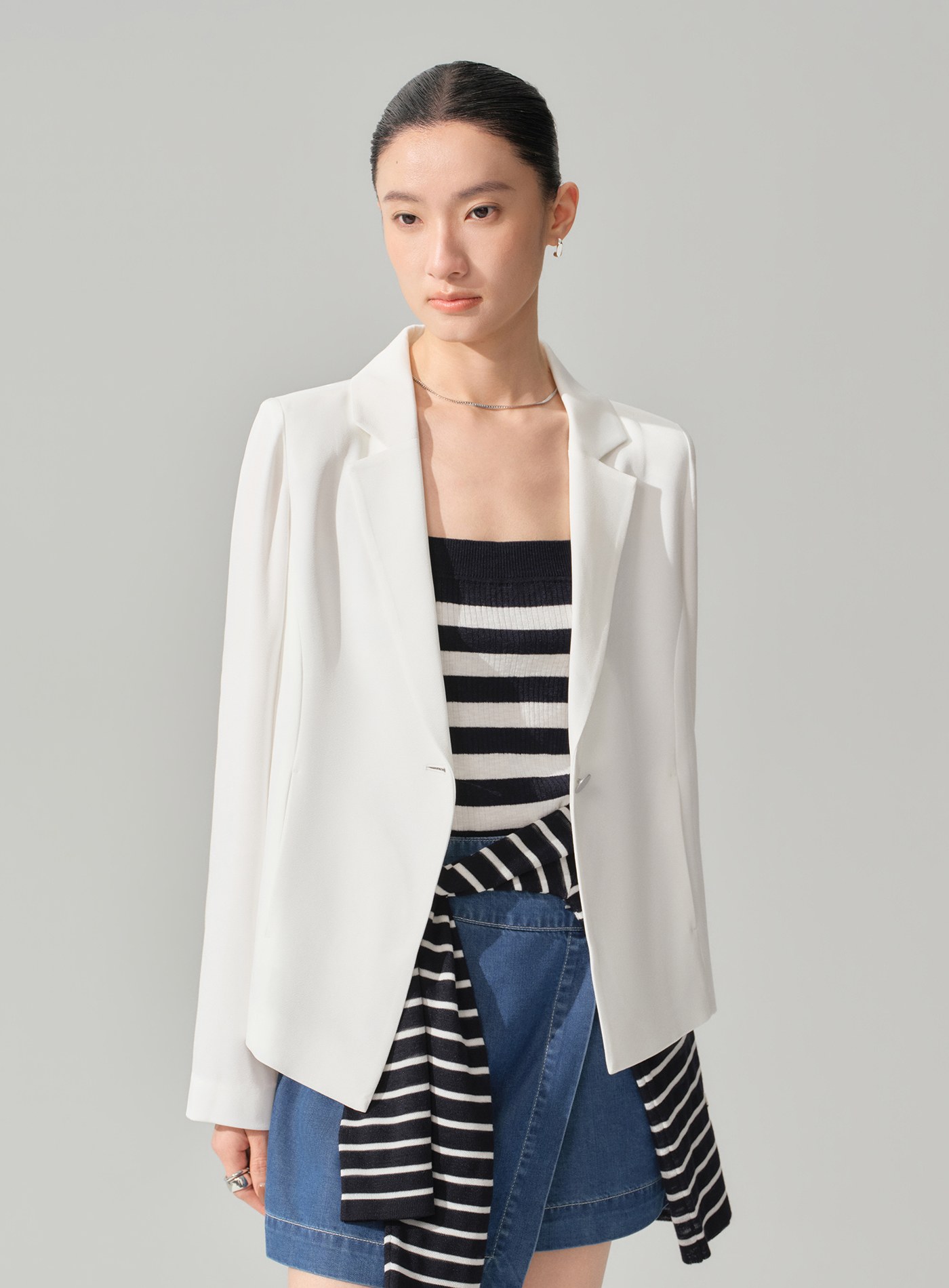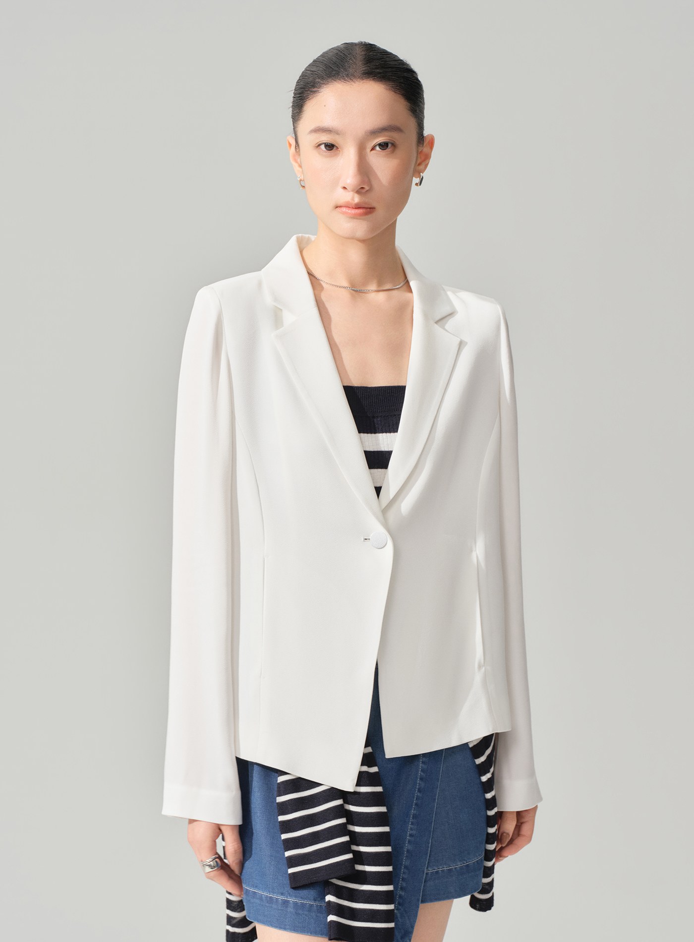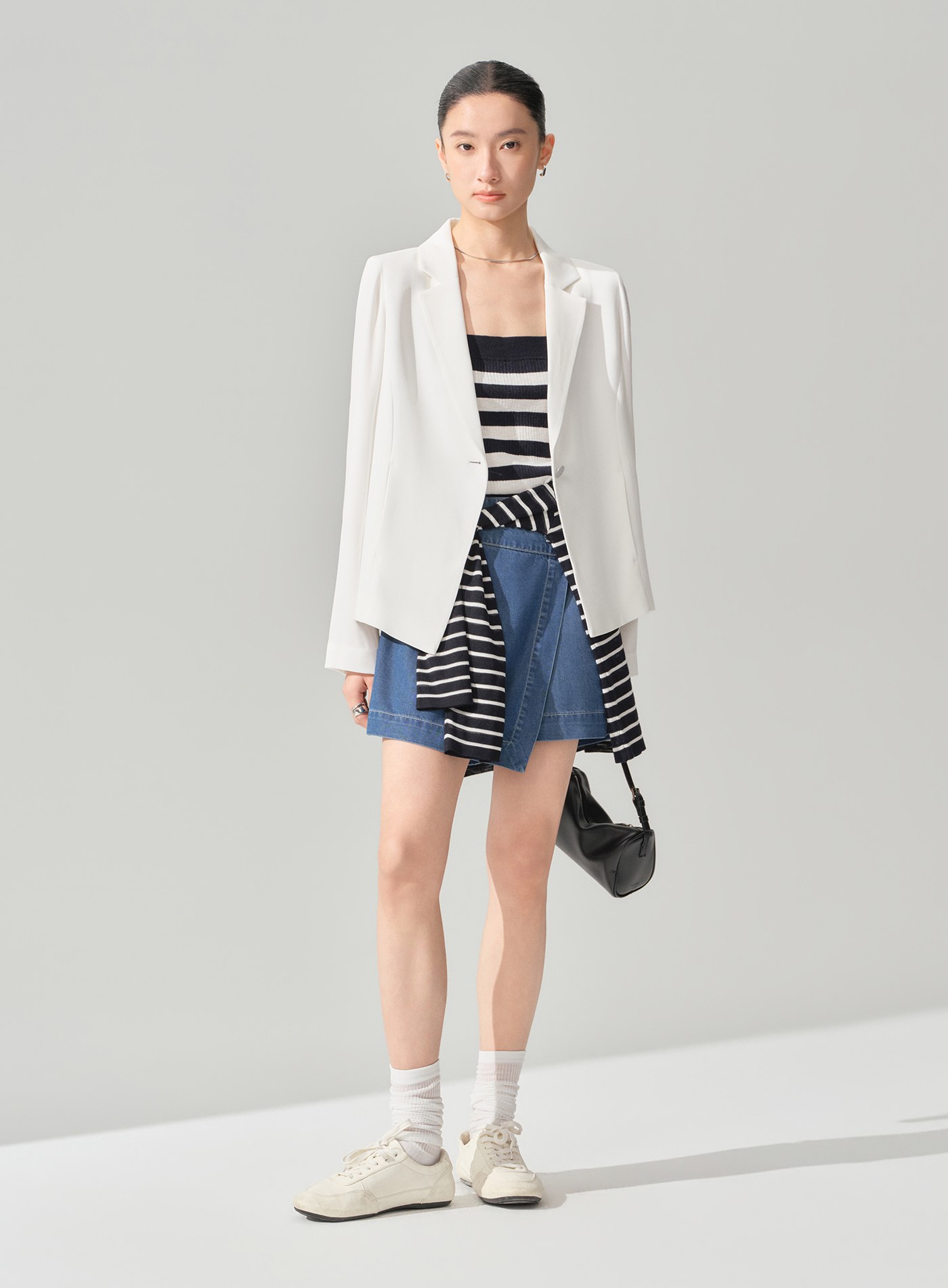 - 不對稱下擺設計打破常規輪廓,搭配一顆簡約銀色金屬扣,線條乾淨俐落,展現現代感