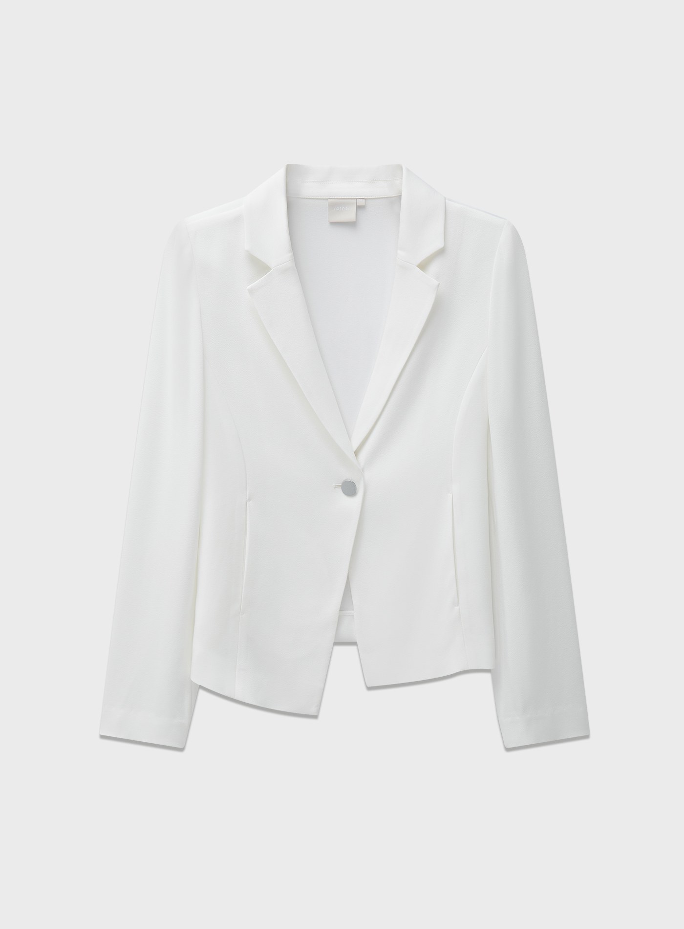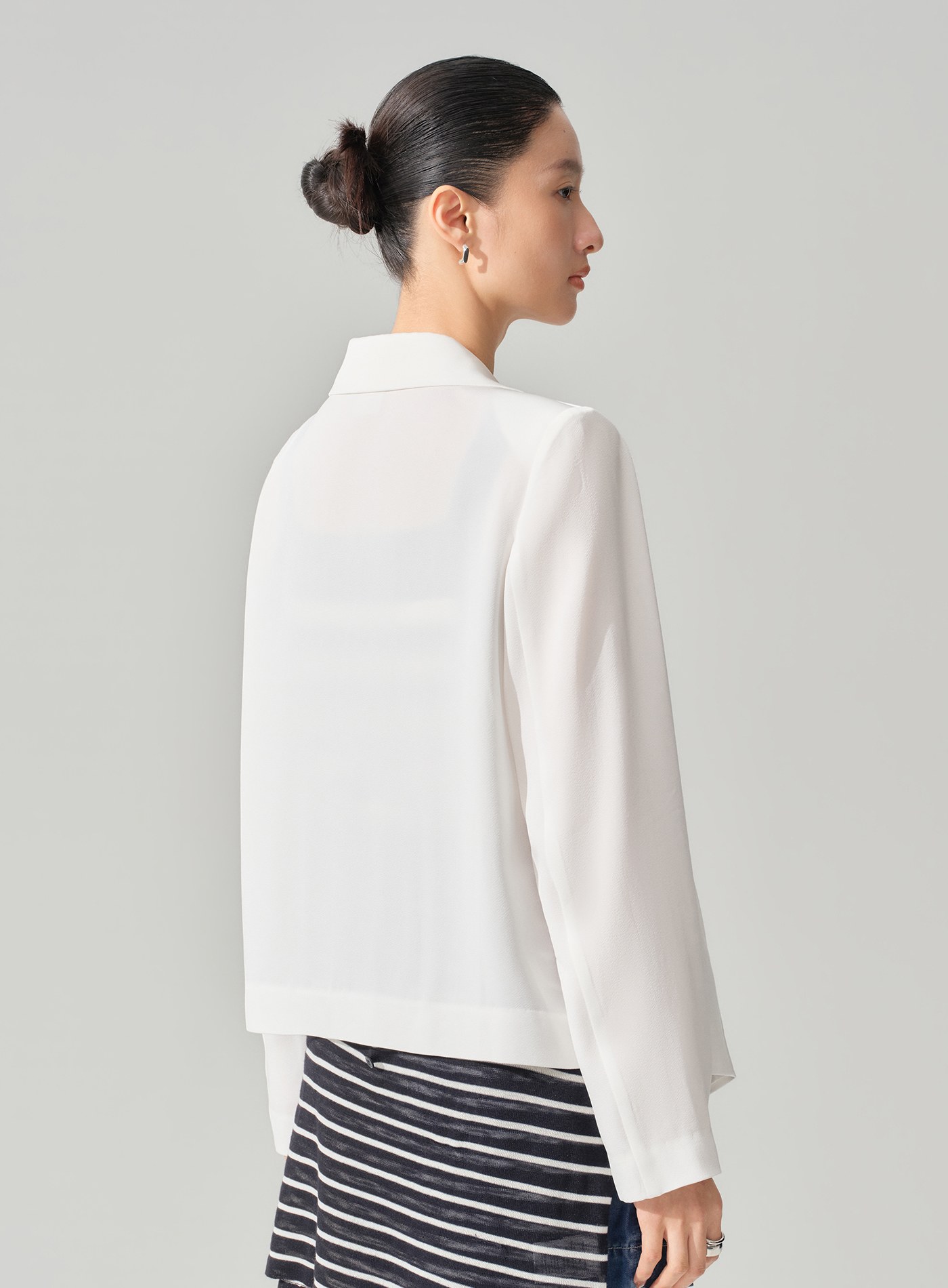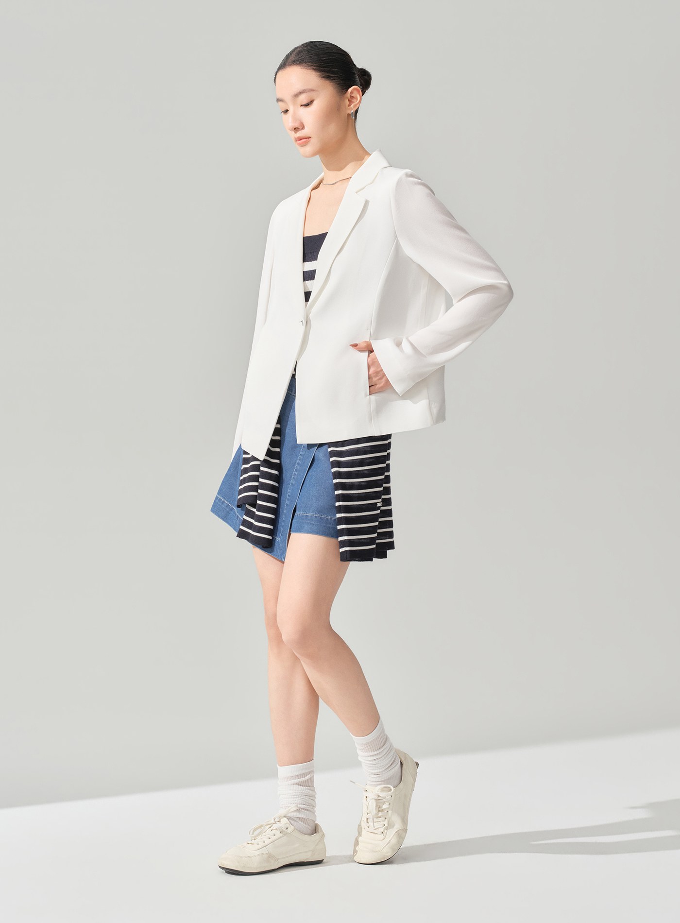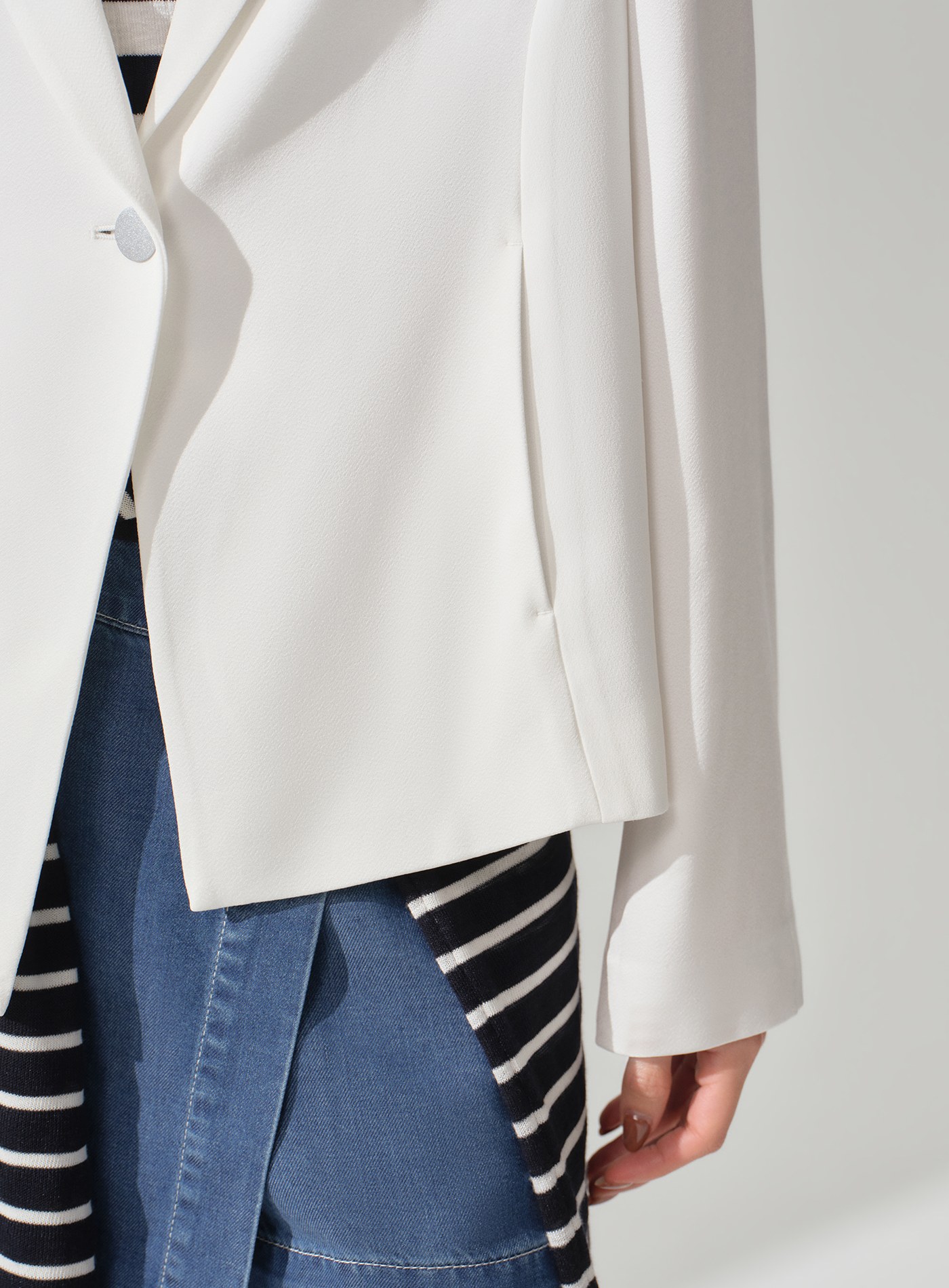 - 不對稱下擺設計打破常規輪廓,搭配一顆簡約銀色金屬扣,線條乾淨俐落,展現現代感