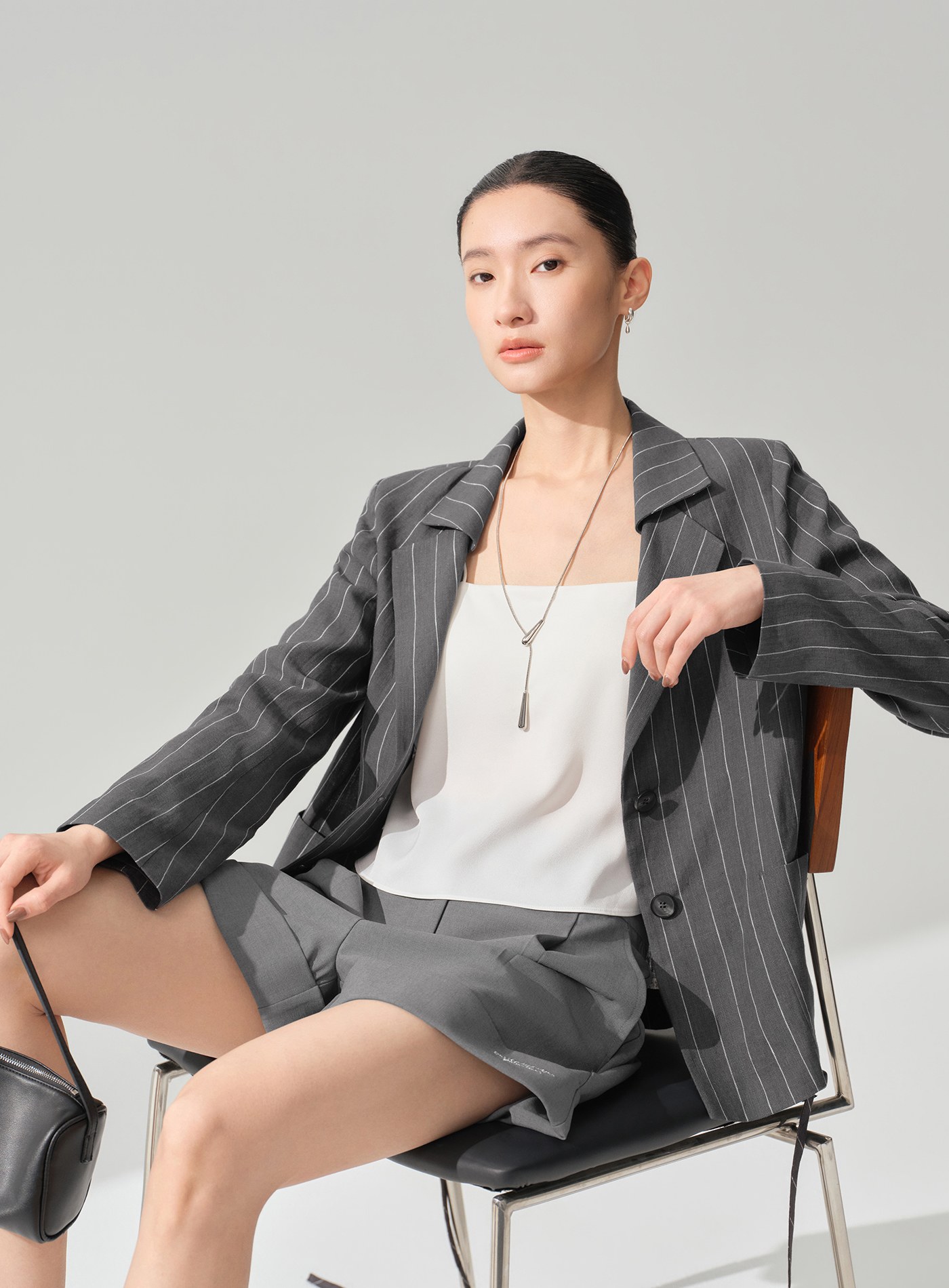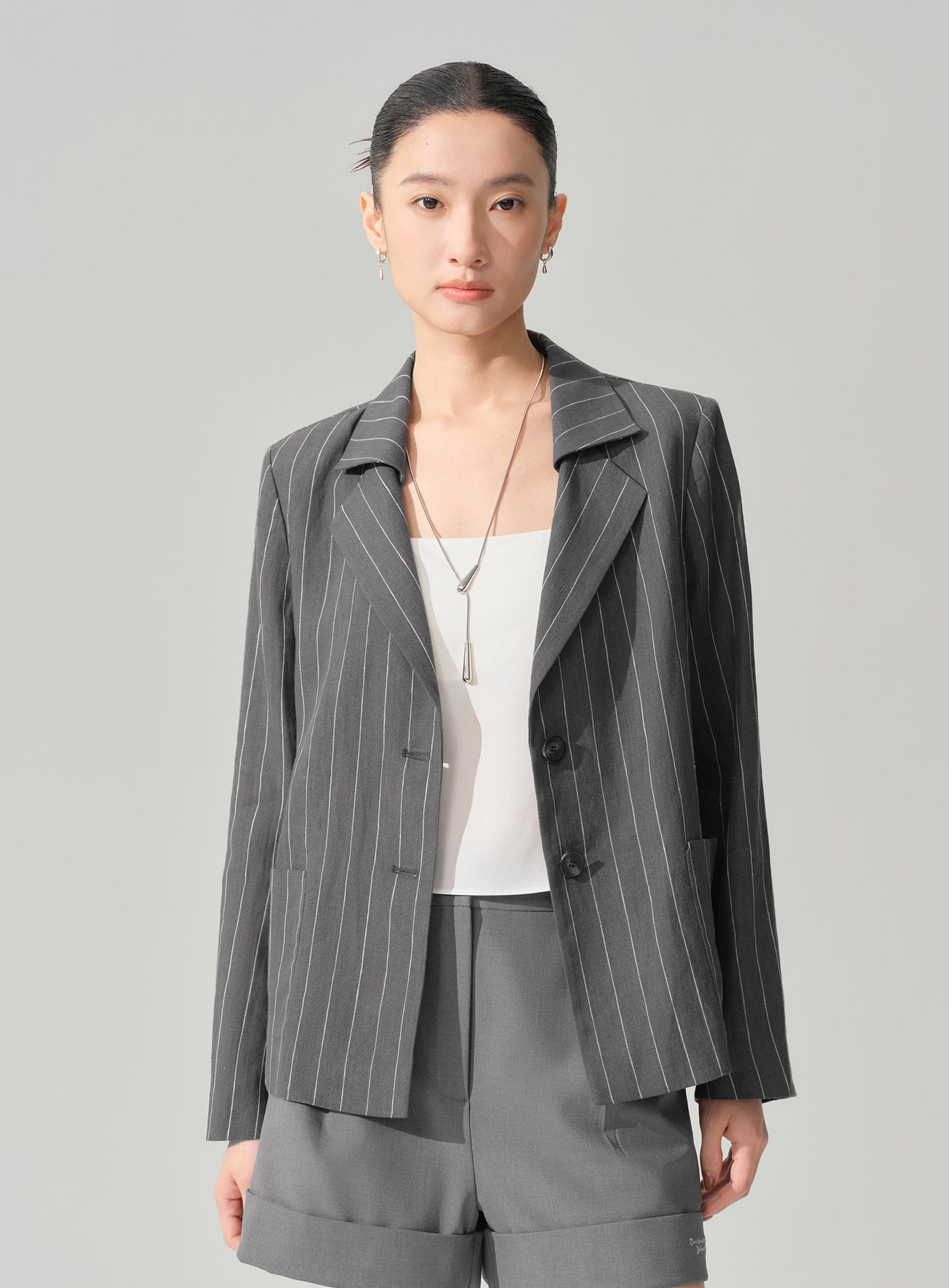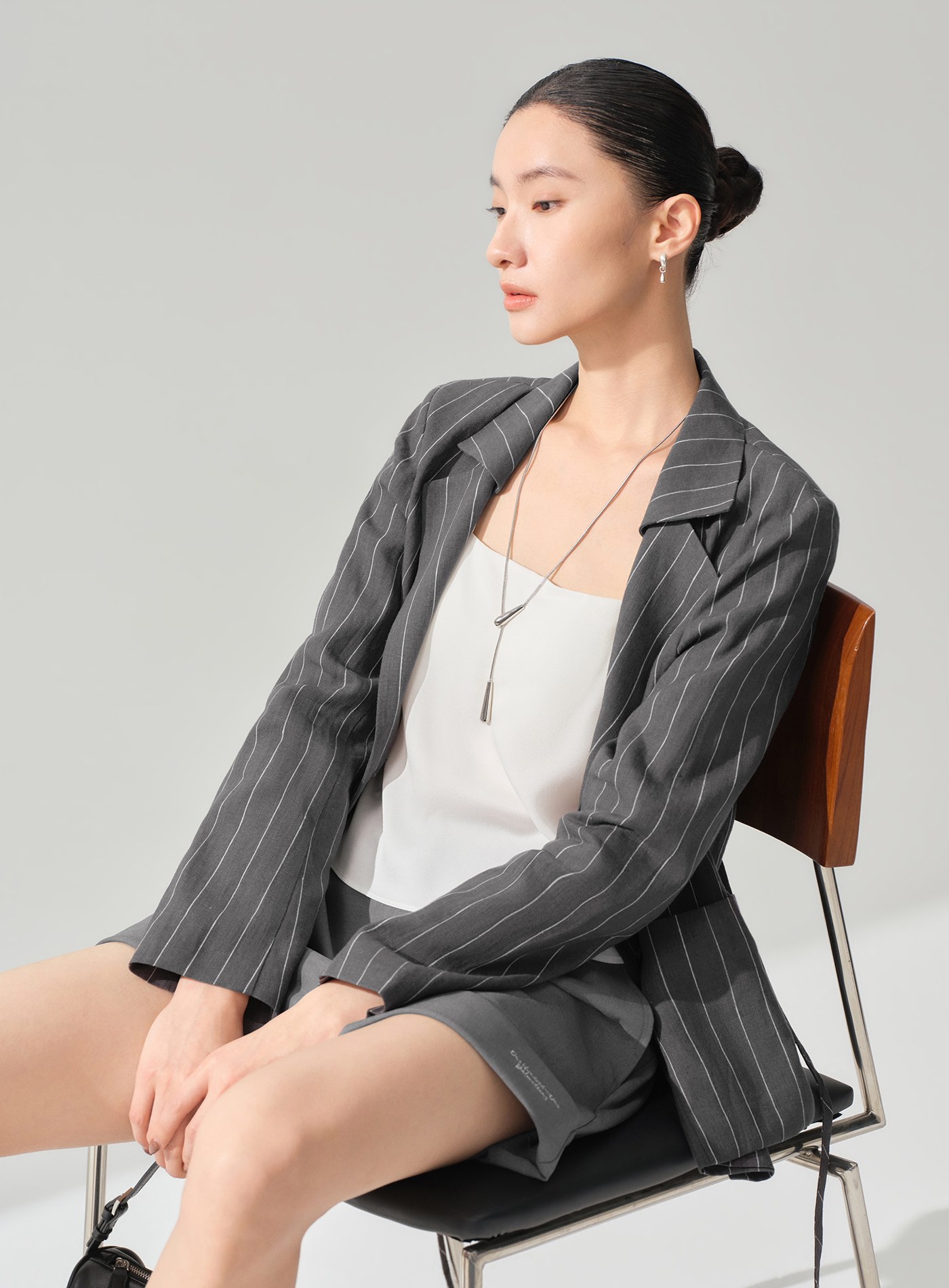 - 雙外翻領結合兩顆扣設計,承襲經典西裝語彙,俐落衣長有效拉高比例,修飾整體身形