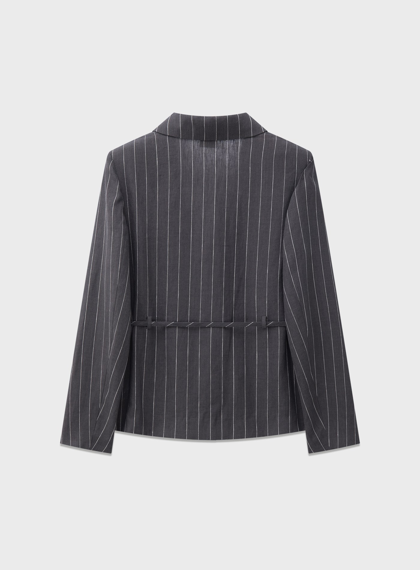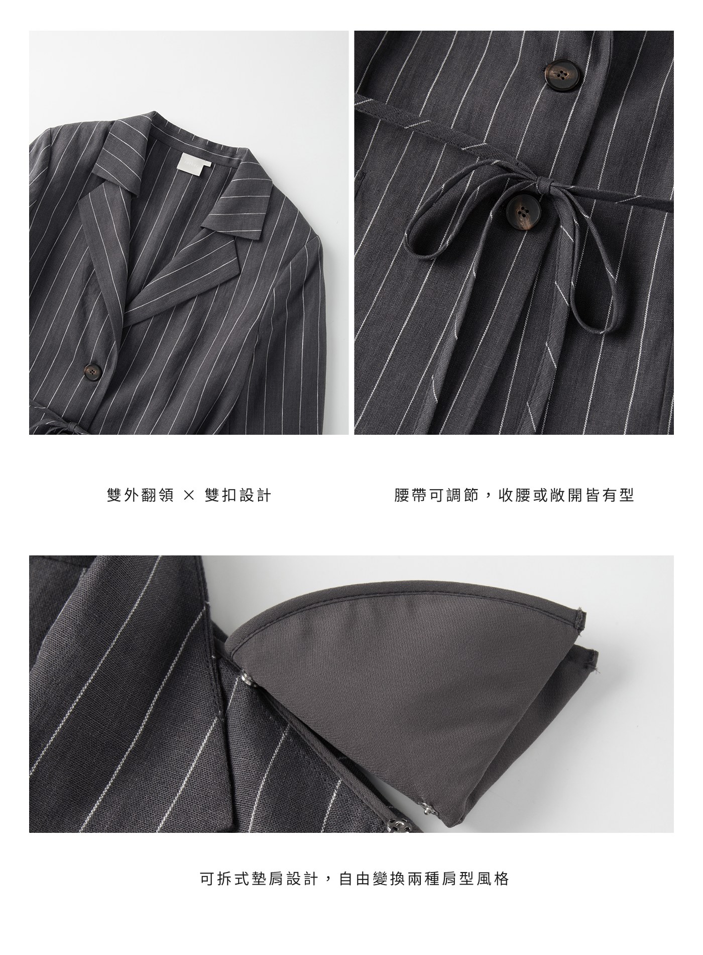 - 可拆式墊肩設計,一件提供兩種肩型選擇:裝上時線條挺括有氣勢,取下則貼合肩線、柔和自然