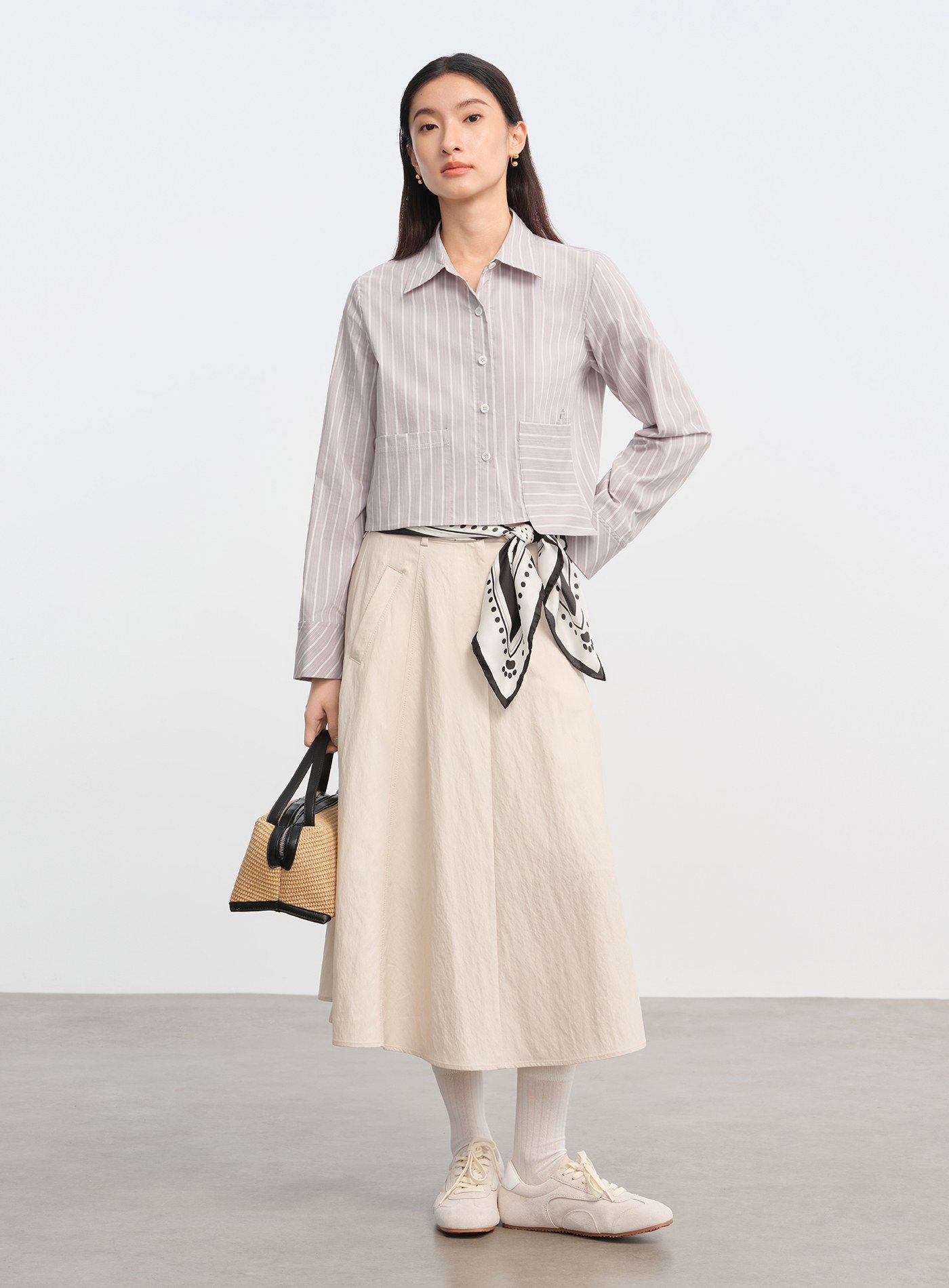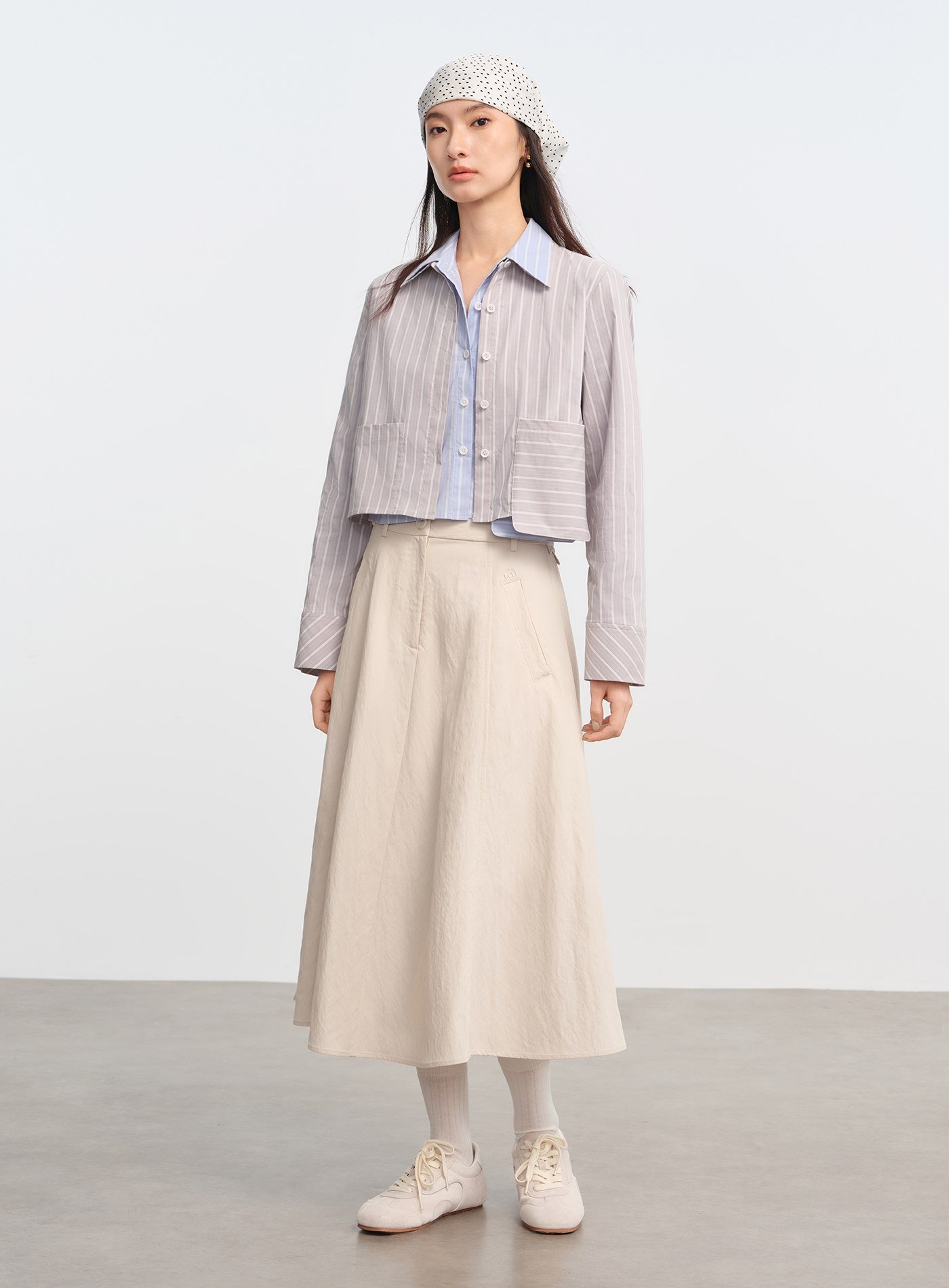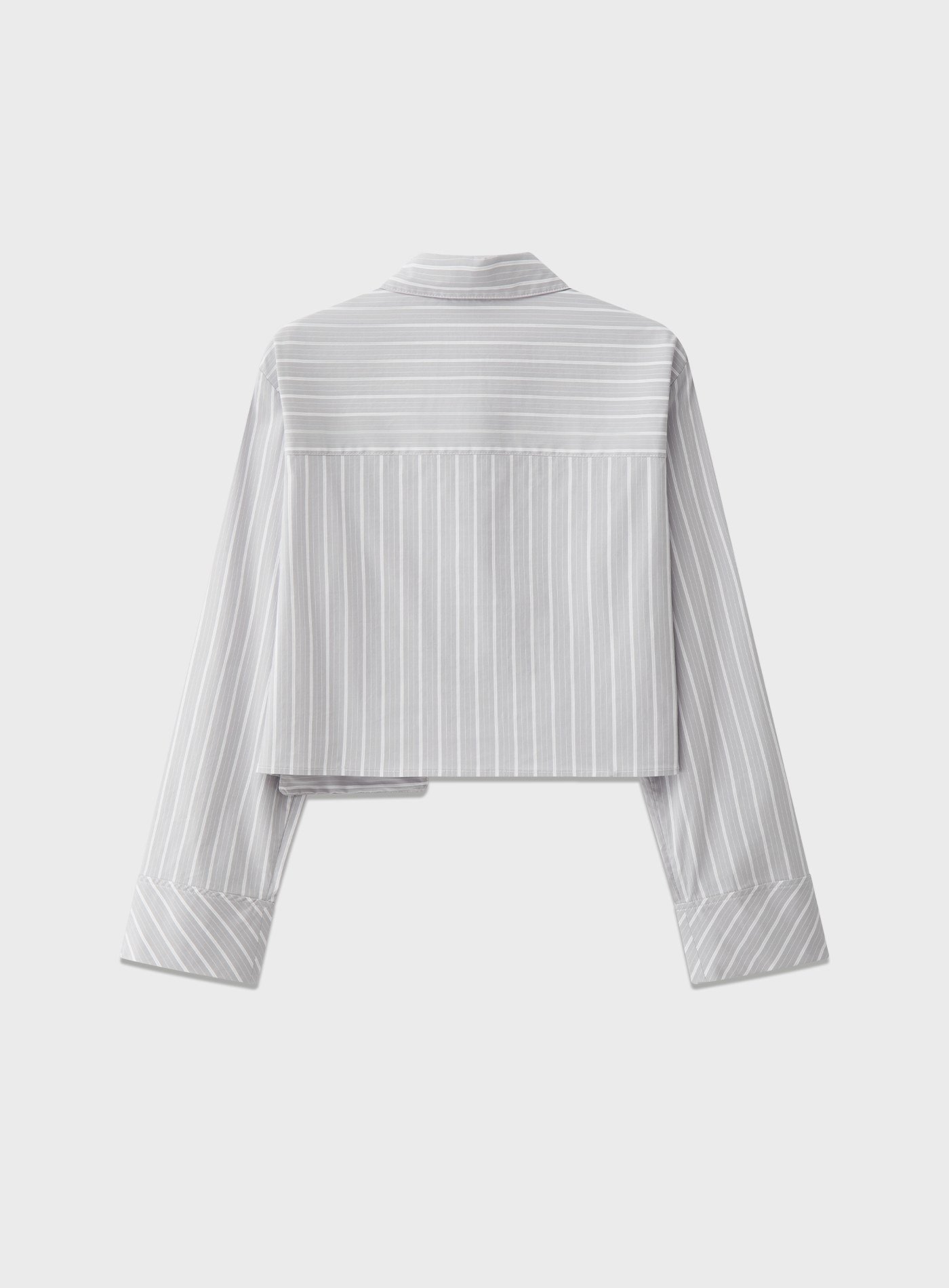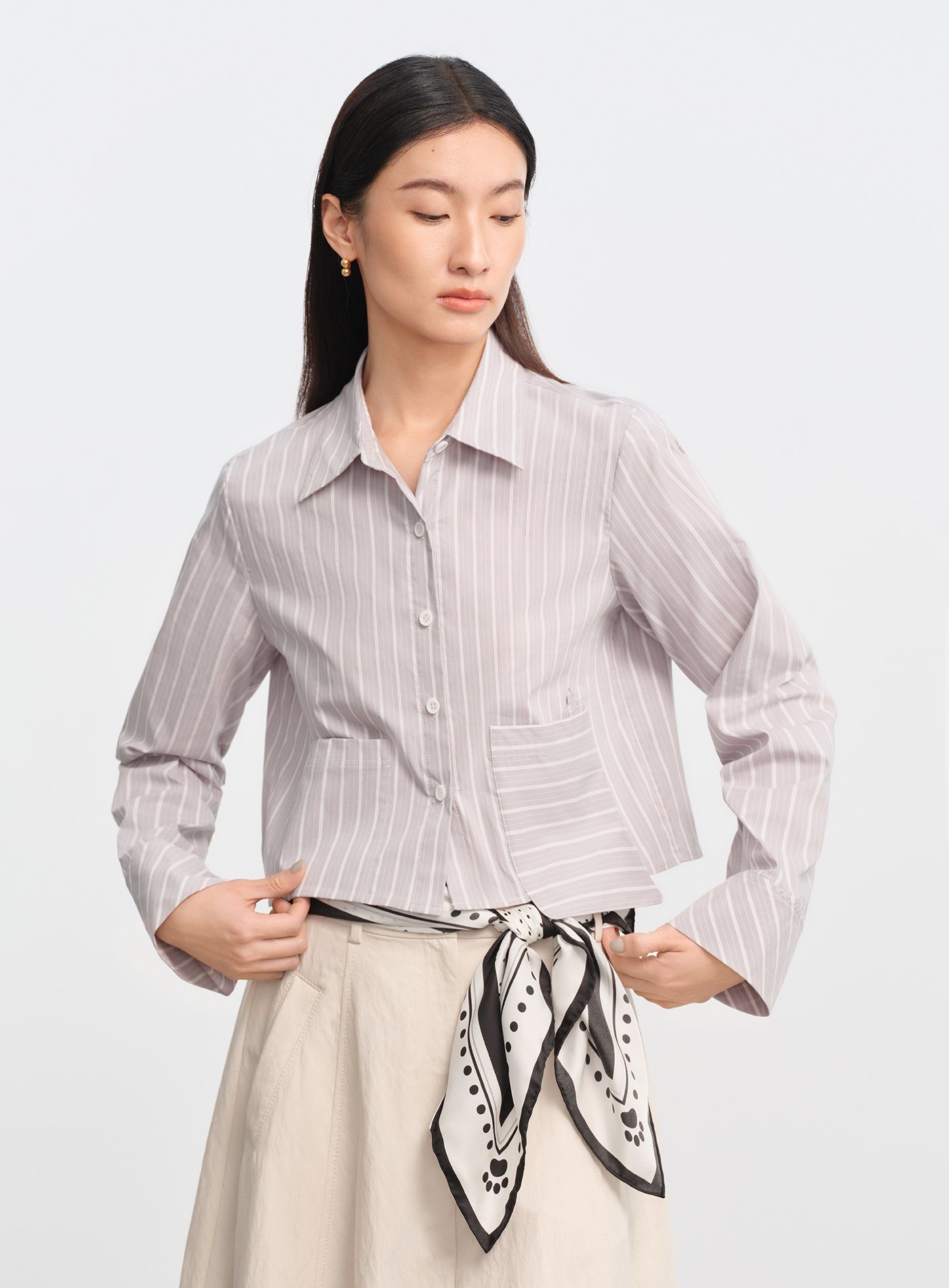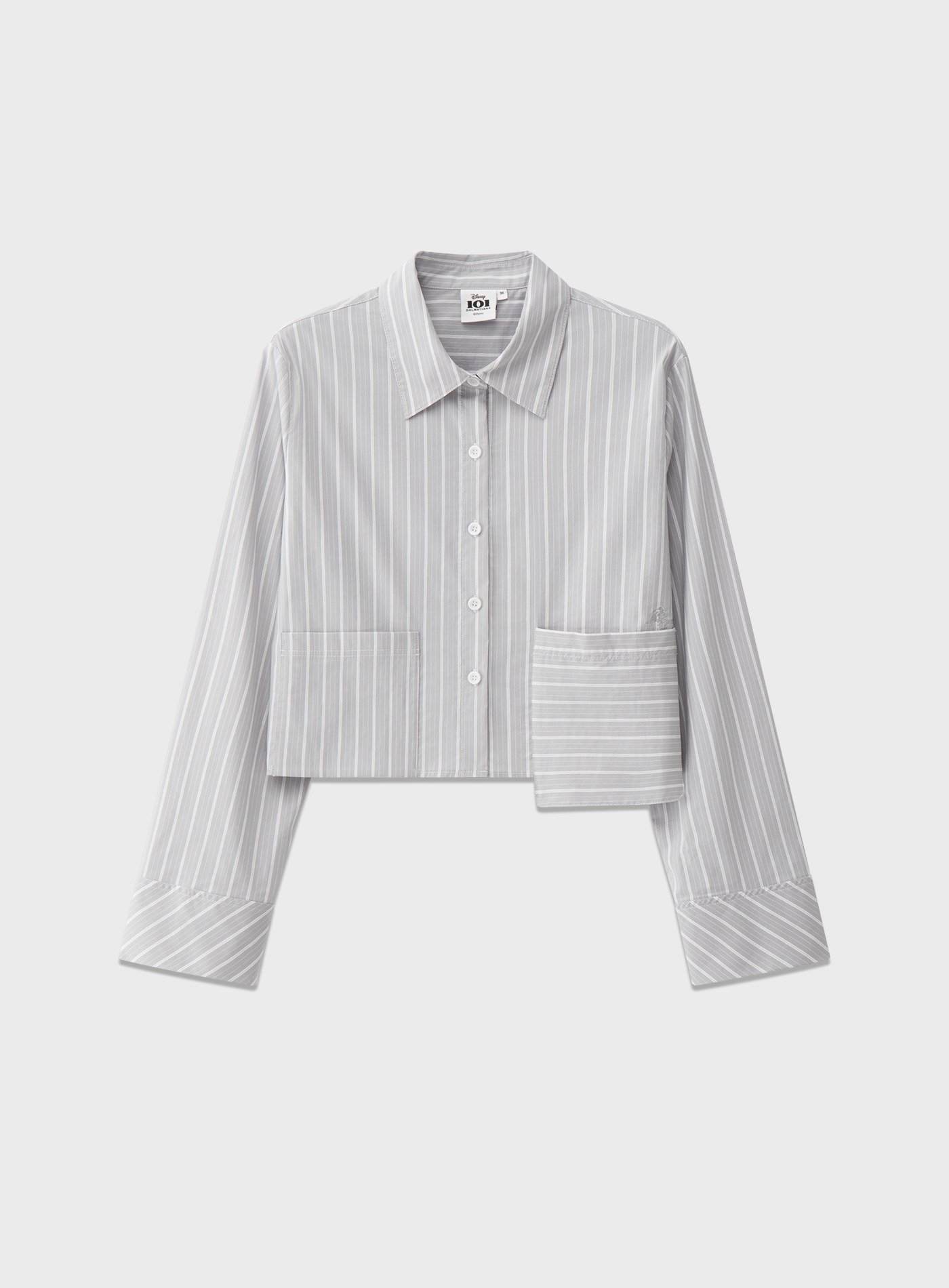 - 兩側不對稱口袋打破傳統條紋襯衫的規律節奏,增添視覺層次