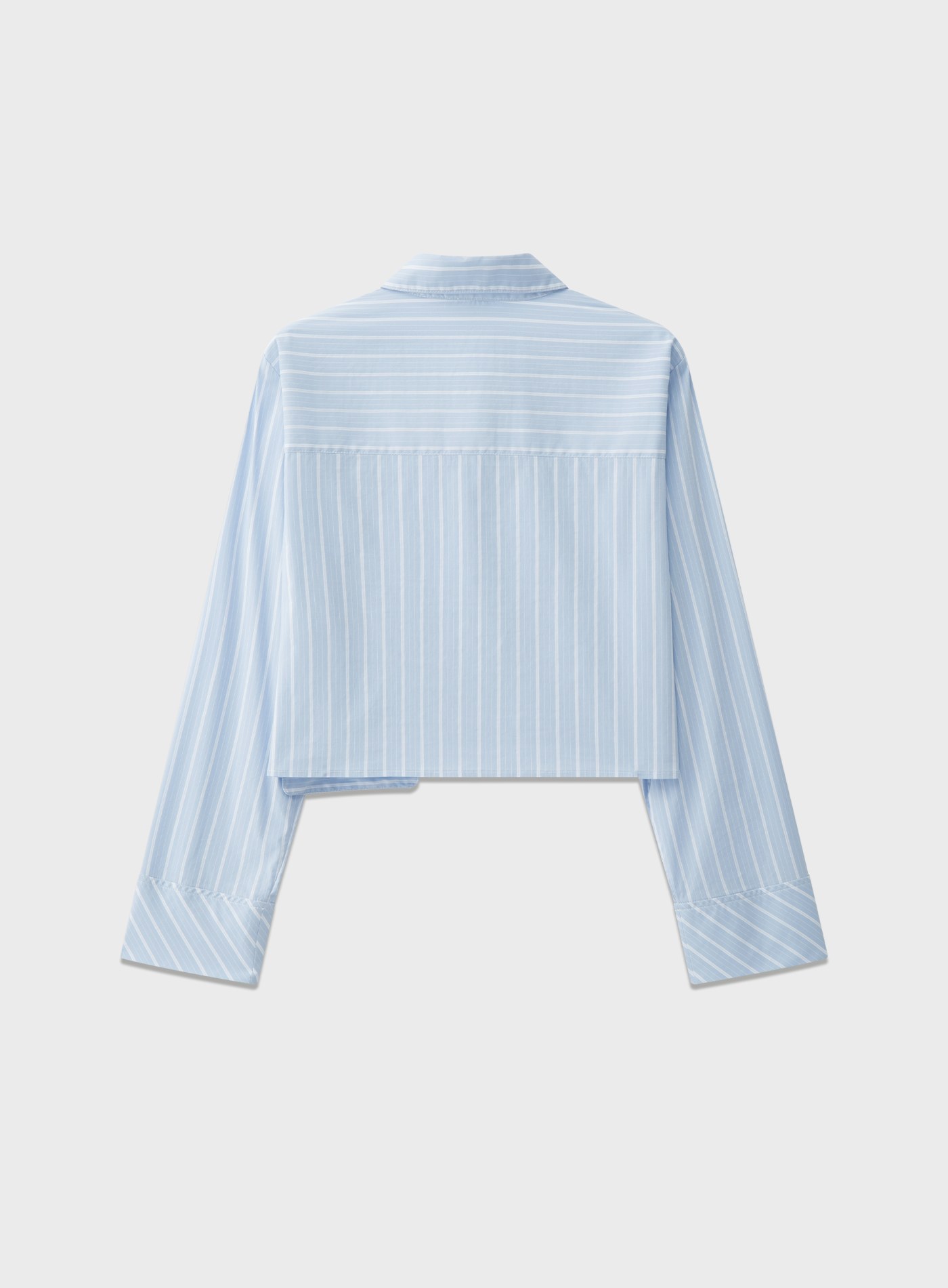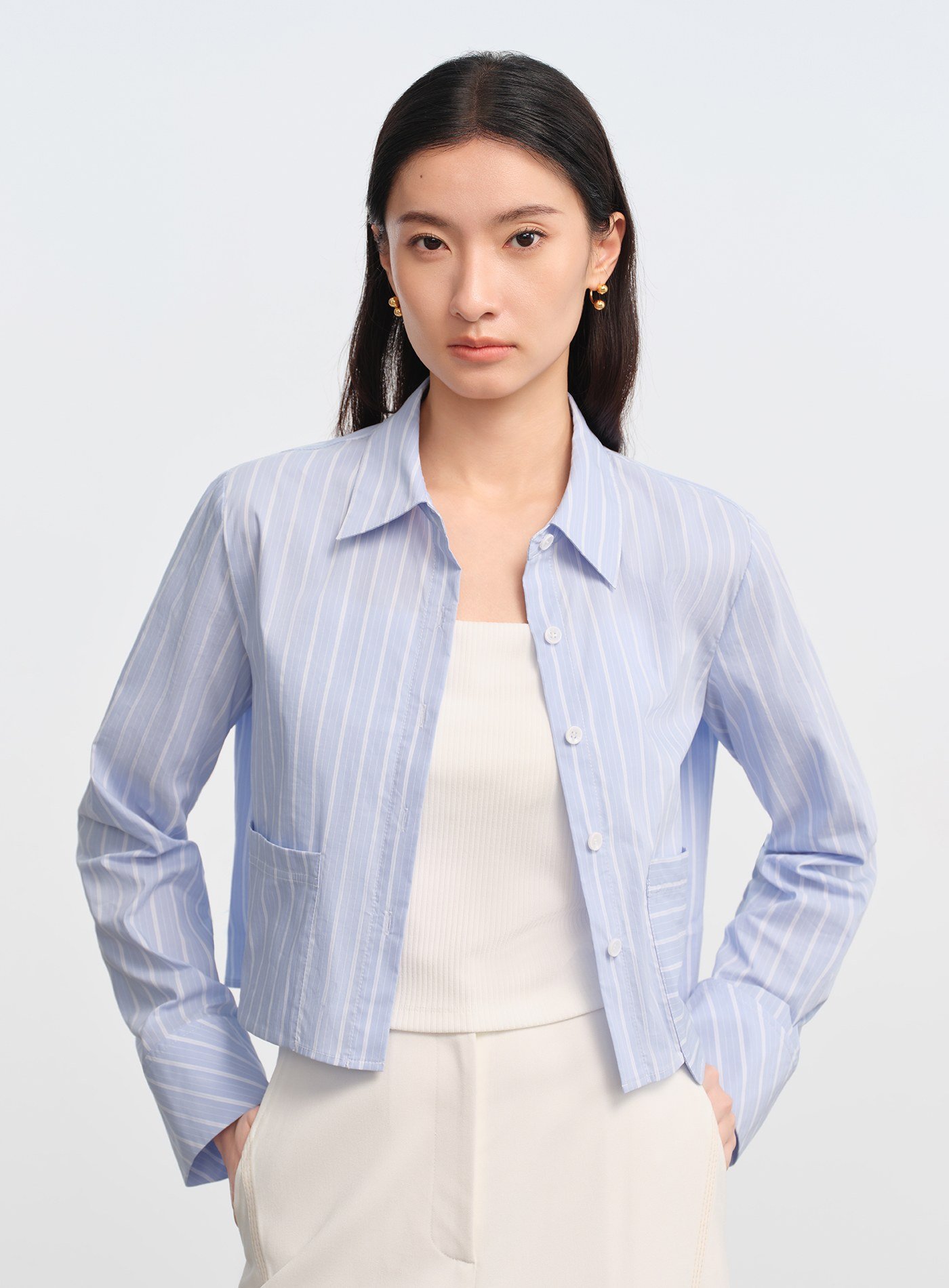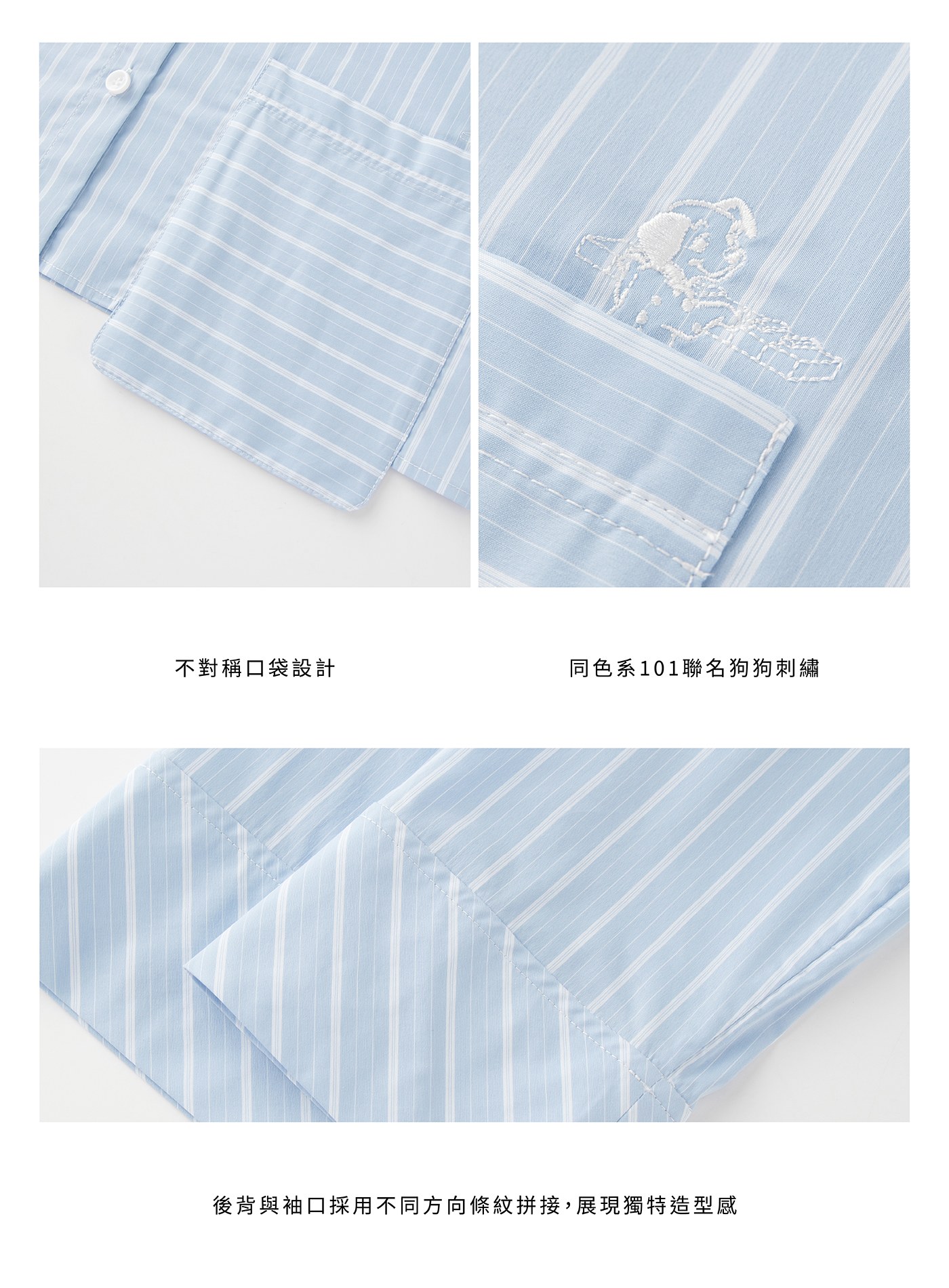 - 兩側不對稱口袋打破傳統條紋襯衫的規律節奏,增添視覺層次