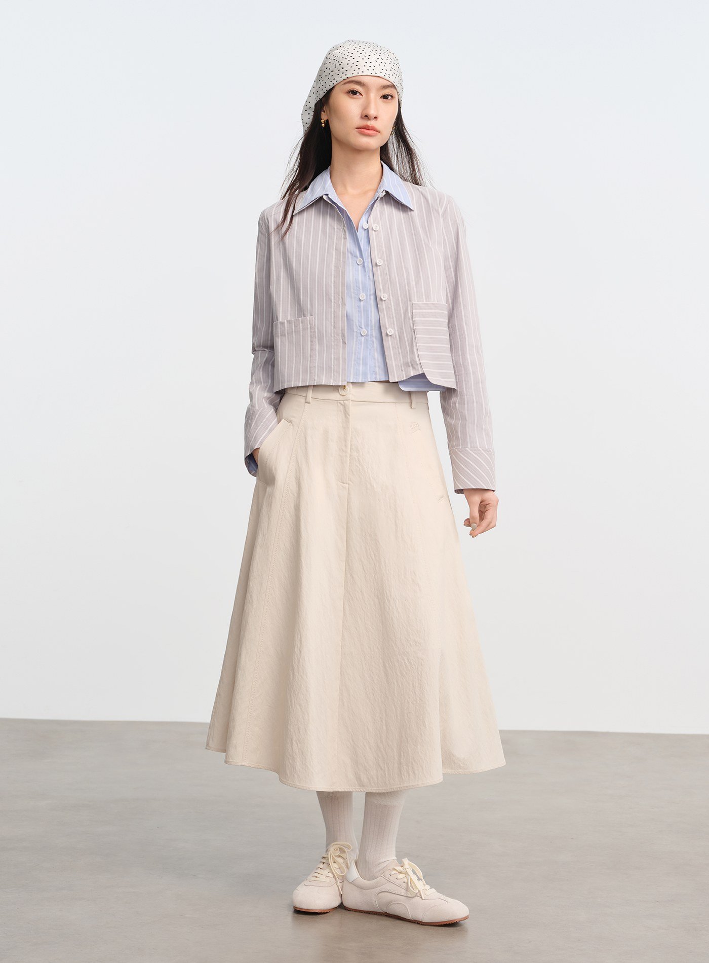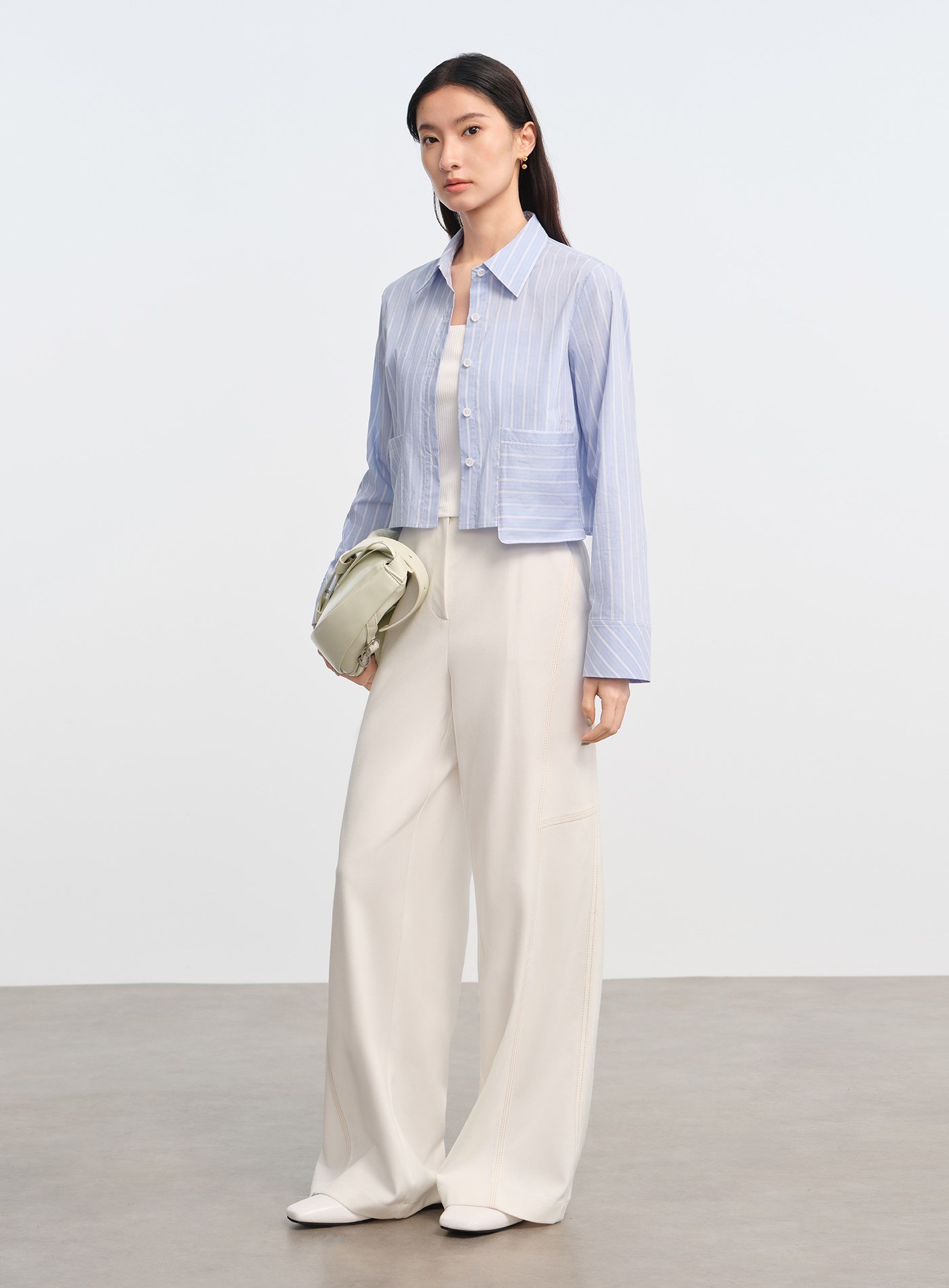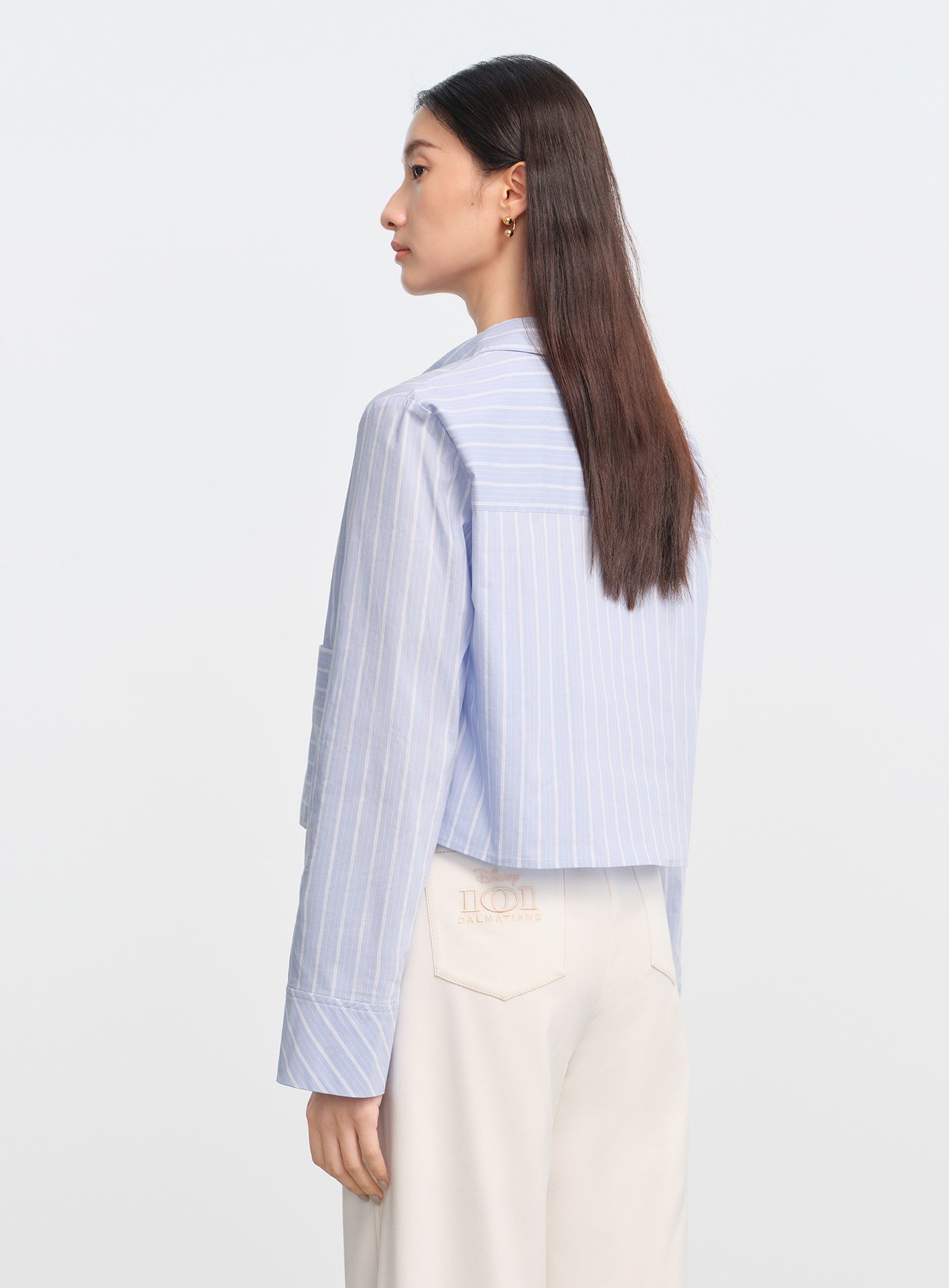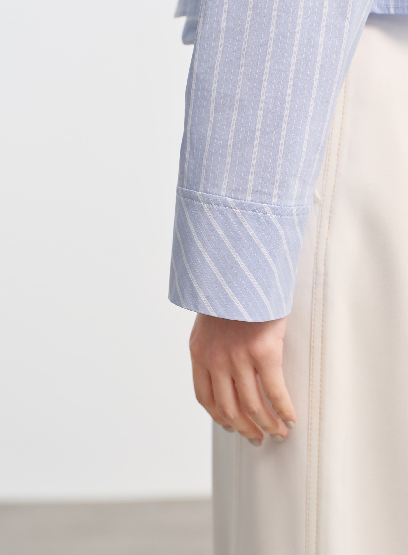 - 兩側不對稱口袋打破傳統條紋襯衫的規律節奏,增添視覺層次