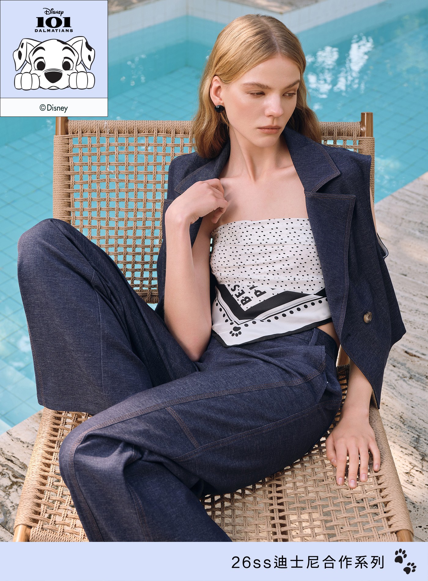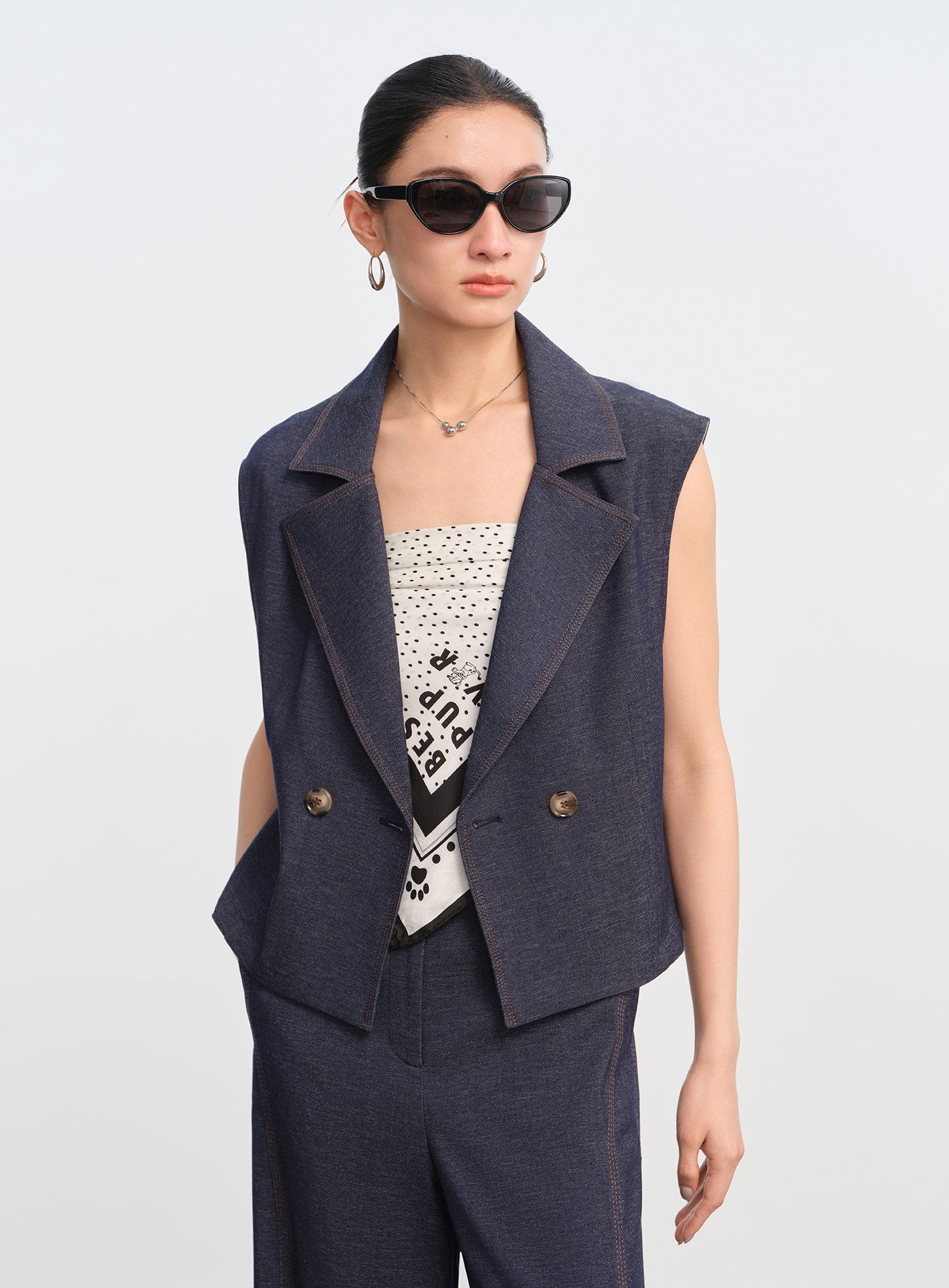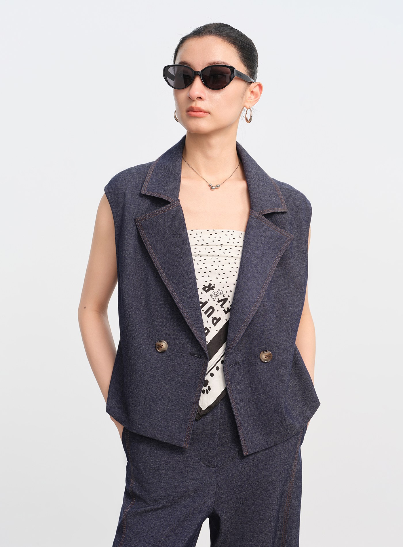 - 以經典西裝領與復古雙排扣為骨架,融合仿牛仔織造工藝,平衡休閒與正式之間的風格張力