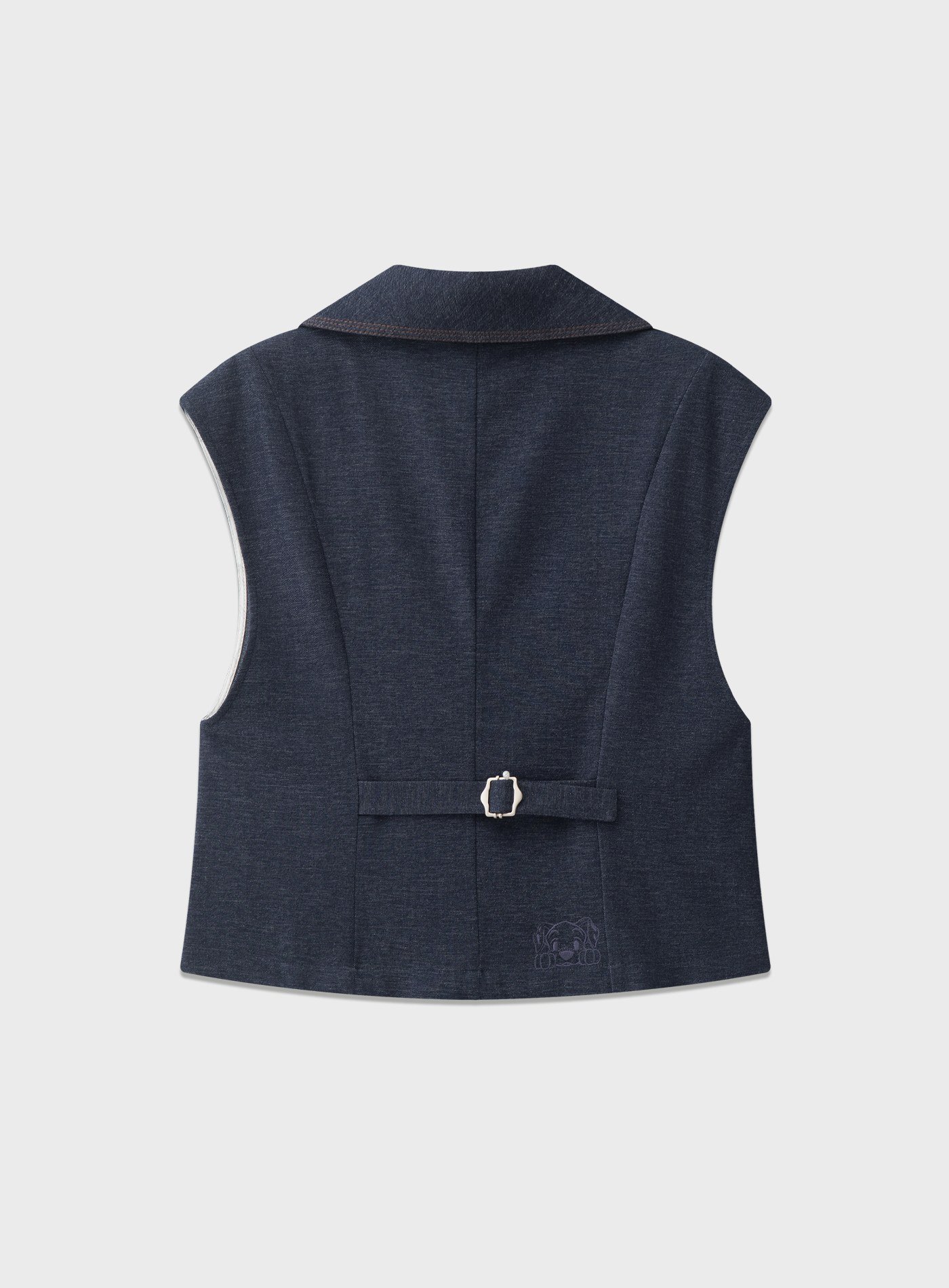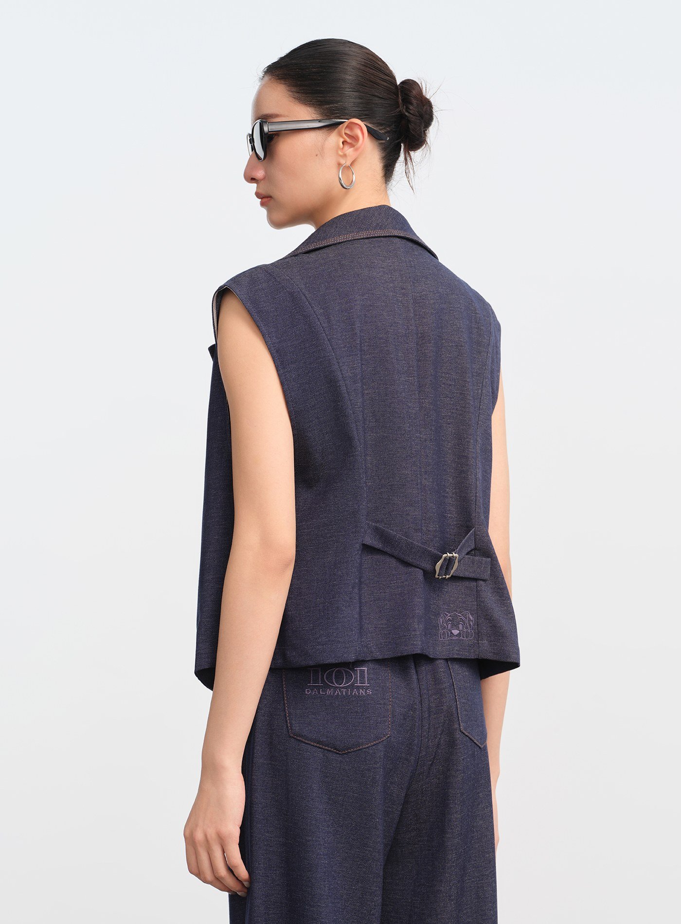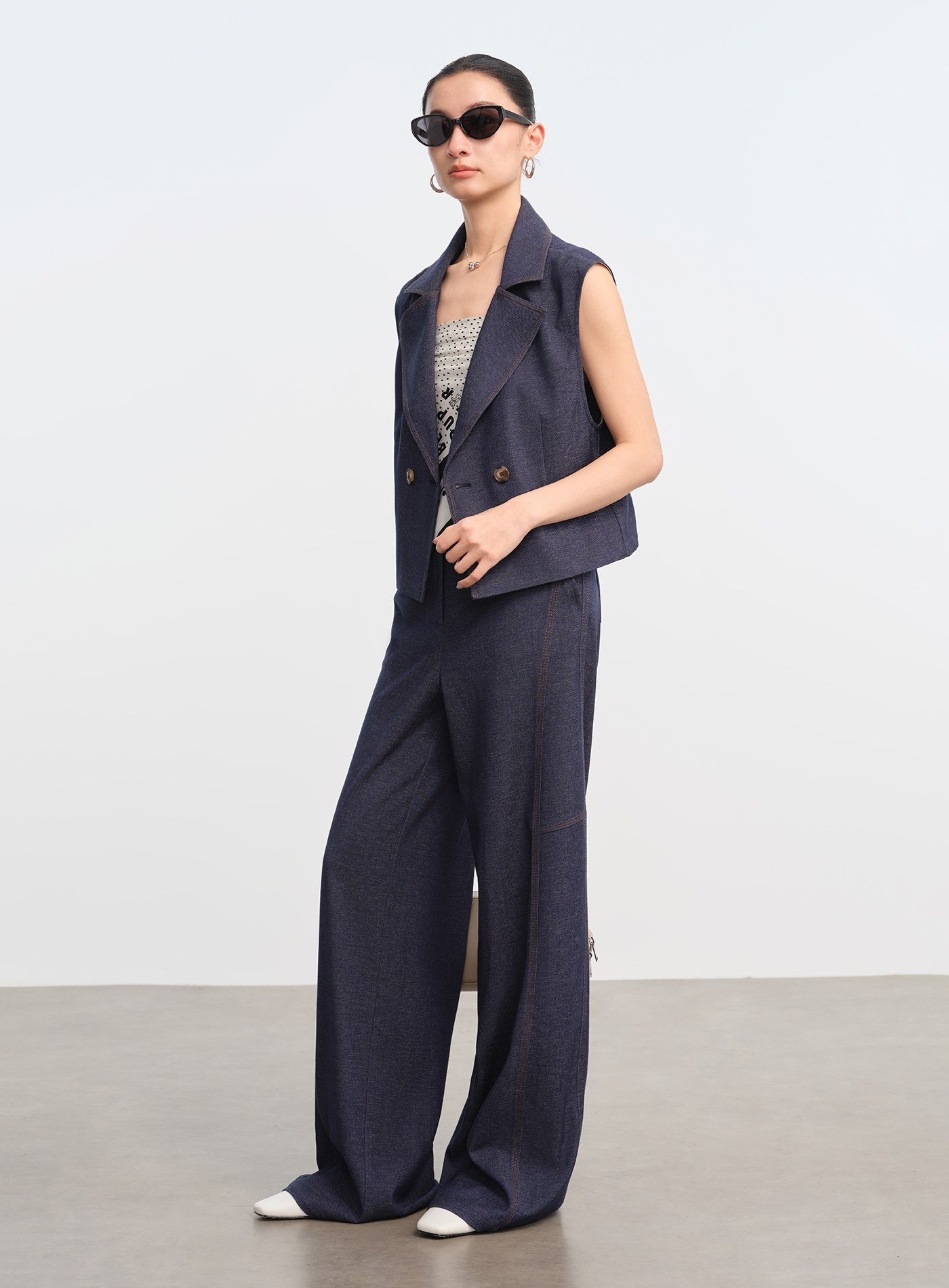 - 以經典西裝領與復古雙排扣為骨架,融合仿牛仔織造工藝,平衡休閒與正式之間的風格張力