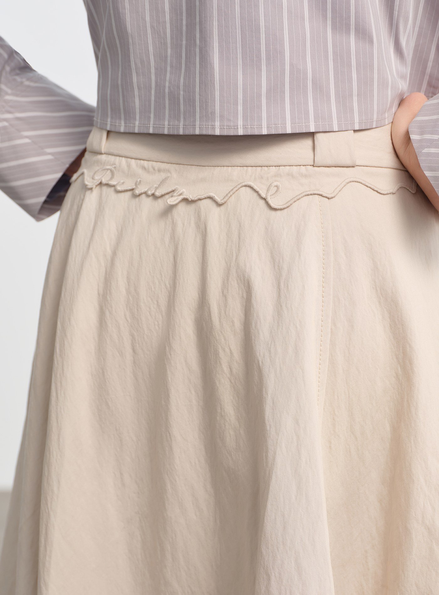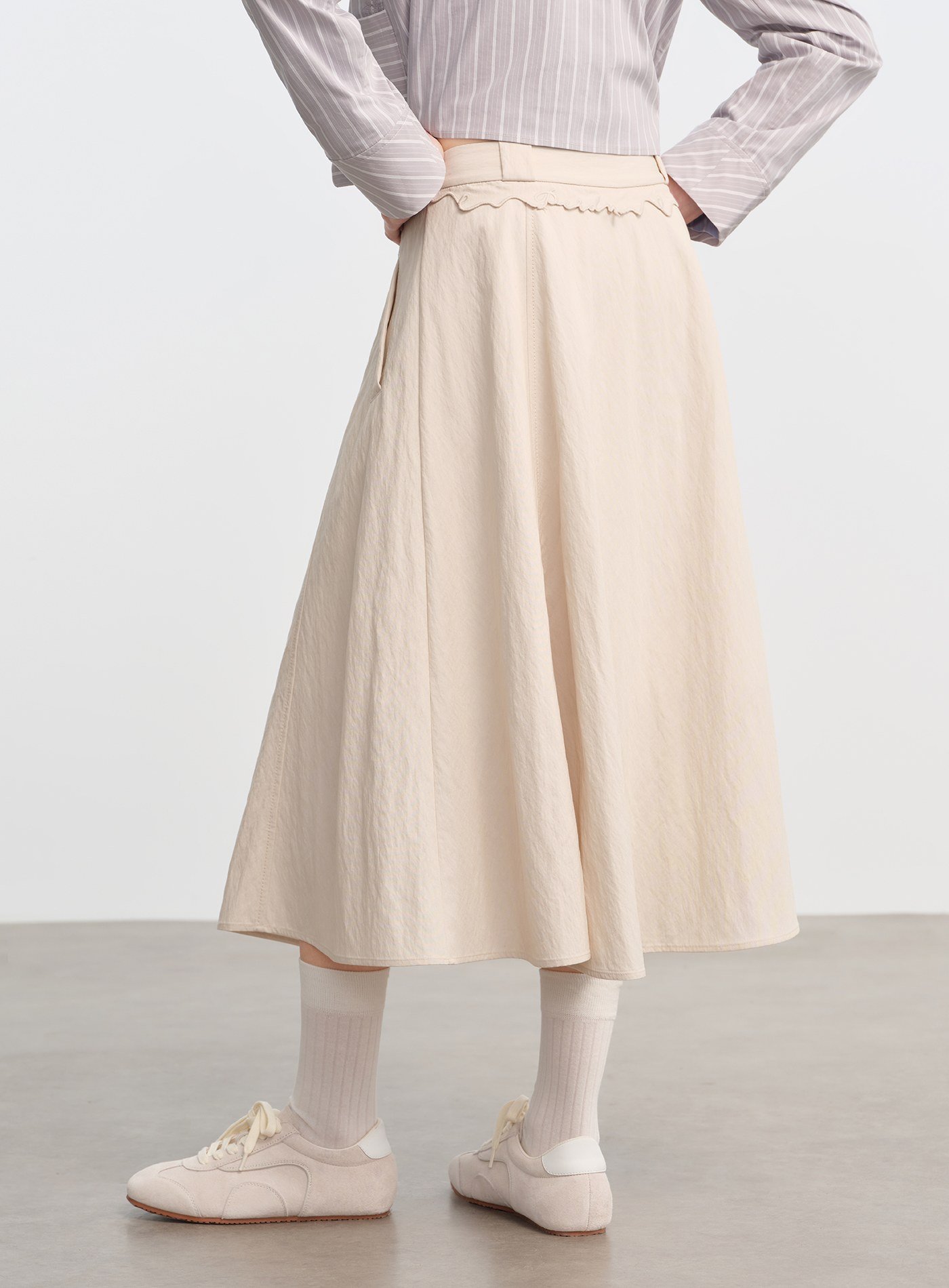 • 選用垂墜順滑卻帶筋骨的人造棉混紡面料,行走時裙擺隨步伐自然擺動