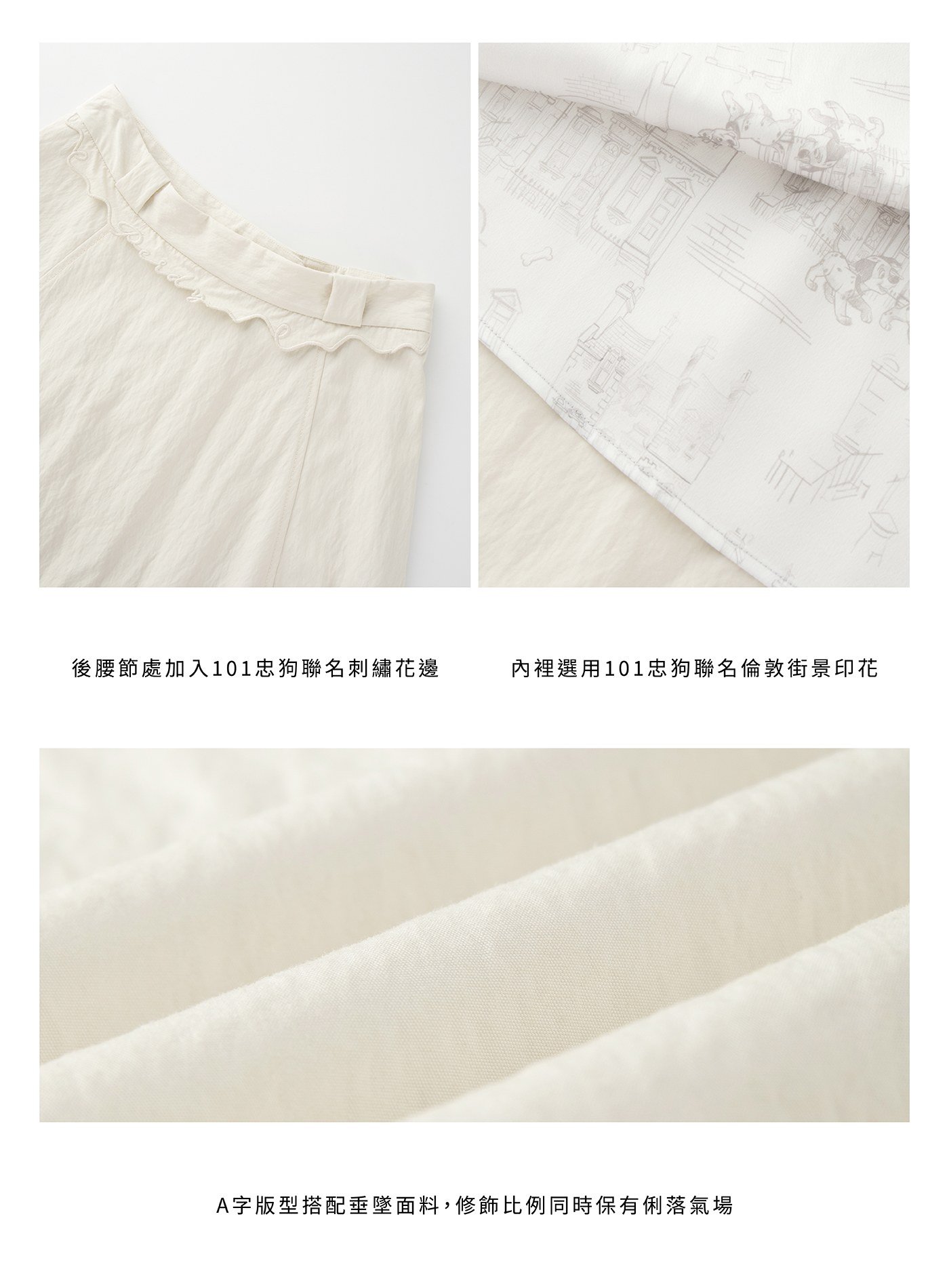 • 後腰節處巧妙加入101忠狗聯名刺繡花邊,低調點題,近看才發現的設計巧思,讓單品更耐看