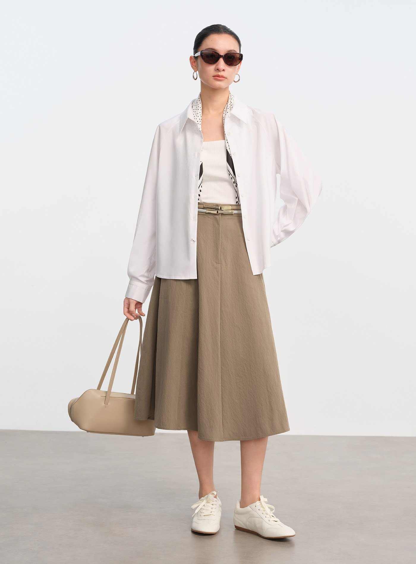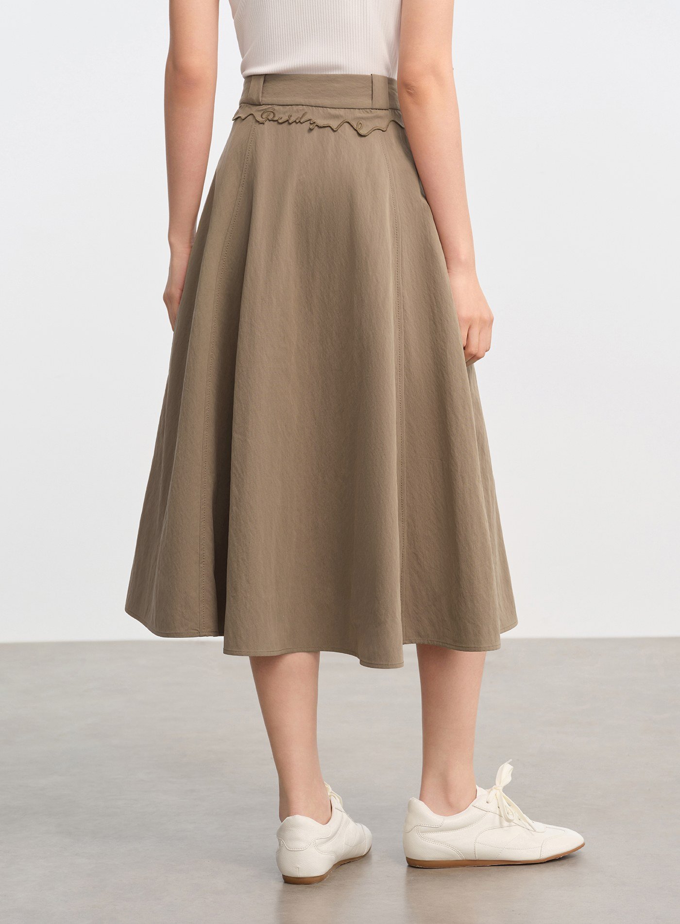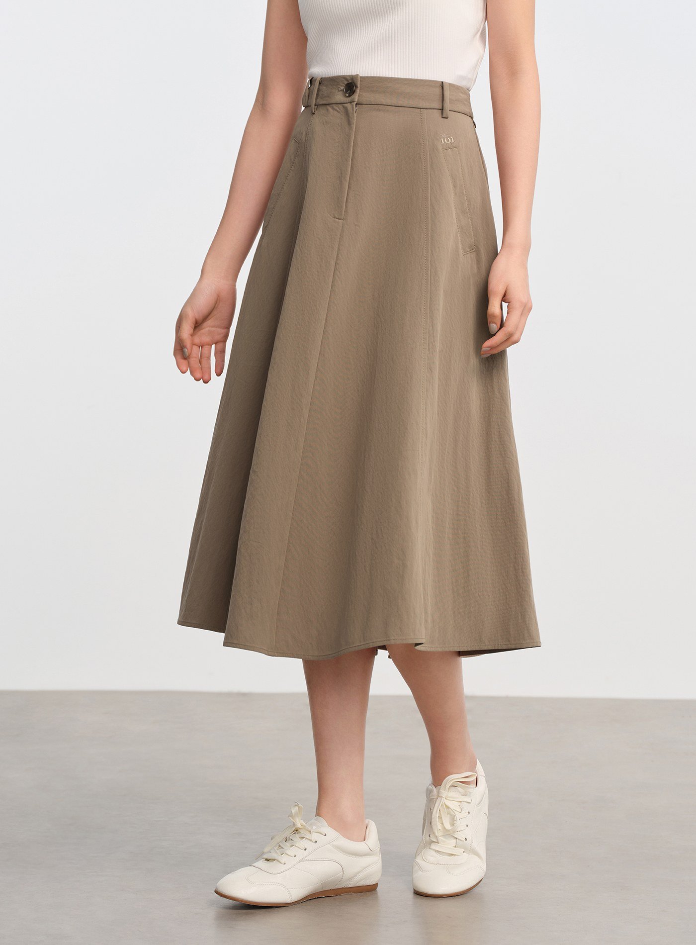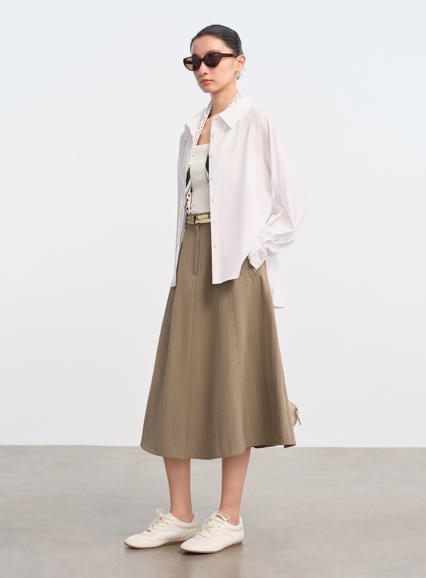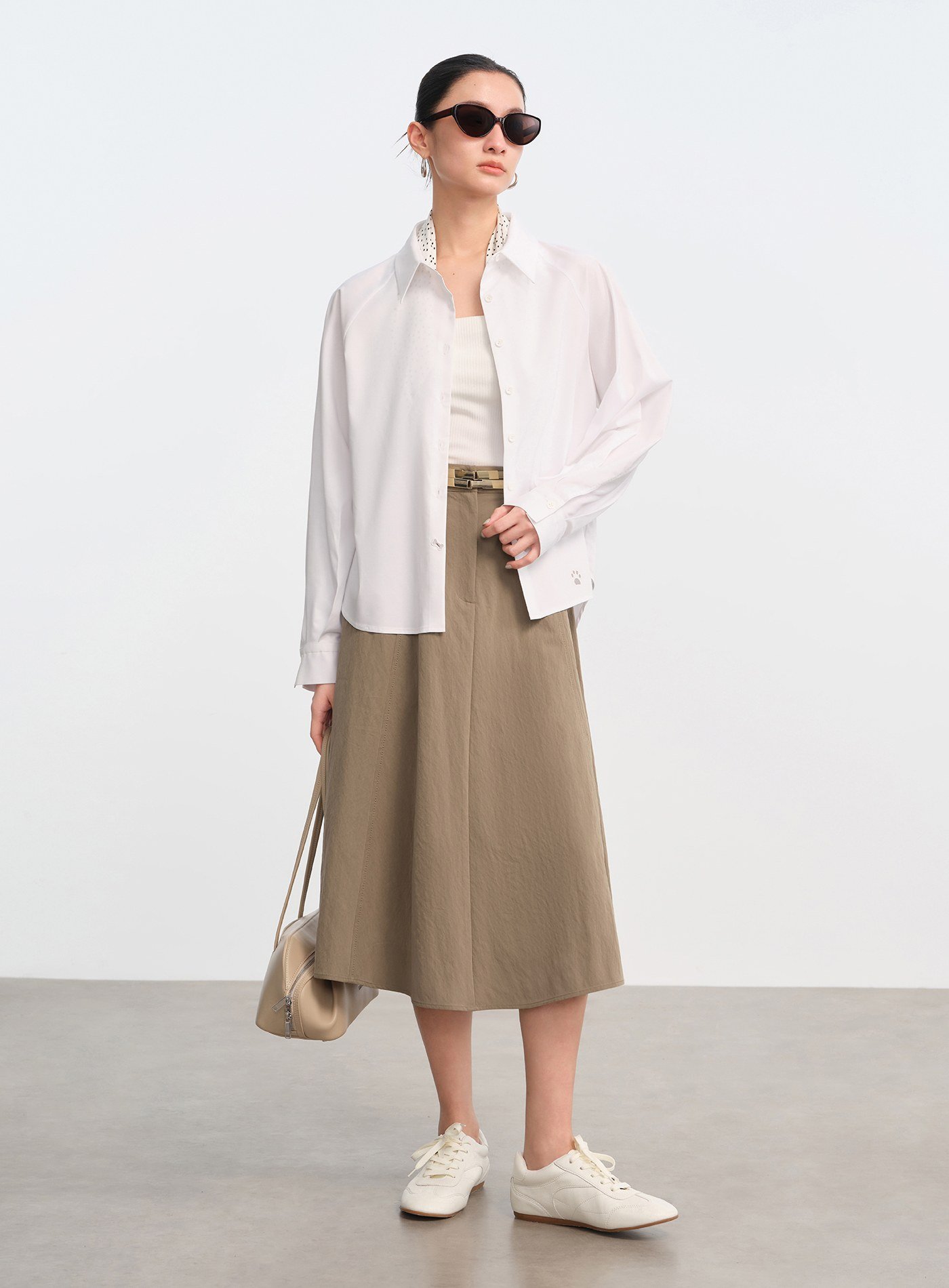 - 選用垂墜順滑卻帶筋骨的人造棉混紡面料,行走時裙擺隨步伐自然擺動