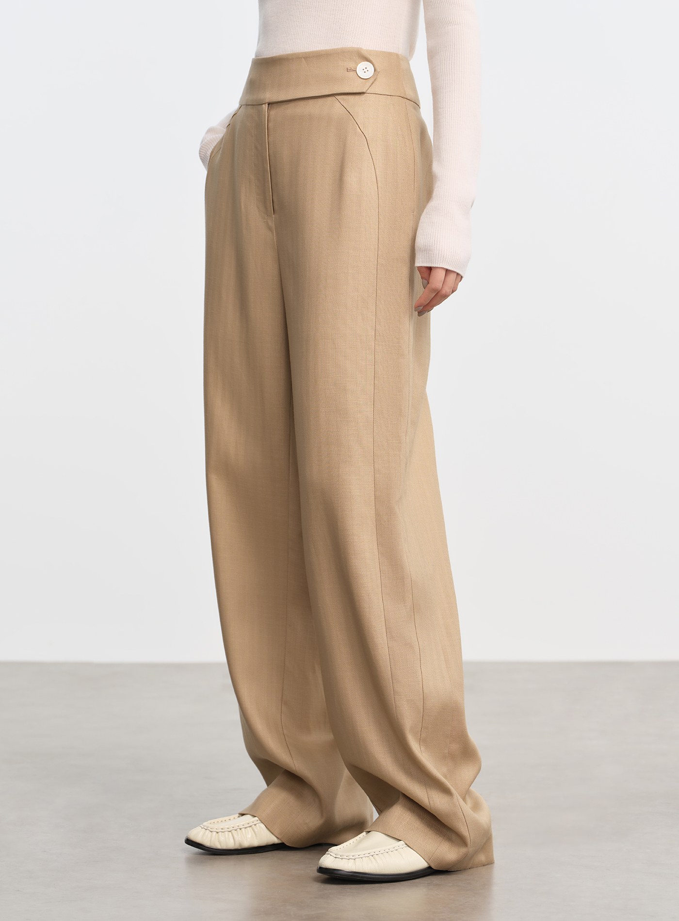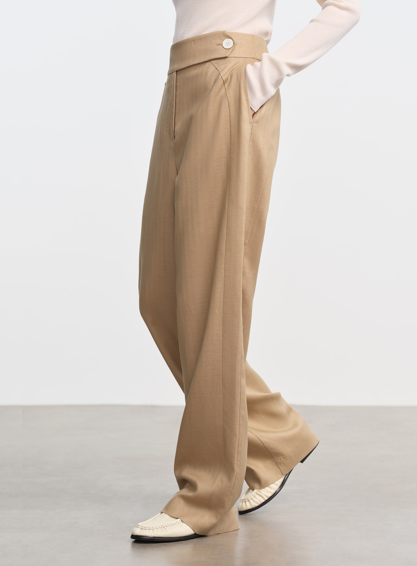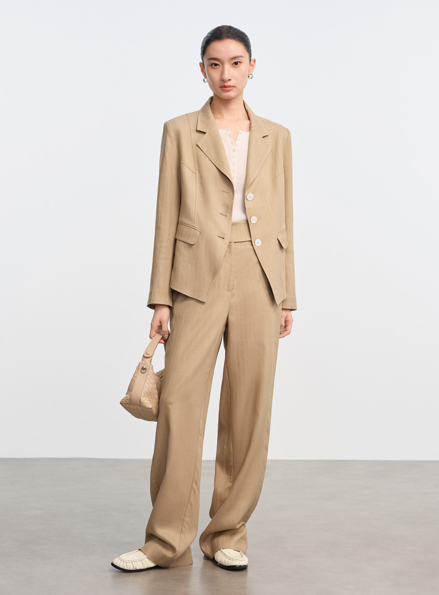 - 天絲亞麻混紡布料柔潤親膚,兼具垂感與挺度,四季皆宜