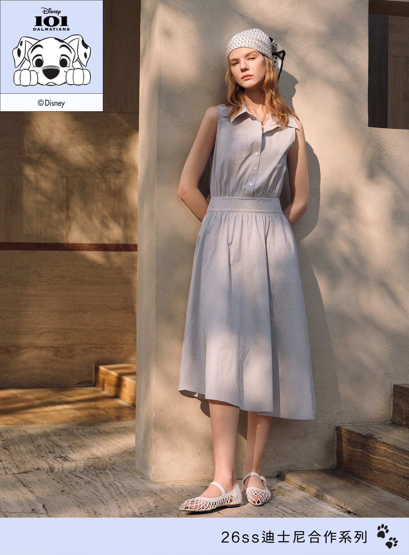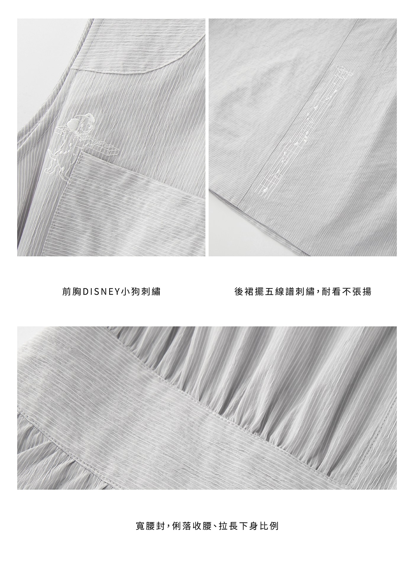 - 細節中藏入 DISNEY 聯名巧思——前胸口袋的小狗刺繡與後裙擺的五線譜刺繡前後呼應,低調敘述一段輕快的故事,讓聯名元素成為耐看的設計語言