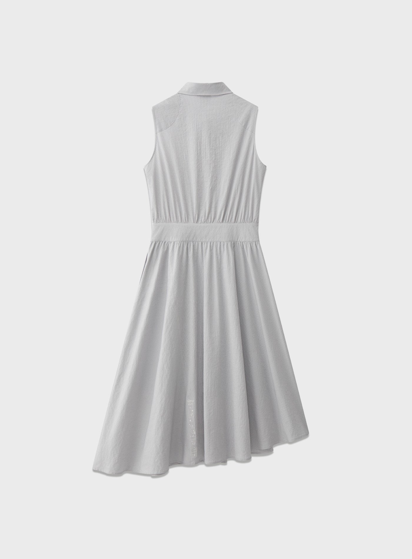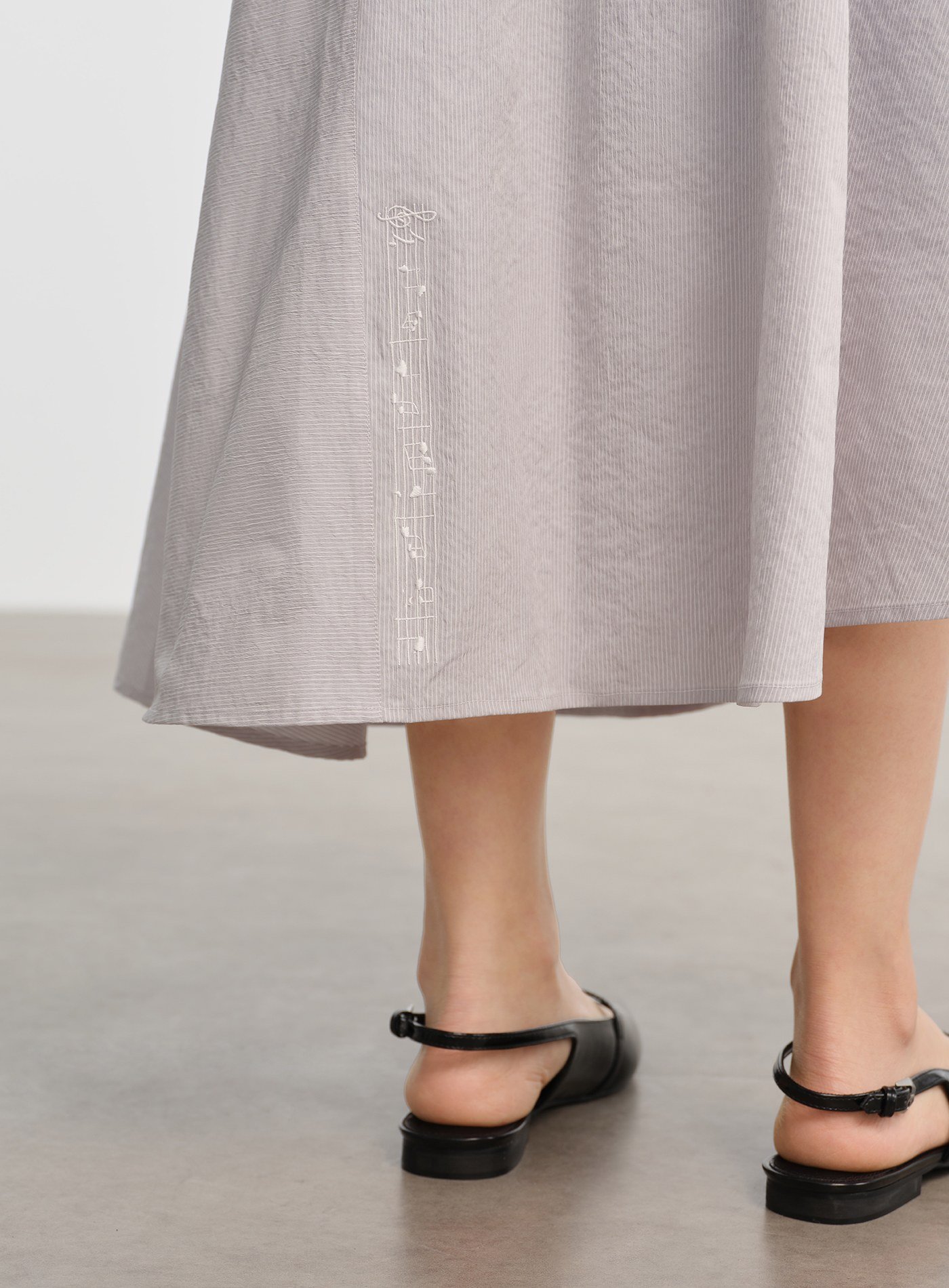 - 前後不對稱裙擺結合橫、直條紋拼接,如同樂譜般錯落排列,行走間自然形成層次律動