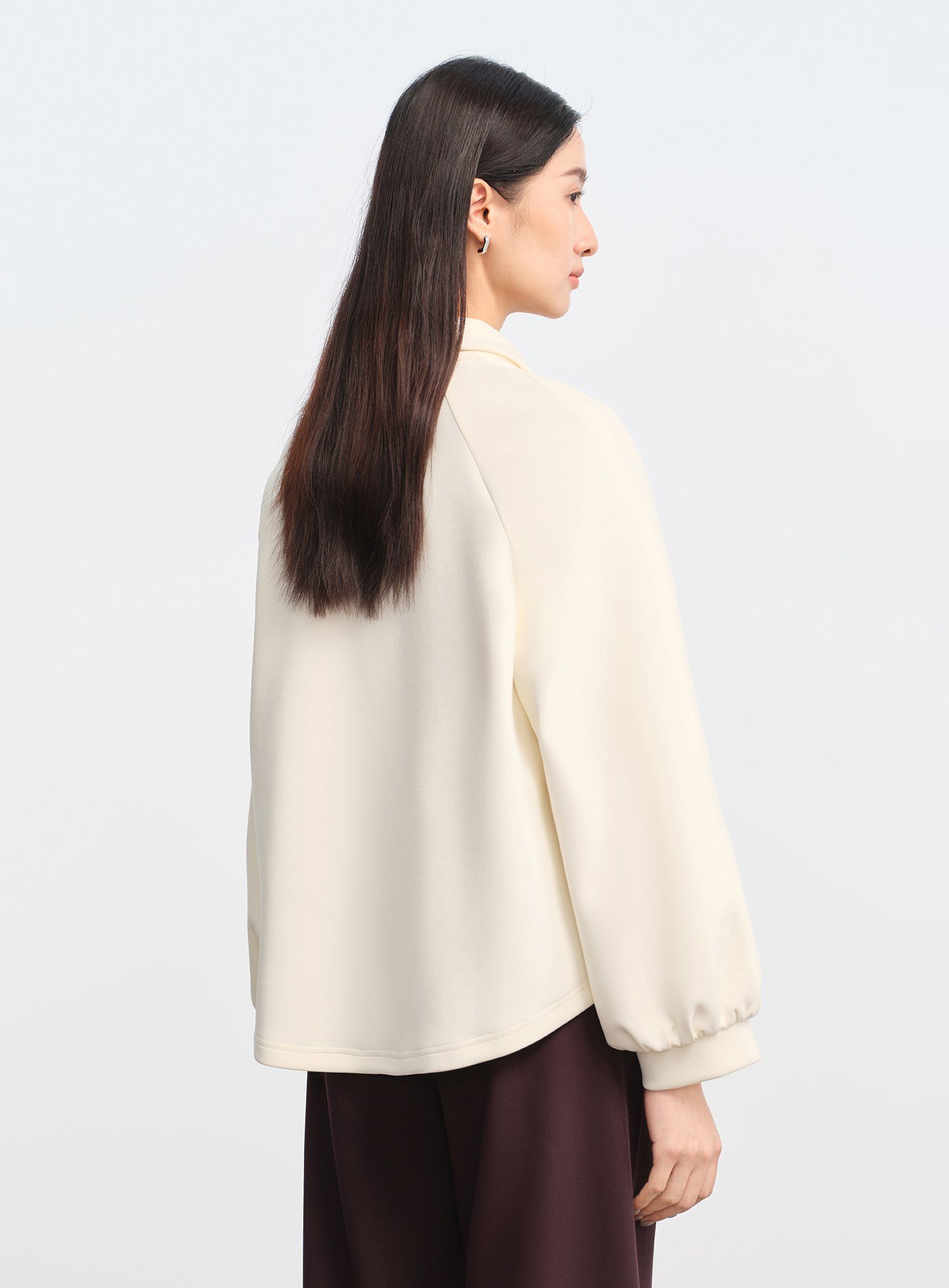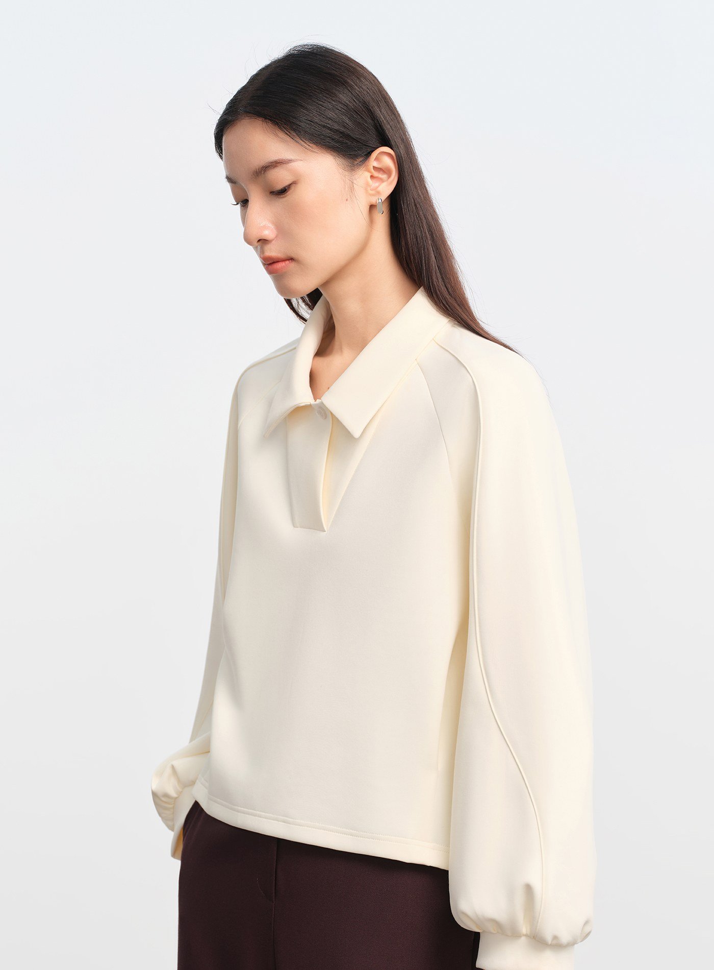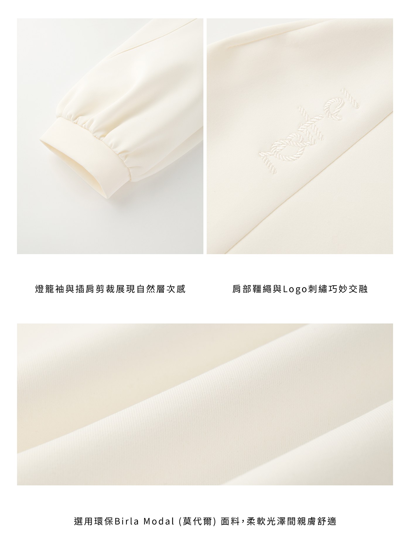- 燈籠袖營造復古蓬鬆感,袖側白線延伸視覺