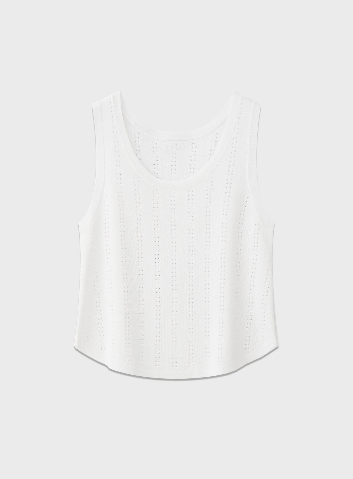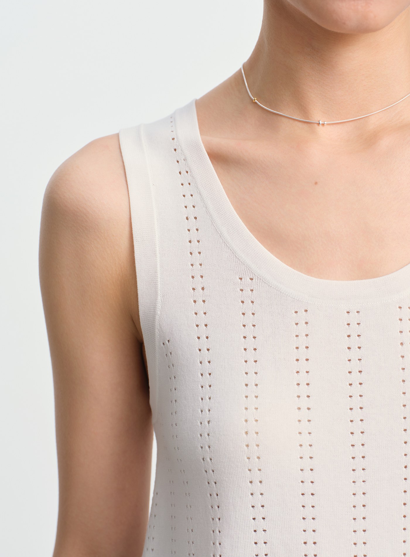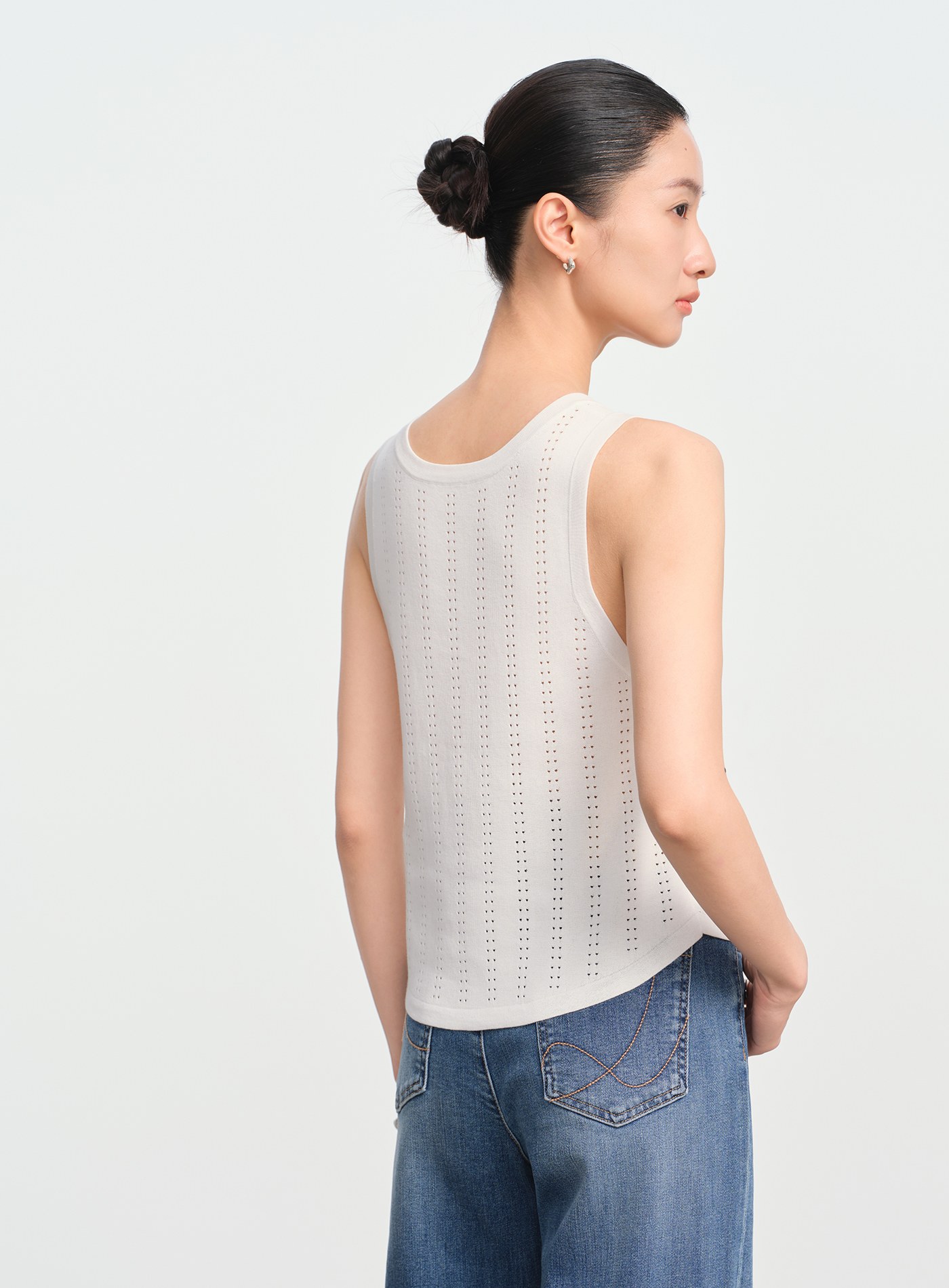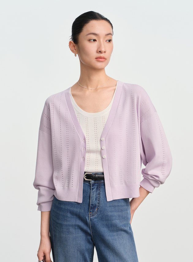- 直條點狀鏤空工藝沿身形縱向延展,提升透氣度的同時,也為純色單品注入精緻層次