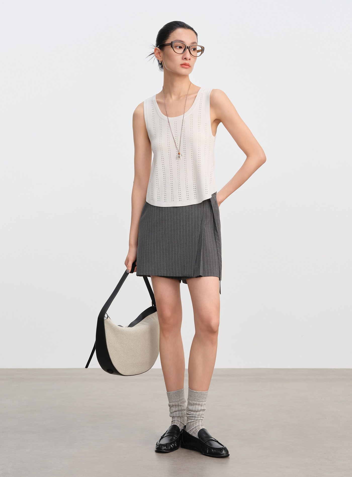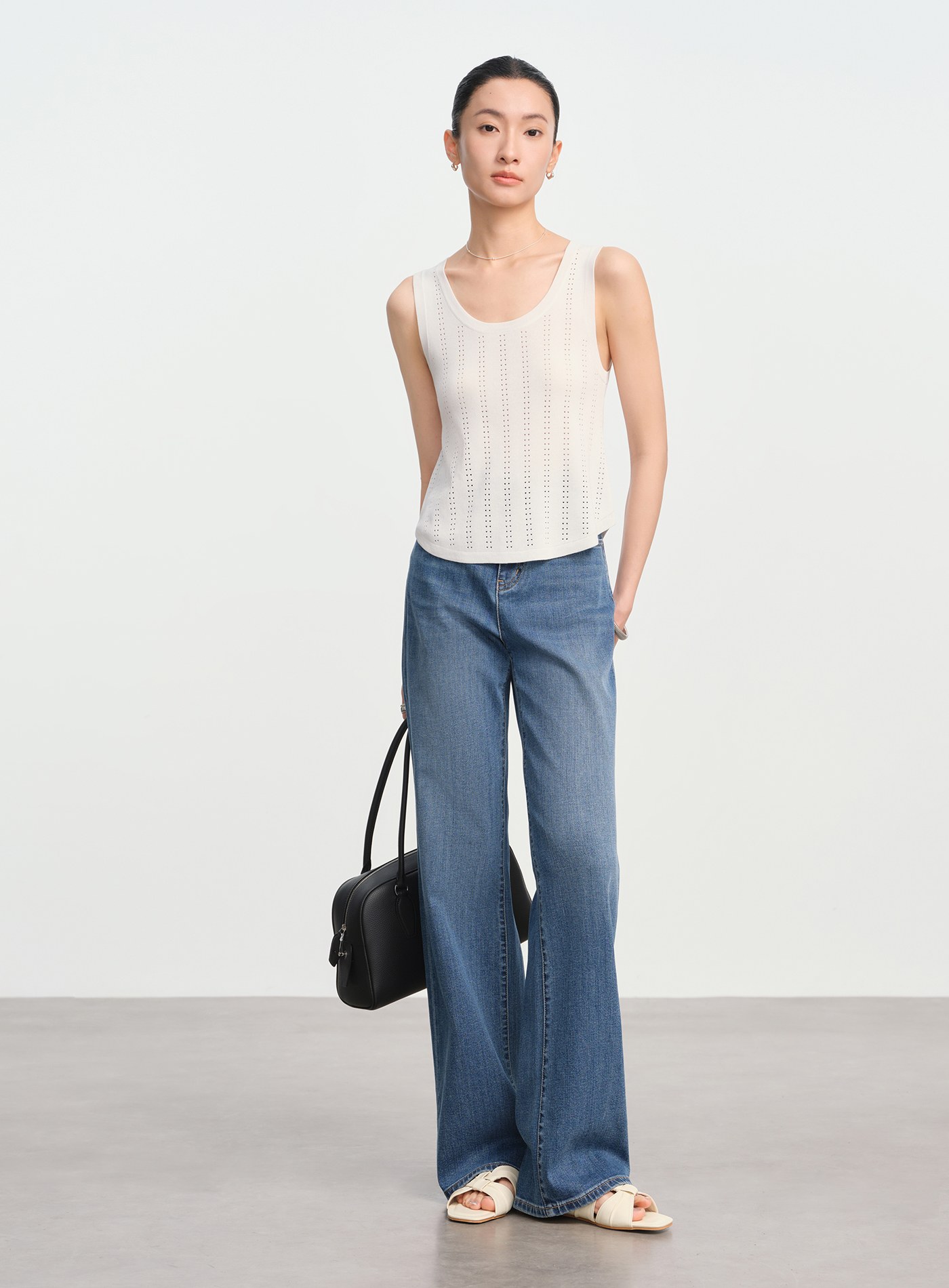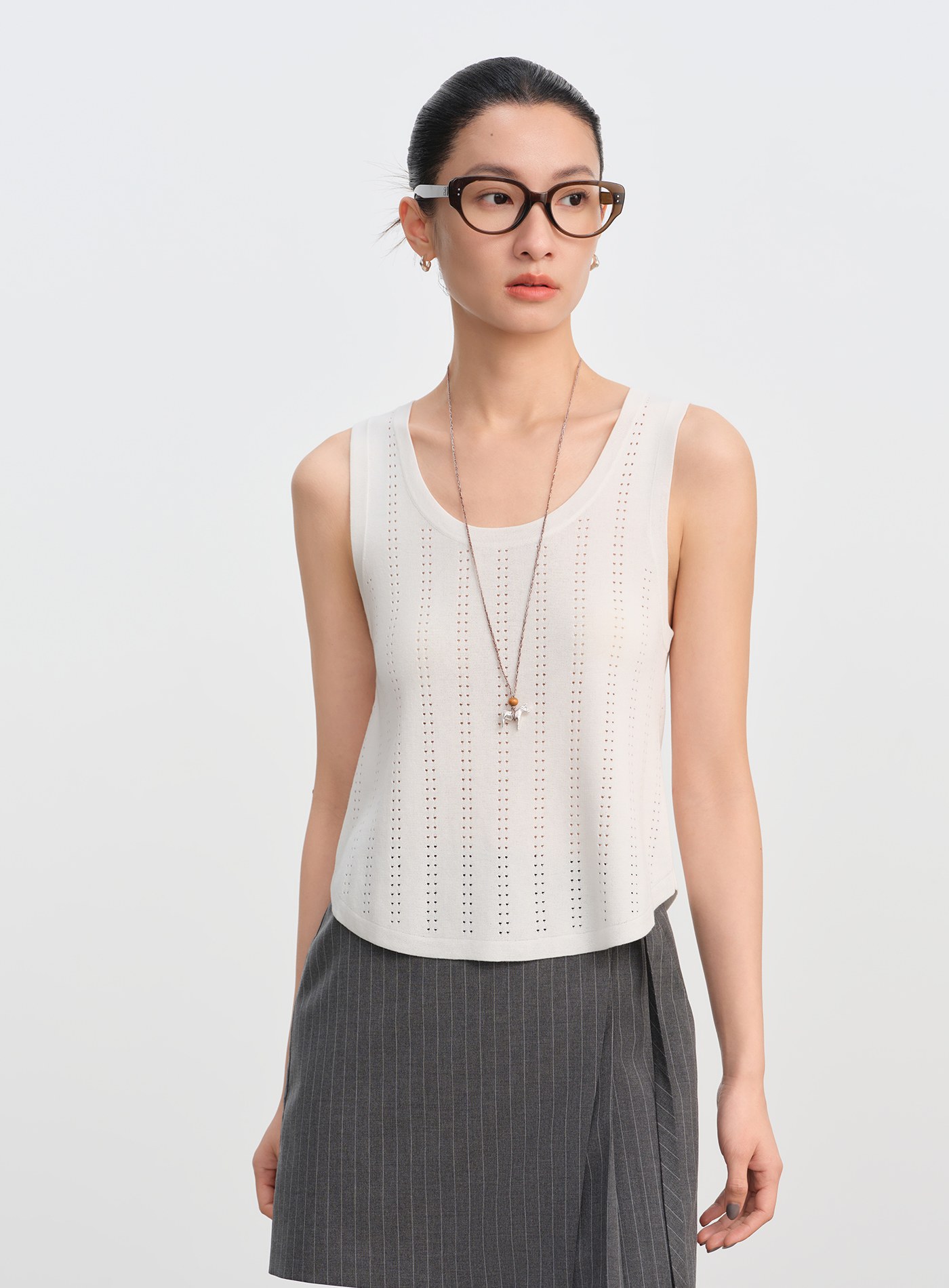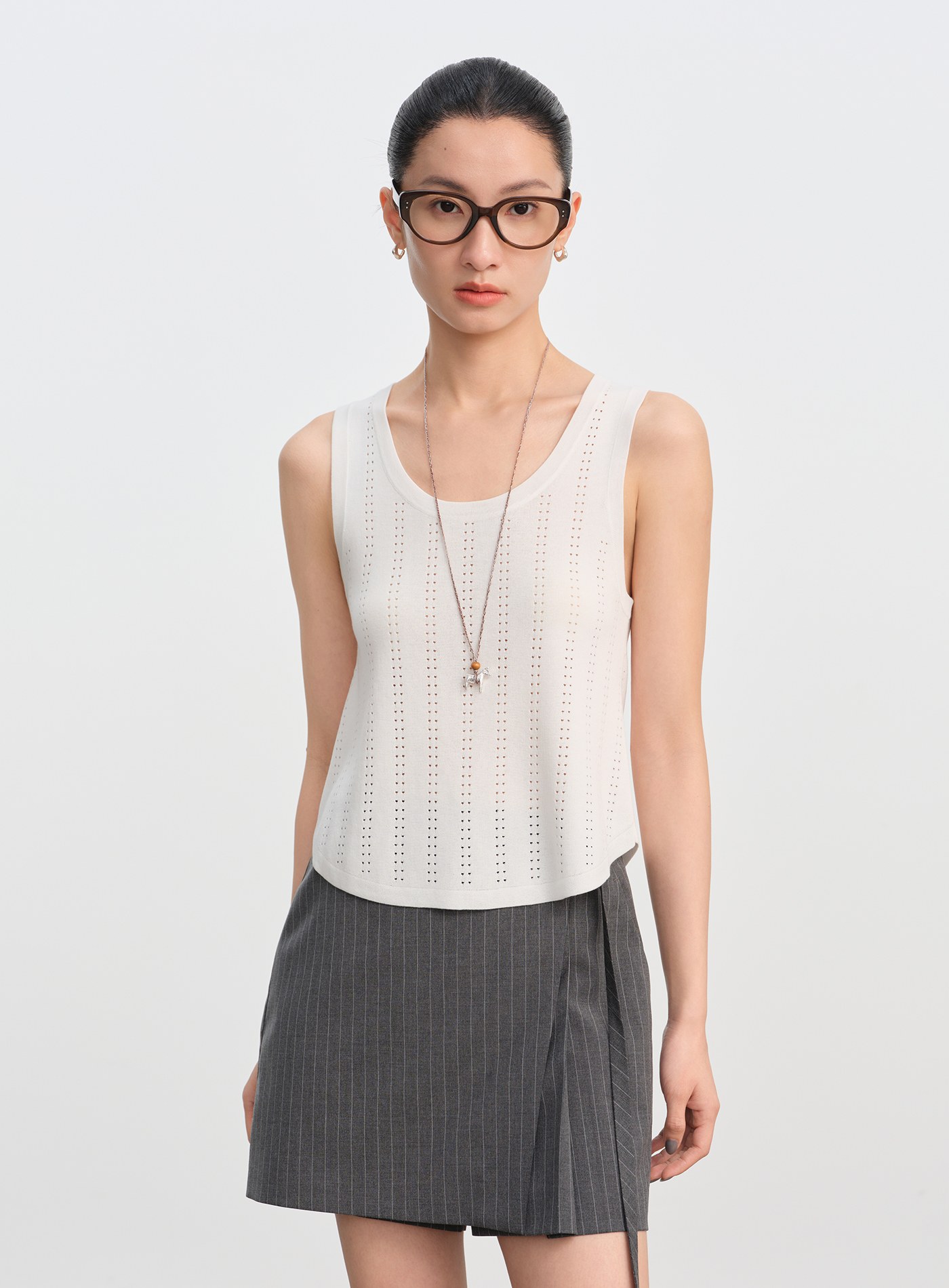 - 直條點狀鏤空工藝沿身形縱向延展,提升透氣度的同時,也為純色單品注入精緻層次