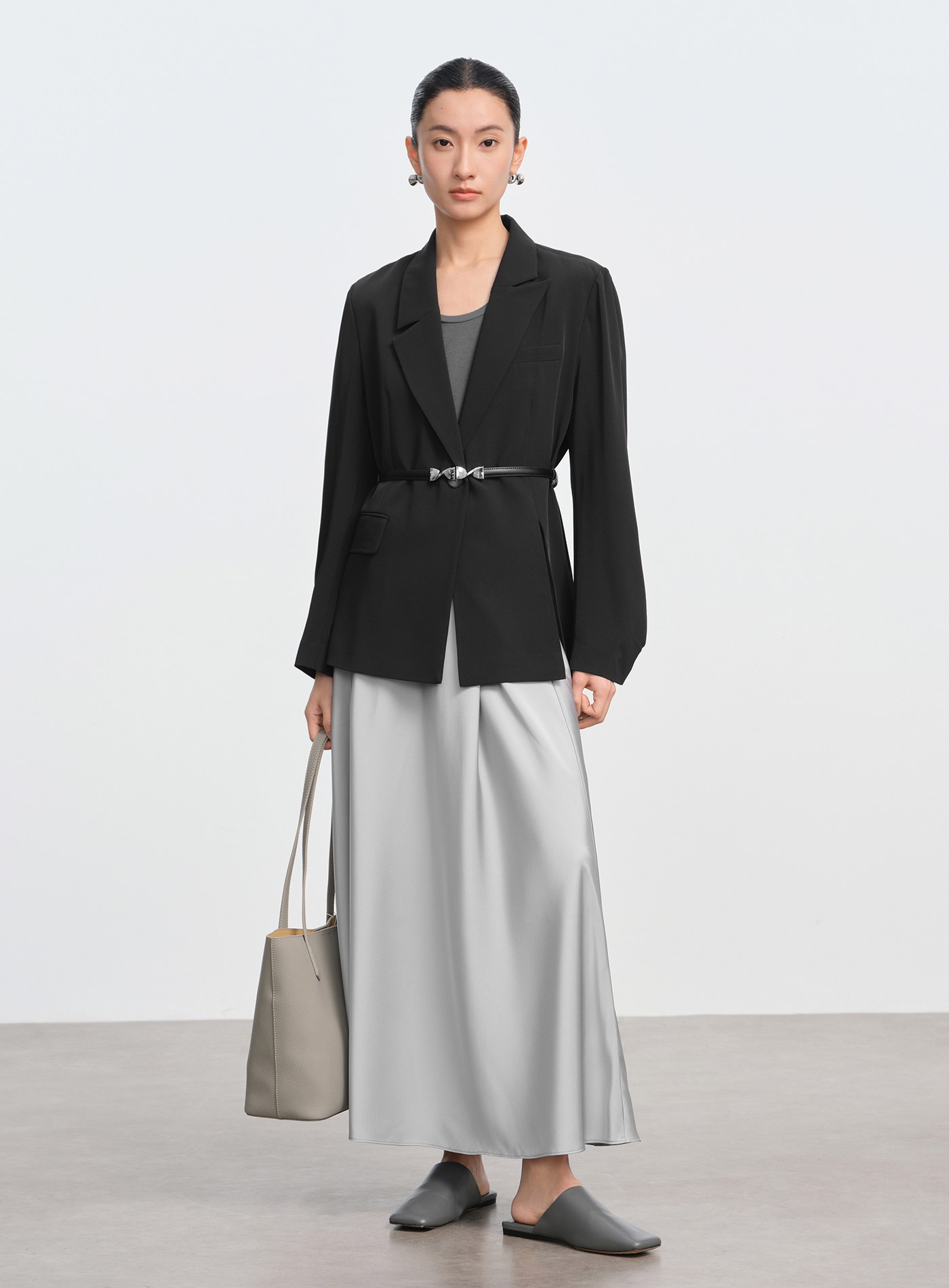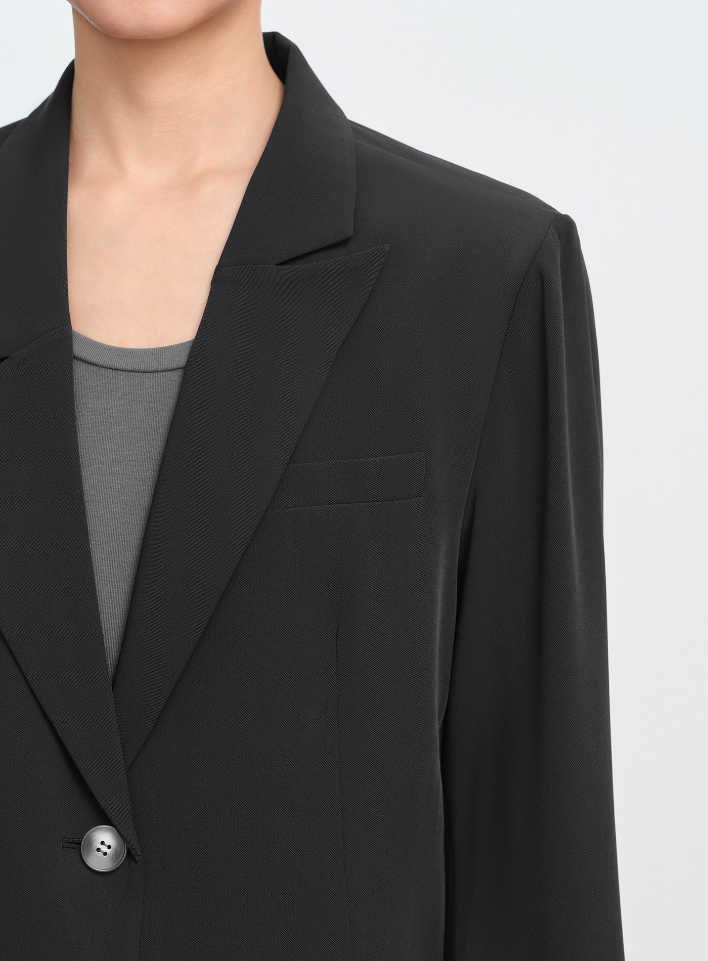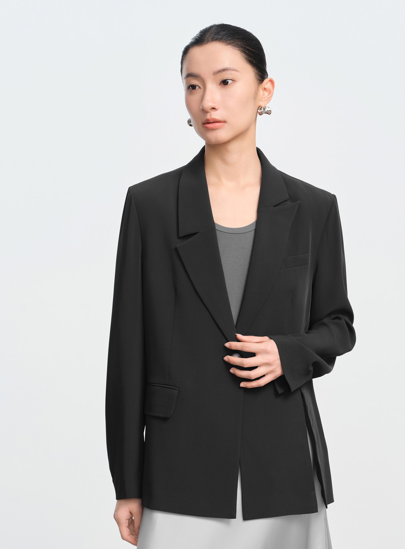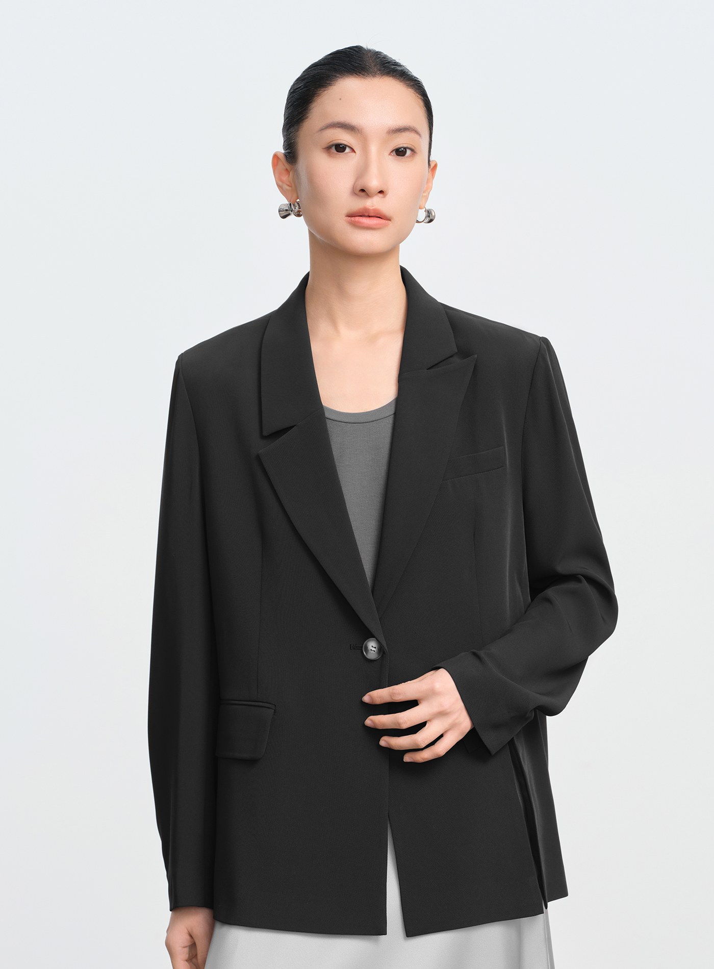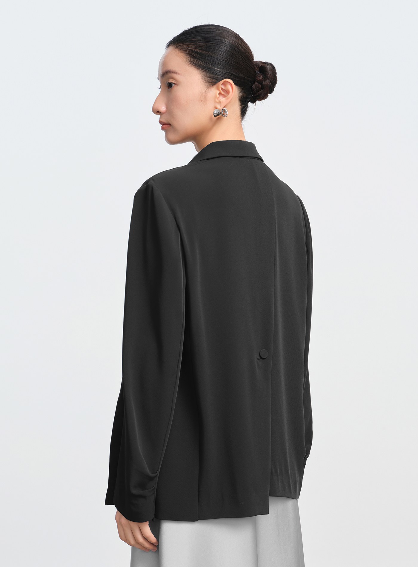 - 袖口採打褶微抛量袖型,正式中營造自然慵懶氛圍