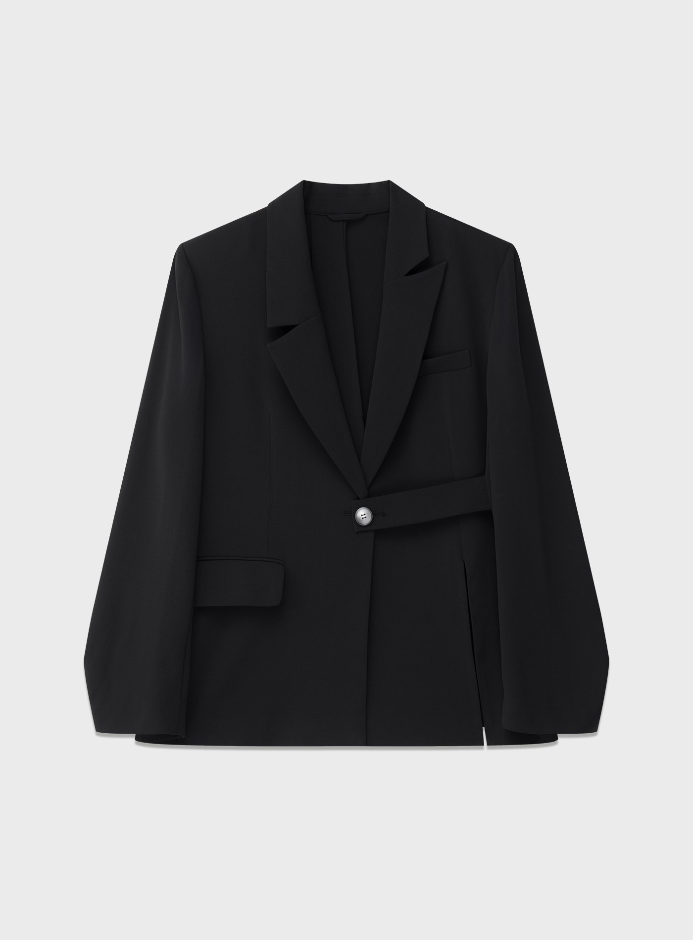 - 以不對稱門襟結合單側扣袢帶設計,極簡中帶出巧妙細節,呈現休閒時髦感