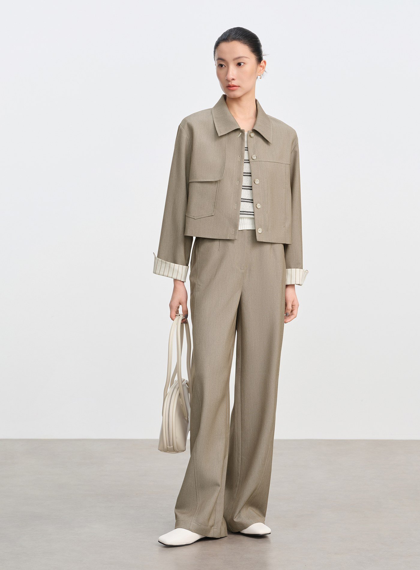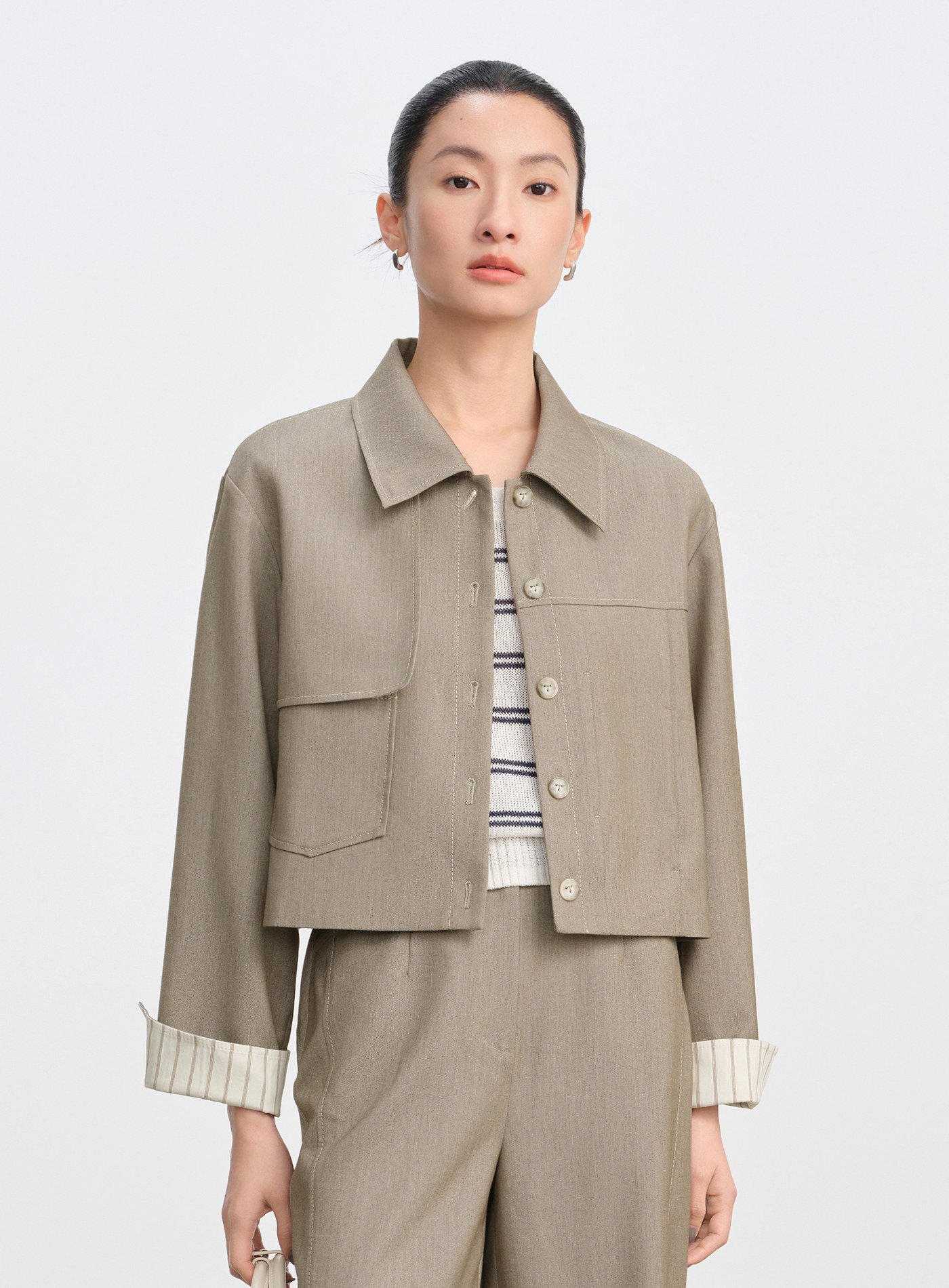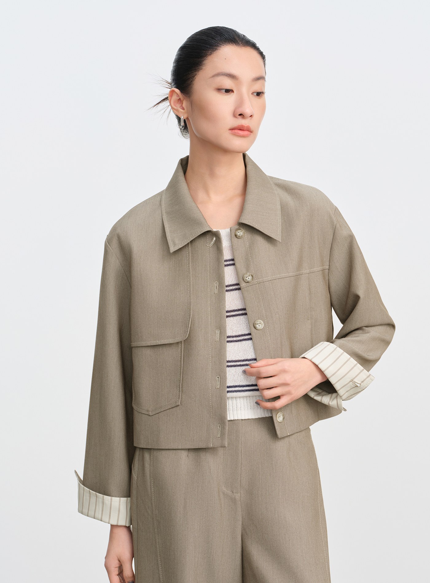 - 短款落肩剪裁與可翻袖口設計,優化身形比例,柔化肩線,慵懶中帶俐落感