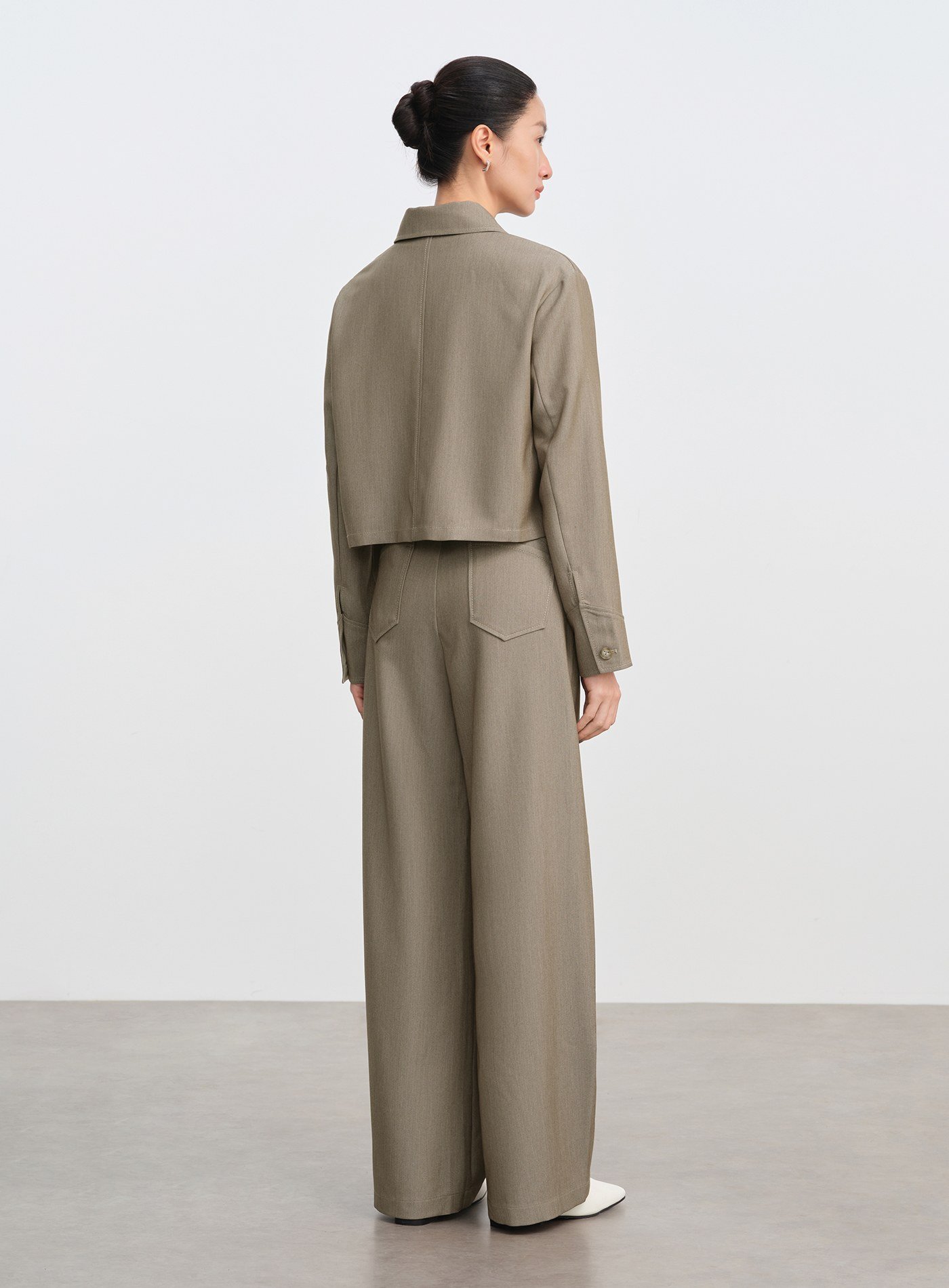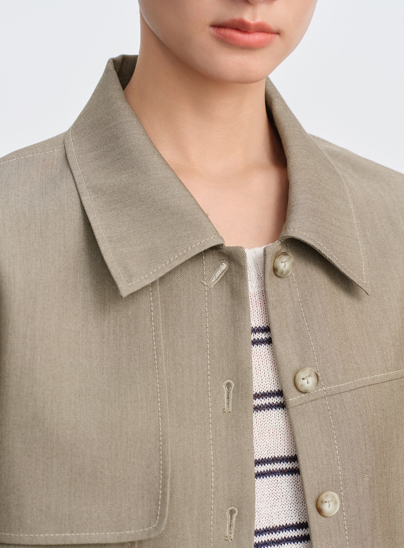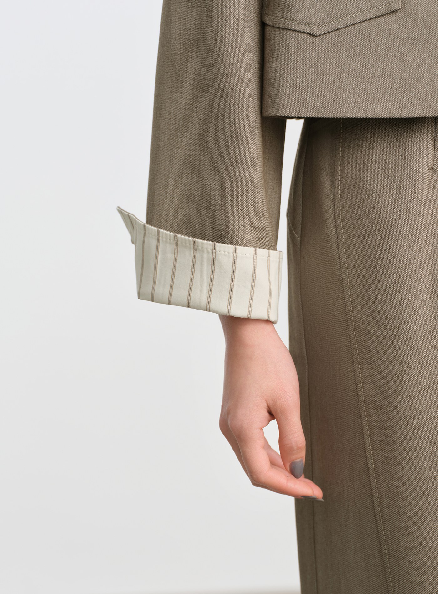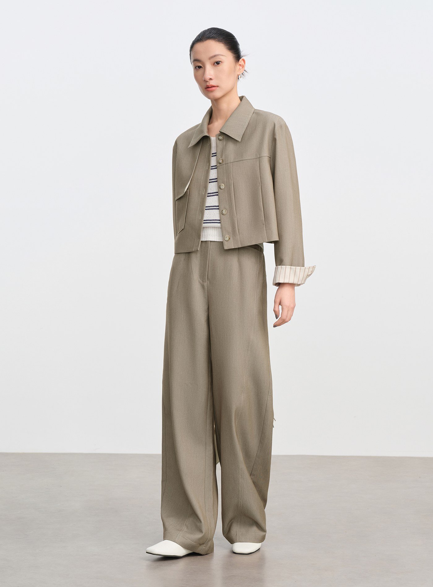 - 短款落肩剪裁與可翻袖口設計,優化身形比例,柔化肩線,慵懶中帶俐落感
